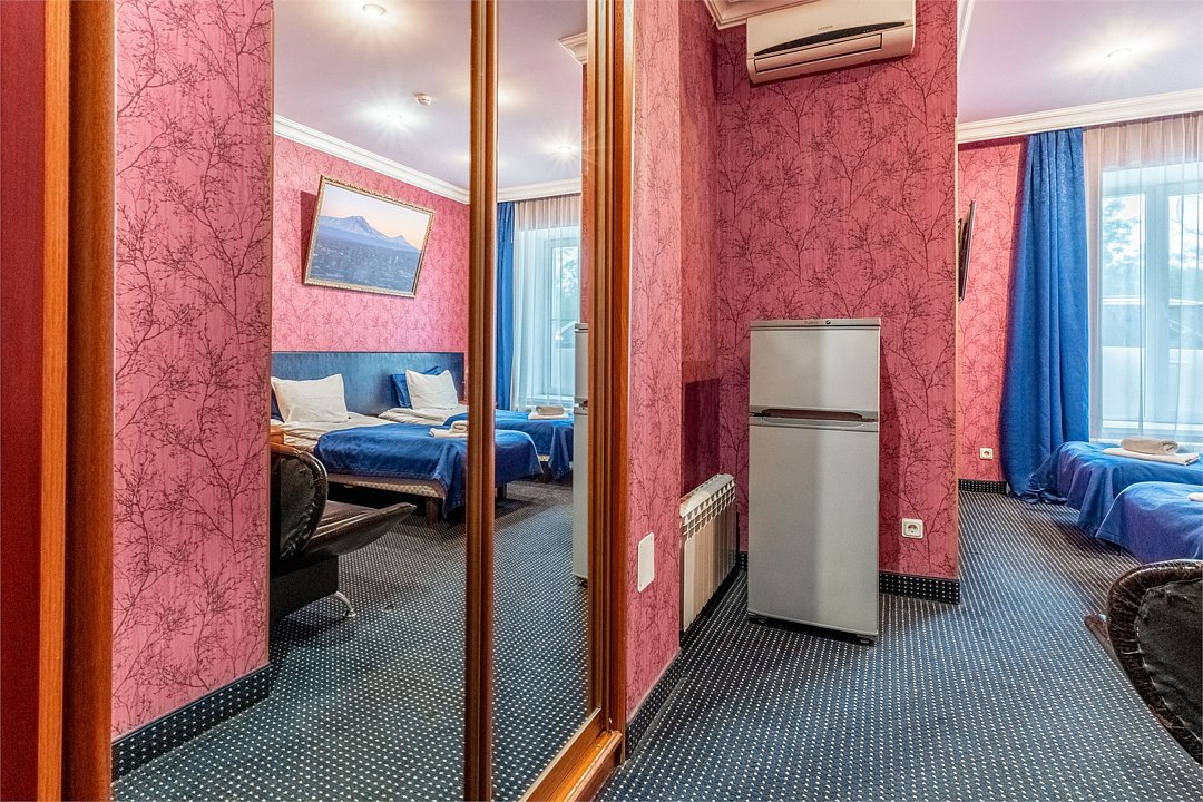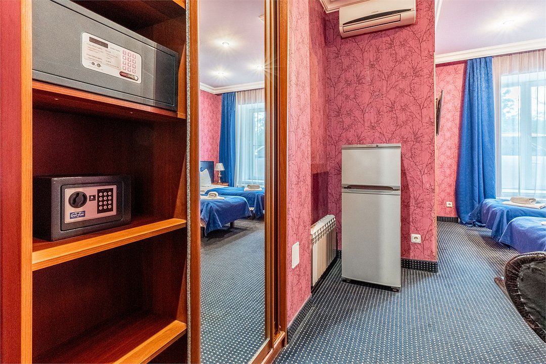 телевизор, кабельное телевидение, Wi-Fi, интернет, холодильник, кондиционер, кулер, фен, будильник, микроволновая печь, утюг, душевая кабина, тапочки, гигиенические средства, двуспальная кровать, две односпальные кровати, тумбы, стулья, шкаф для одежды, гардеробная, вешалки, журнальный столик, письменный стол, зеркало, ковер, набор посуды, сейф, стиральная машина, питьевая вода, гостиная зона, отопление, душ, кулер на этаже, столовые приборы, стол, туалетные средства, сушилка для белья, цифровое тв, внутренний телефон, телевизор с плоским экраном, мини-холодильник, вешалки-плечики, бутилированная вода, мыло, затемняющая штора, можно с питомцами, часы-будильникВ гостиничном номере