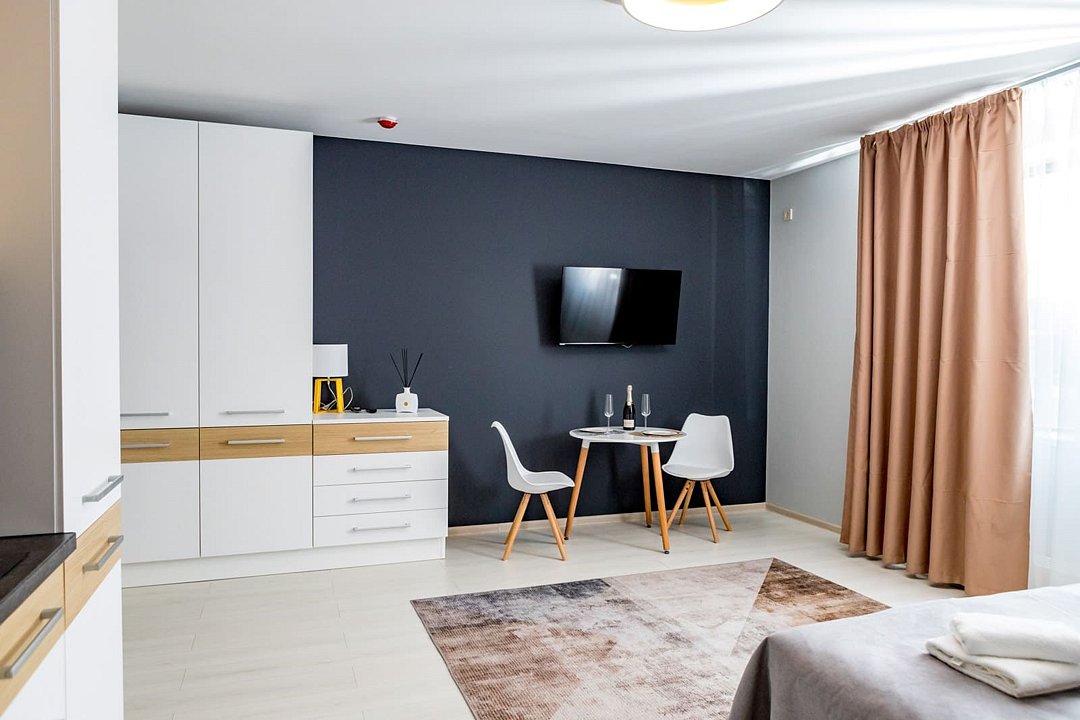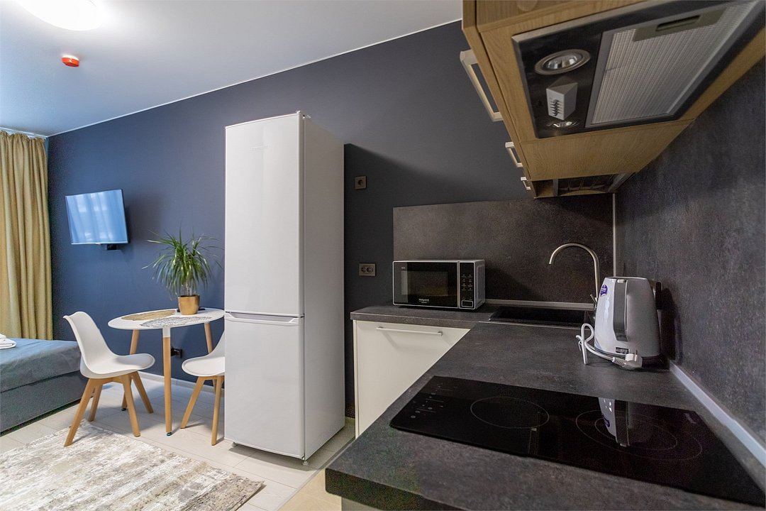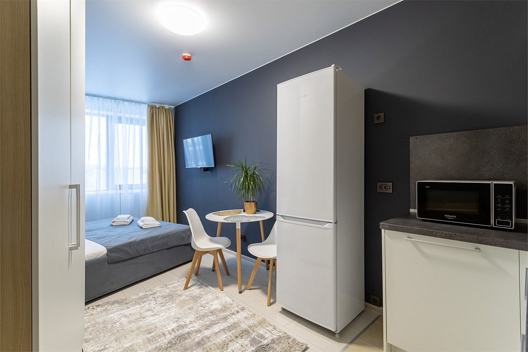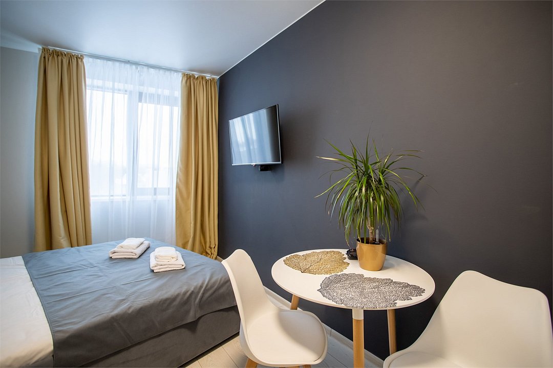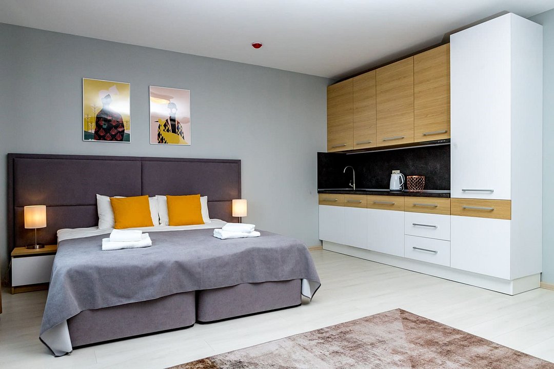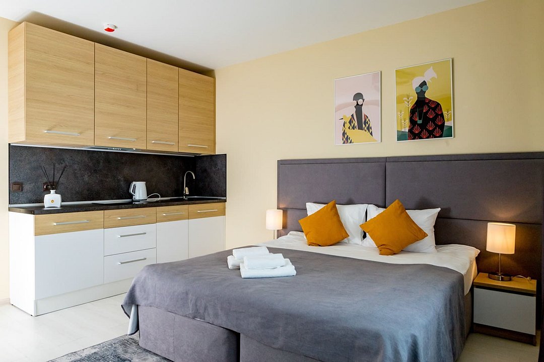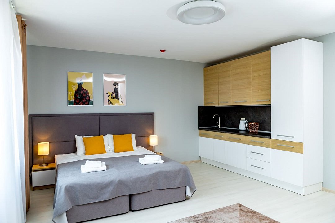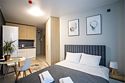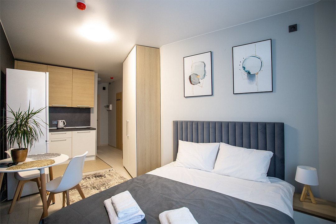 Более просторная уютная студия для 1-2 гостей со всем необходимым для комфортного проживания. Вся комнатная мебель, кровать double или twin (по вашему запросу), кухня в комплектации. Так же для удобства гостей имеются: стиральная машинка, посудомоечная машинка, фен, утюг, гладильная станция, сушилка для одежды. Гигиенические принадлежности в индивидуальной упаковке (шампунь, гель для душа, мыло, зубной набор, тапочки)Услуги и удобства
