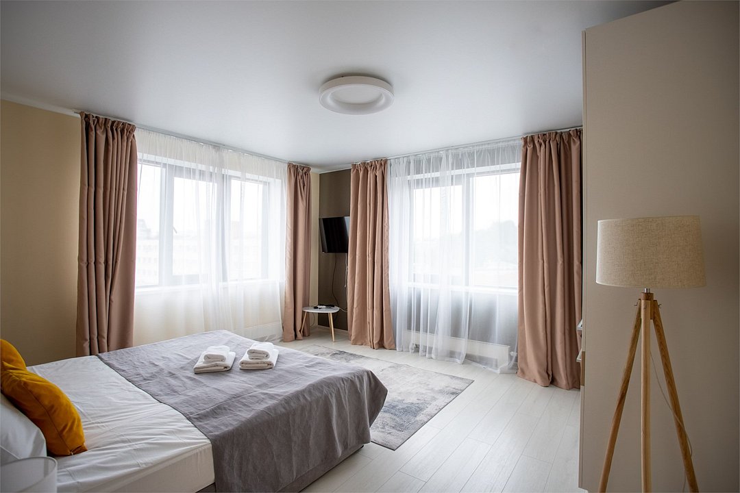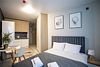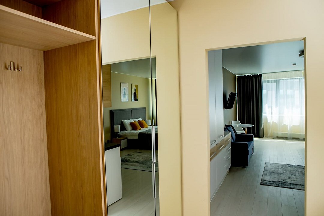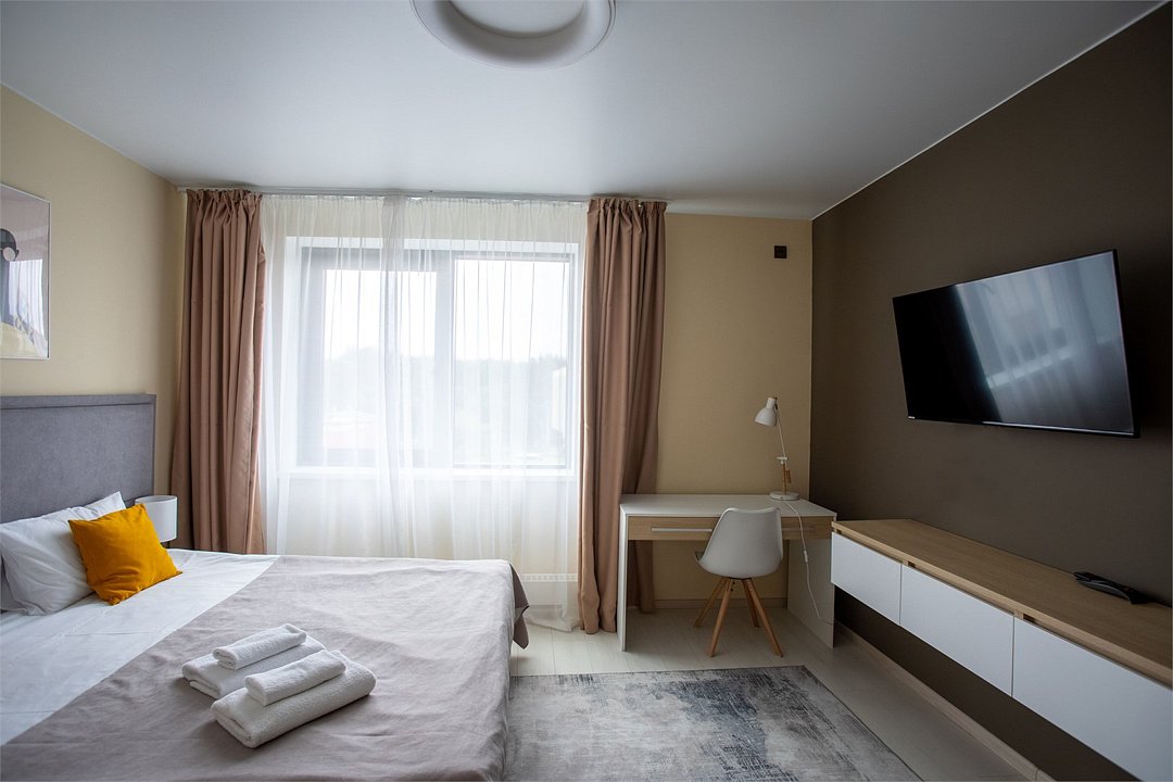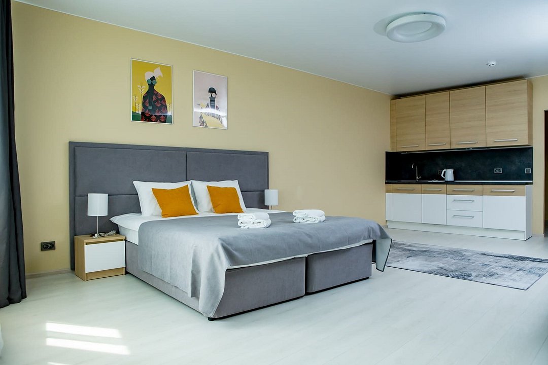 Уютная студия для 1-2 гостей со всем необходимым для комфортного проживания. Вся комнатная мебель, кровать двуспальная или 2 односпальных (по вашему запросу), кухня в комплектации. Так же для удобства гостей имеются: стиральная машинка, посудомоечная машинка, фен, утюг, гладильная станция, сушилка для одежды. Гигиенические принадлежности в индивидуальной упаковке (шампунь, гель для душа, мыло, зубной набор, тапочки)Услуги и удобства