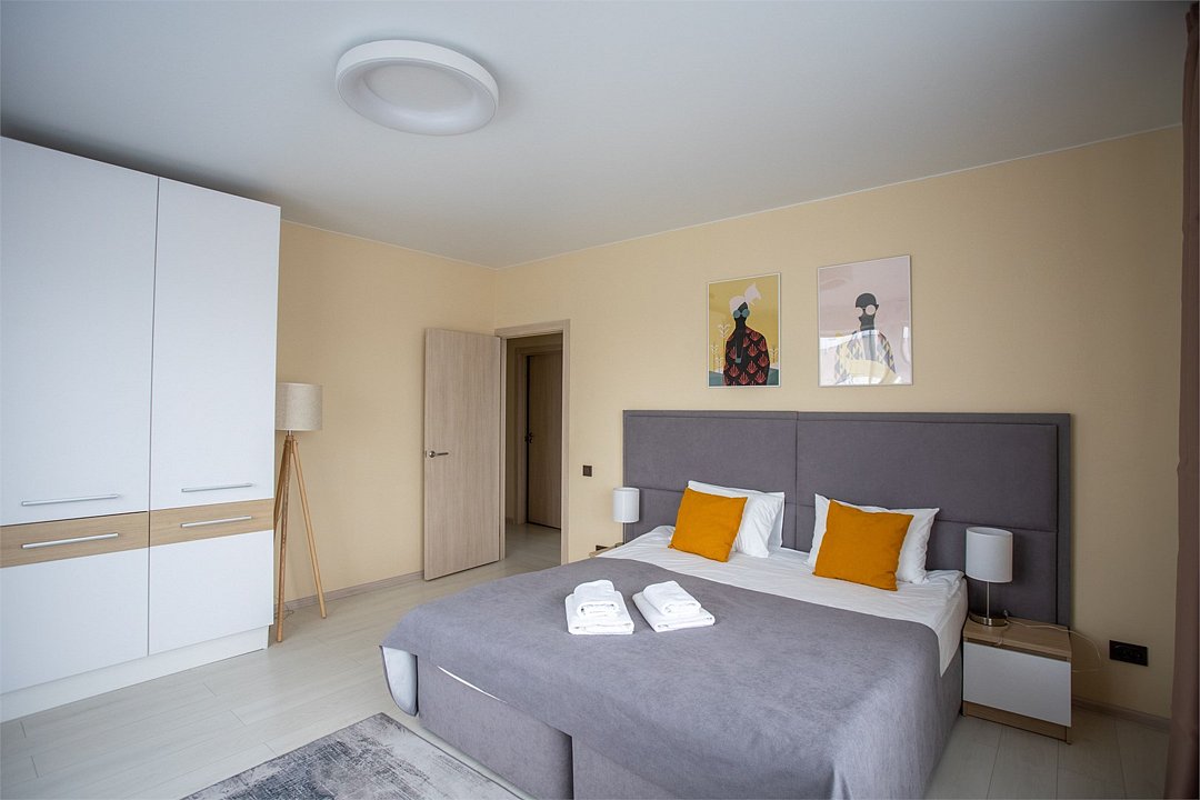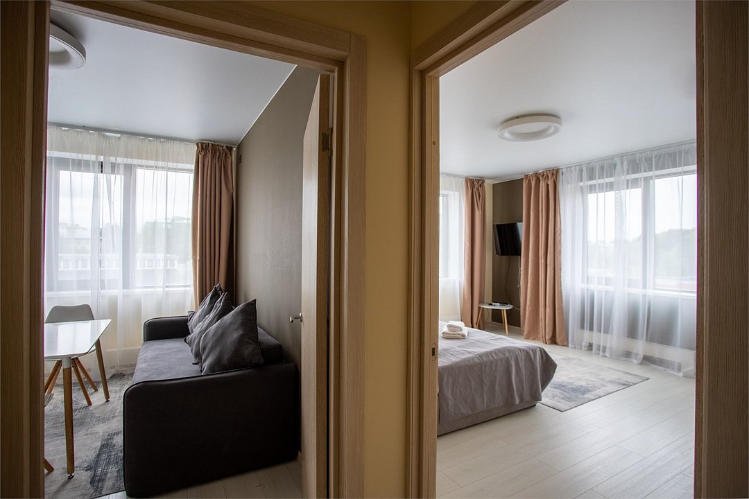 Просторный двухкомнатный апартамент с отдельной кухней для 1-5 гостей со всем необходимым для комфортного проживания. Вся комнатная мебель, кровати двуспальные или односпальные (по вашему запросу) + дополнительное место (диван или евротахта) кухня в комплектации. Так же для удобства гостей имеются: кондиционер, стиральная машинка, посудомоечная машинка, фен, утюг, гладильная станция, сушилка для одежды. Гигиенические принадлежности в индивидуальной упаковке (шампунь, гель для душа, мыло, зубной набор, тапочки)Услуги и удобства