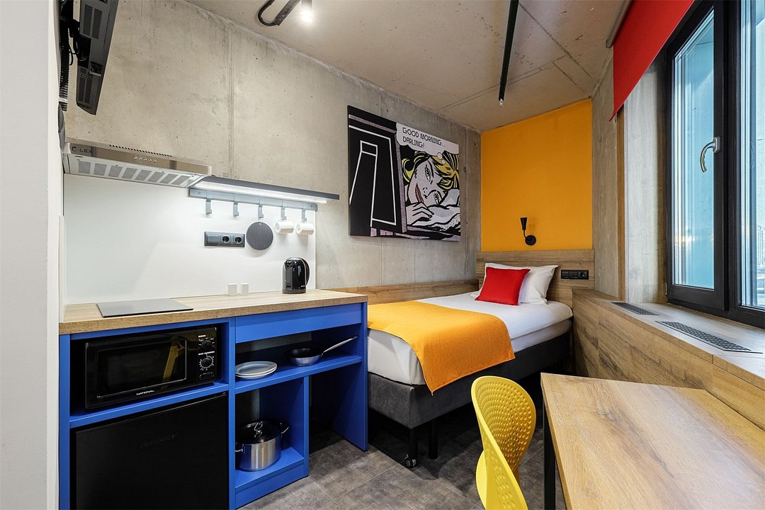 Wi-Fi, кондиционер, светильник, настольные лампы, фен, электронные замки, плита для приготовления пищи, кофемашина, микроволновая печь, душевая кабина, банные полотенца, тапочки, односпальная кровать, вешалки, зеркало, чайный набор, набор посуды, обслуживание номеров, сейф, чайник, унитаз, раковина, вид на город, вид во двор, кухонная посуда, стаканы, кухонная утварь, столовые приборы, стул, стол, телевизор с плоским экраном, мини-холодильник, мини-кухня, телевизор со Smart TV, система умный дом, бутилированная вода, можно с питомцамиВ номере