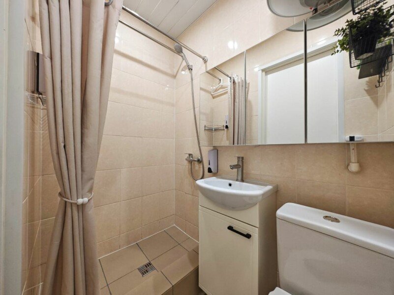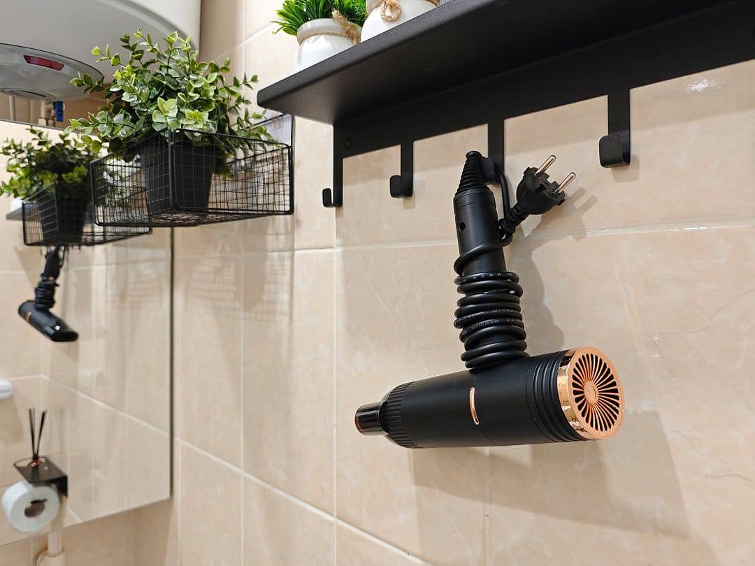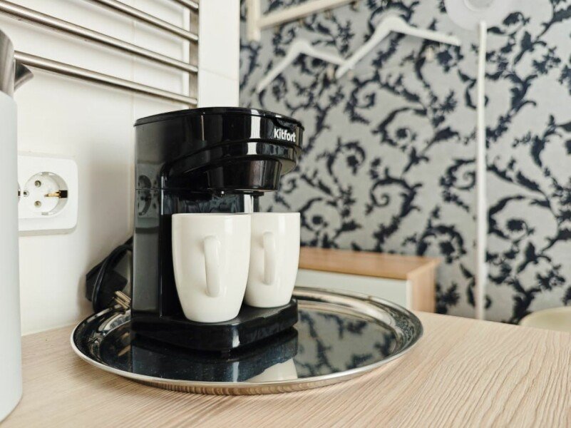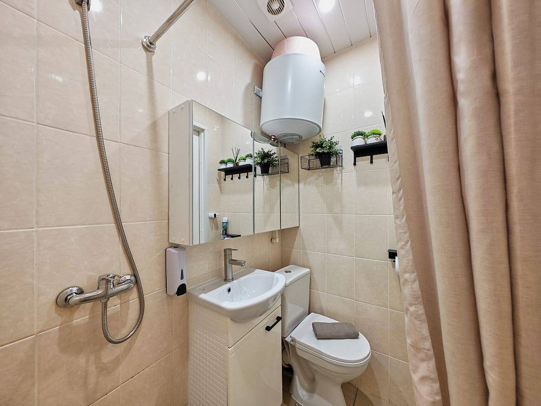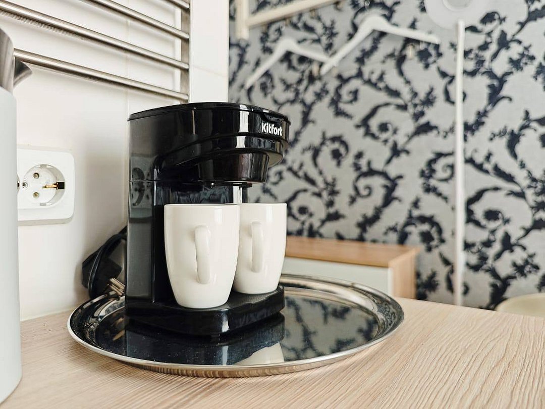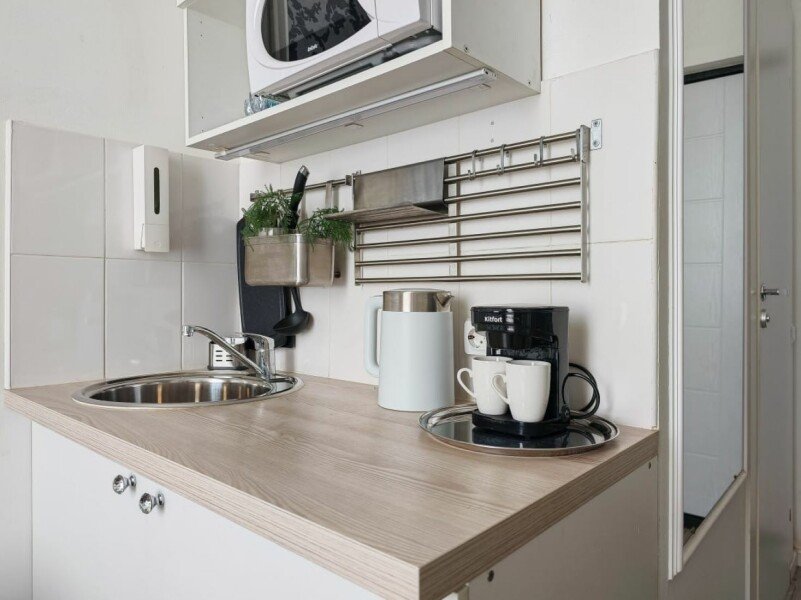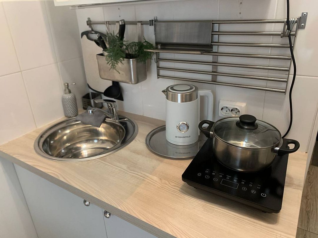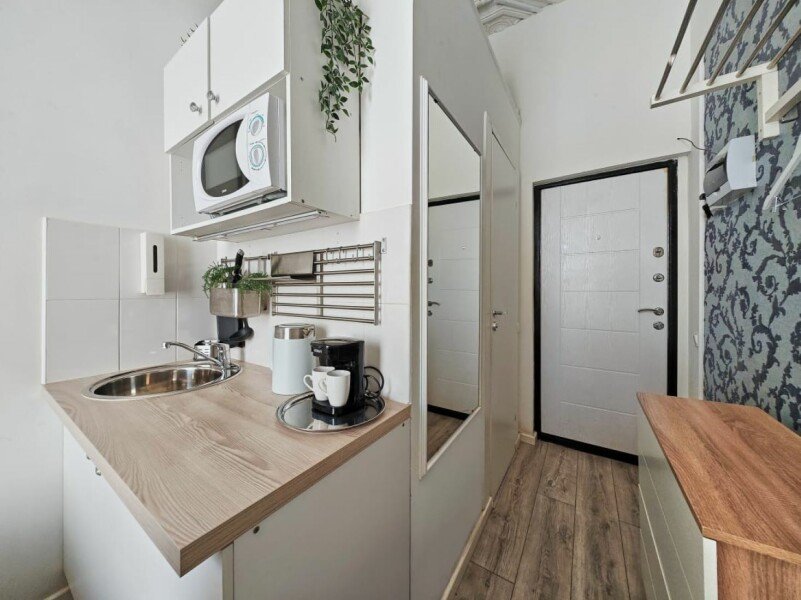 В студии есть свои мини-кухня и ванная комната. Стиральная машинка в хозяйственном помещении.