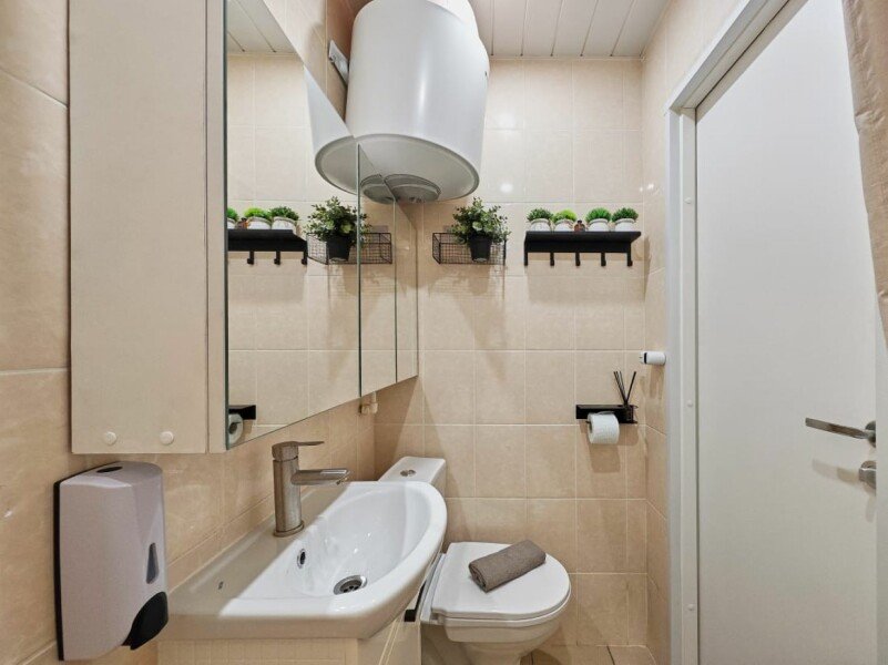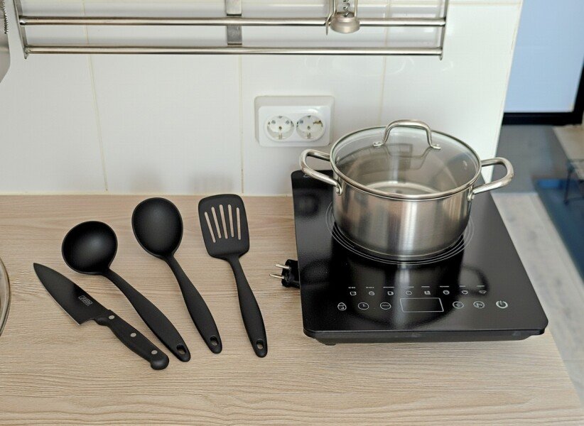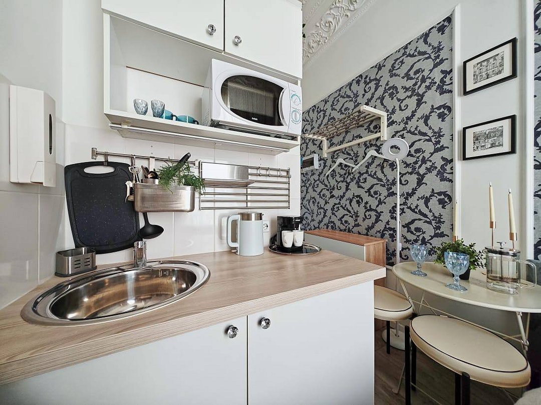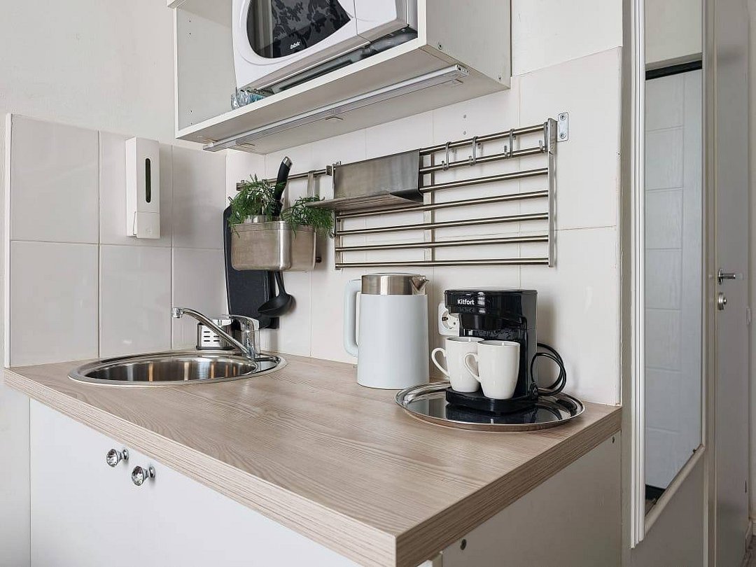 Светлая студия оборудована всем необходимым для комфортного пребывания и включает кухонную зону, оснащенную бытовой техникой и набором посуды, удобные спальные места и рабочее место, телевизор и Wi-Fi, современный санузел с душем.