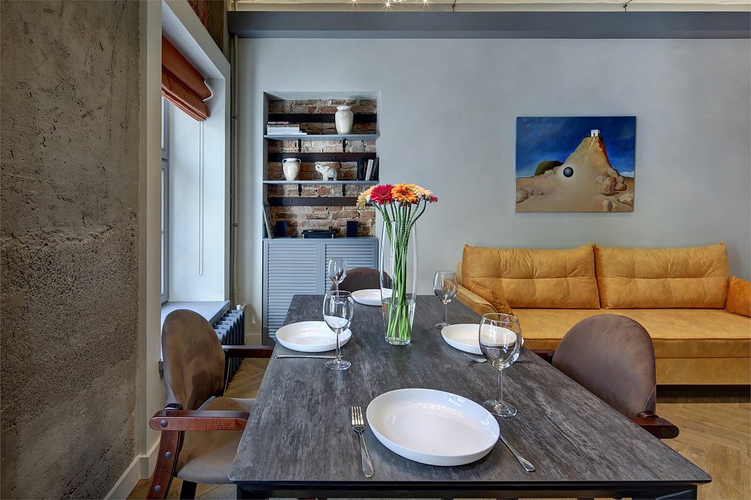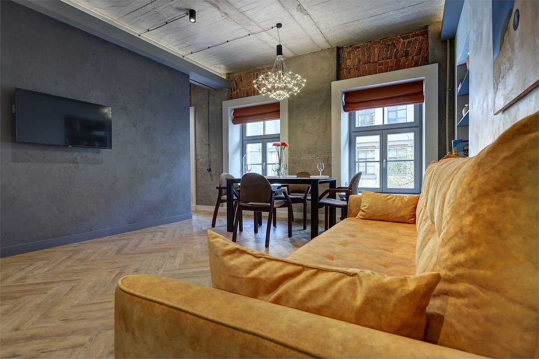 Мы рады предложить просторные квартиры-апартаменты площадью 49 кв.м. с прекрасных оформлением и отличной планировкой, рассчитанные на проживание до 4 гостей включительно. Теплая цветовая гамма интерьера в сочетании с элементами Loft, уникальная комплектация и дизайнерская мебель передают особенную атмосферу современного и классического Санкт-Петербурга. Приятным акцентом для Вас станет оригинальное и продуманное освещение. Апартаменты включают в себя: - стильную гостиную с мягкой мебелью и смарт-ТВ; - оборудованную кухню с плитой и столовую зону; - уютную спальню с комфортной кроватью и высококачественными постельными принадлежностями, дополнительное место на удобном диване; - просторную ванную комнату с душем. Важно! При заселении вносится оплата за весь срок проживания и страховой залог - 5000 руб. Страховой залог возвращается в течении 2 (двух) суток после выезда на указанные Вами реквизиты (залог не возвращается в случае нарушения договора аренды и правил проживания).Услуги и удобства