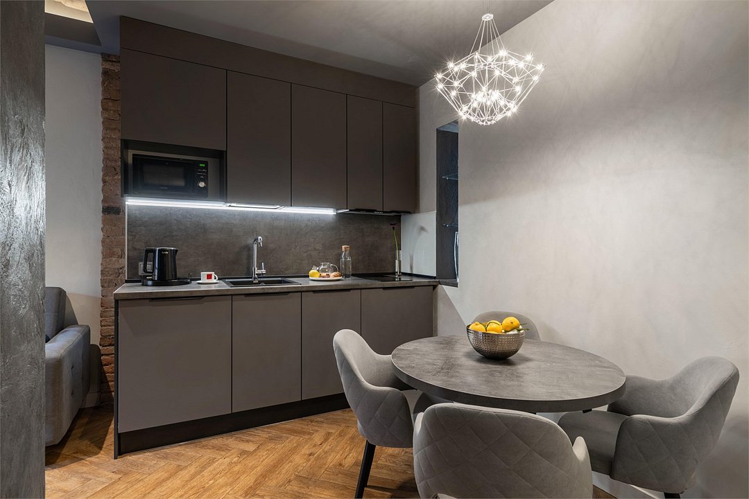 кабельное телевидение, Wi-Fi, светильник, фен, электронные замки, плита для приготовления пищи, микроволновая печь, утюг, банные полотенца, две односпальные или большая двуспальная кровать, гладильная доска, ортопедический матрас, стулья, шкаф для одежды, вешалки, журнальный столик, обеденный стол, зеркало, две комнаты, кухня, чайный набор, набор посуды, посудомоечная машина, чайник, унитаз, раковина, обеденная зона, отопление, душ, вид на город, плиточное покрытие, ламинат, высокие потолки, кухонная посуда, стаканы, кухонная утварь, столовые приборы, стол, туалетные средства, диван-кровать, раскладной диван, мини-холодильник, телевизор со Smart TV, номер для некурящих, гигиенический душВ гостиничном номере
