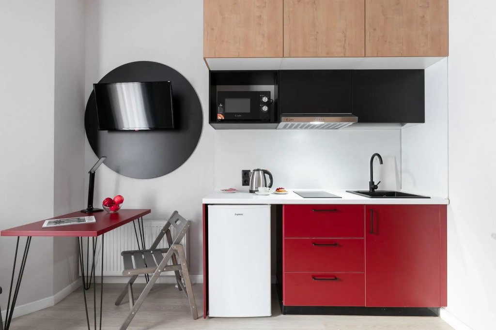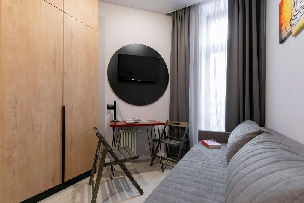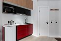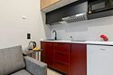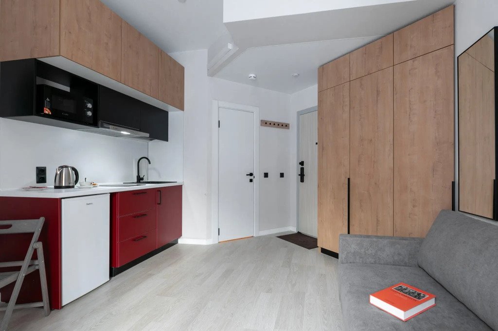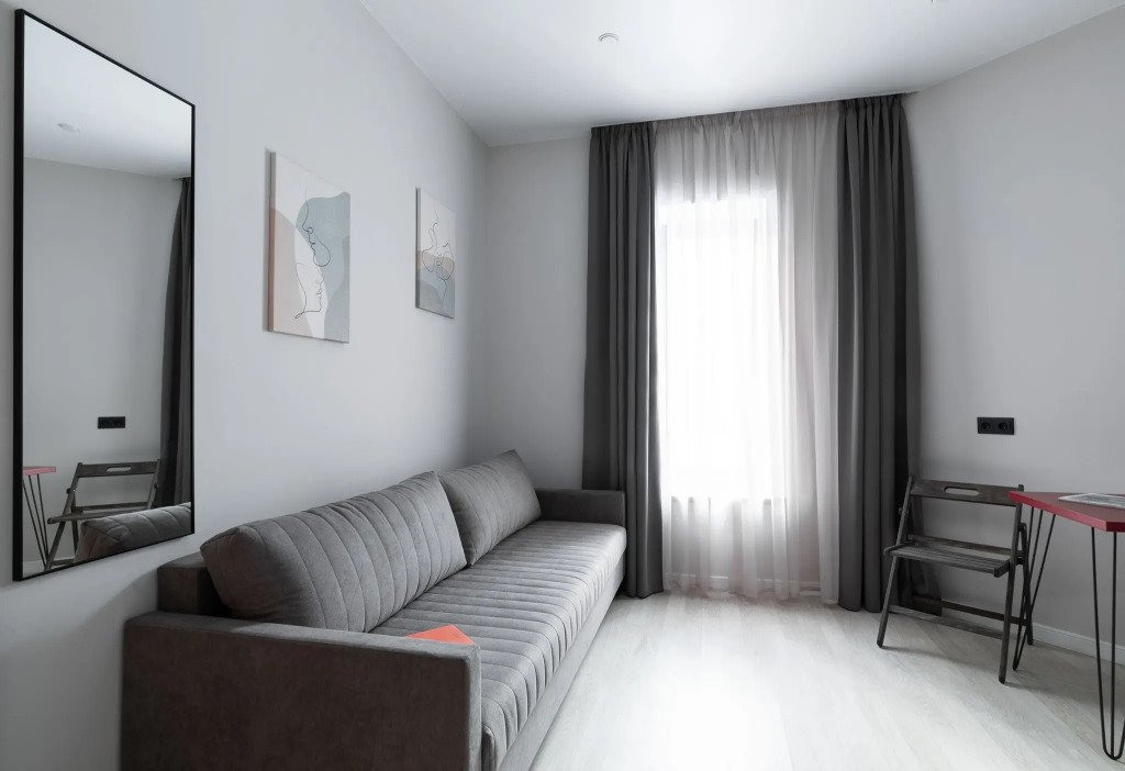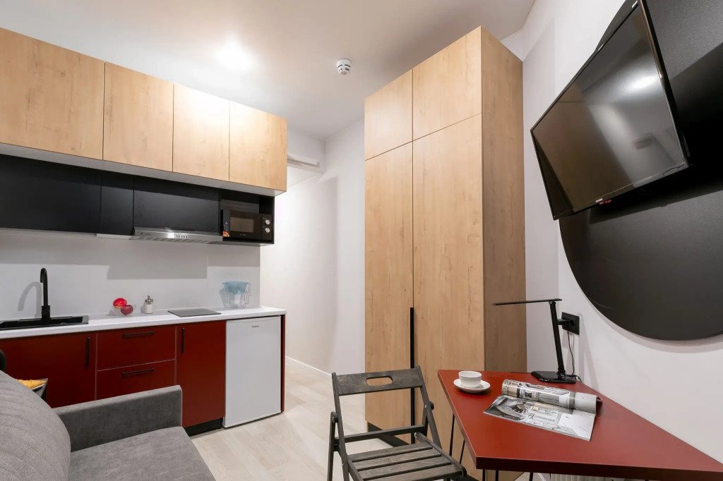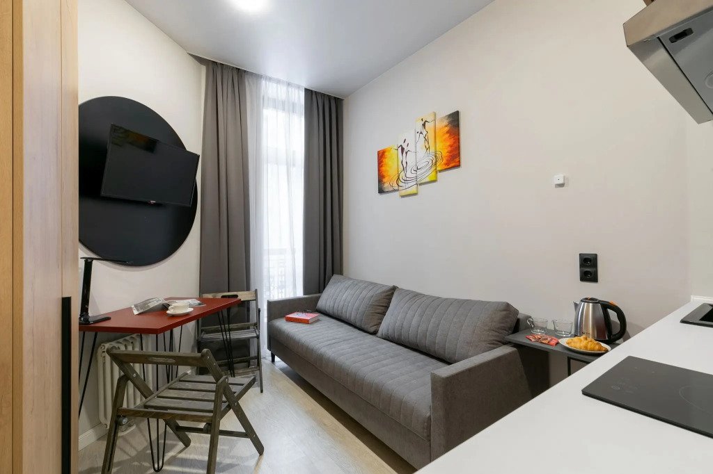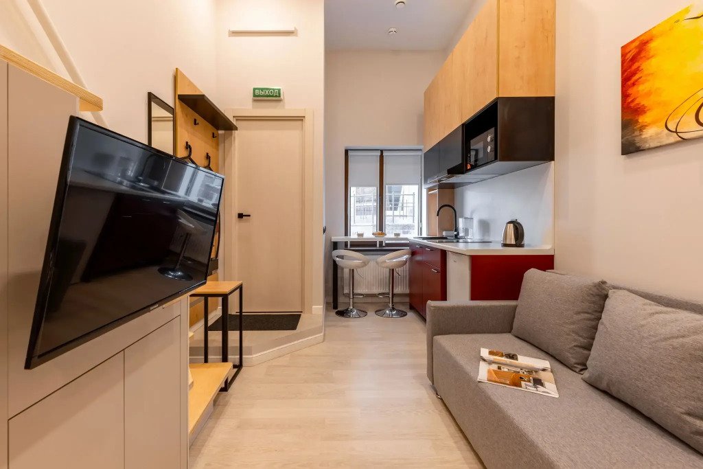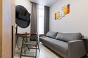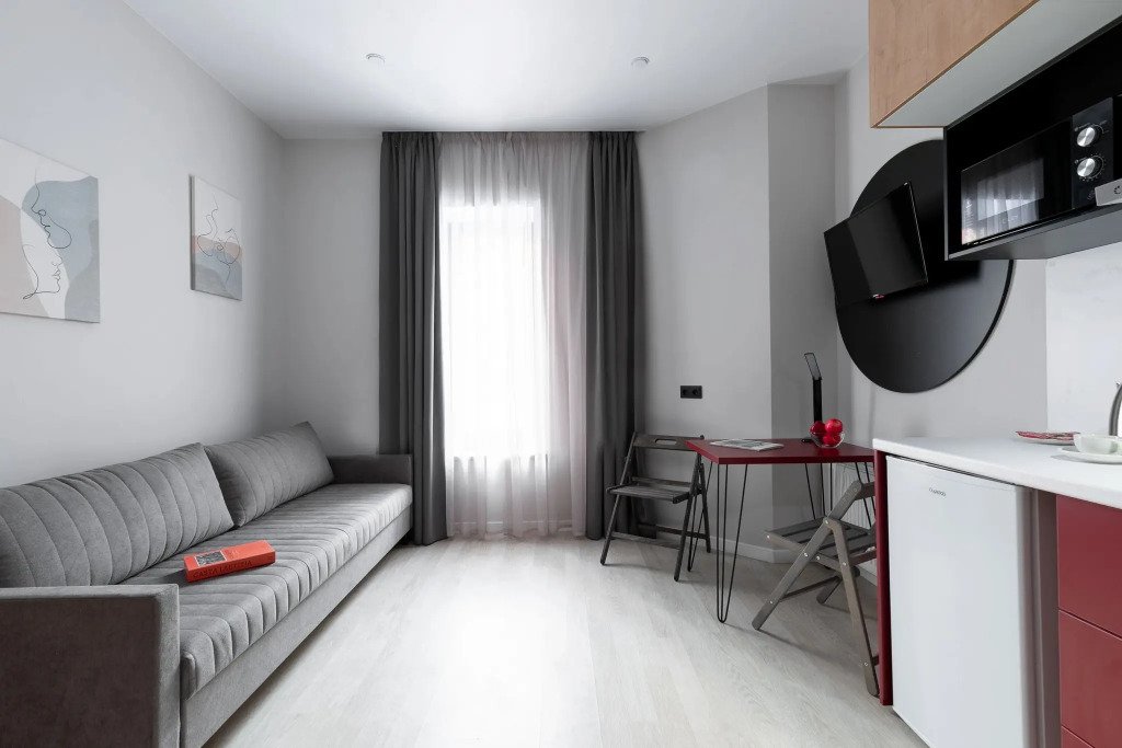 Номер оснащён необходимым как для временного отдыха, так и для полноценного проживания. В качестве основного спального места в номерах используются диваны-кровати. Багаж можно разместить в шкафу и на рабочем столе. Номера оборудованы кухонными зонами, включая электрическую варочную панель.