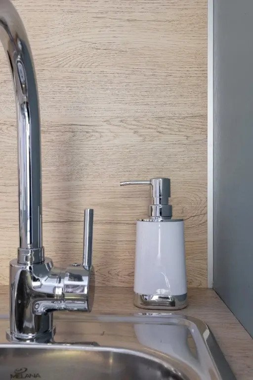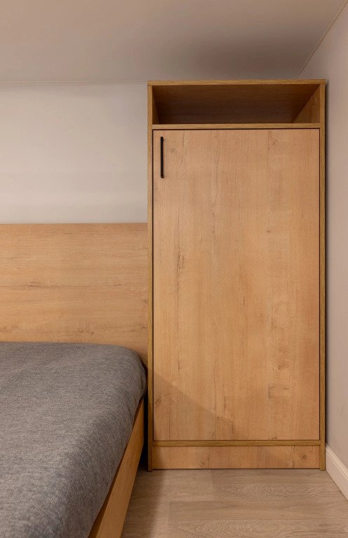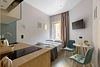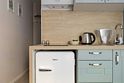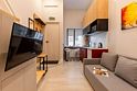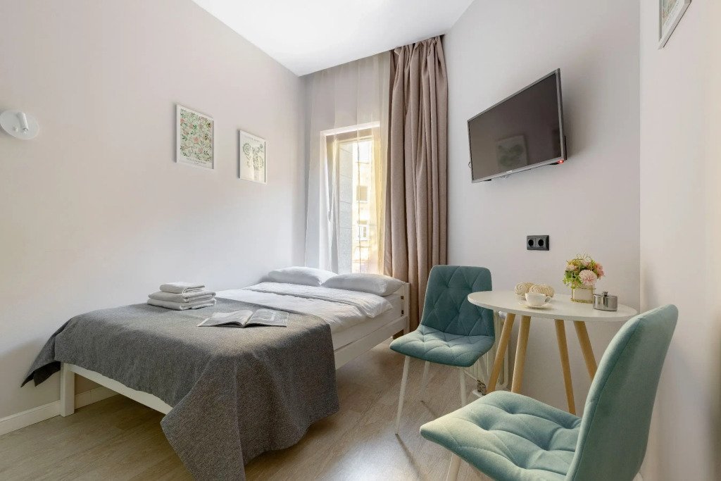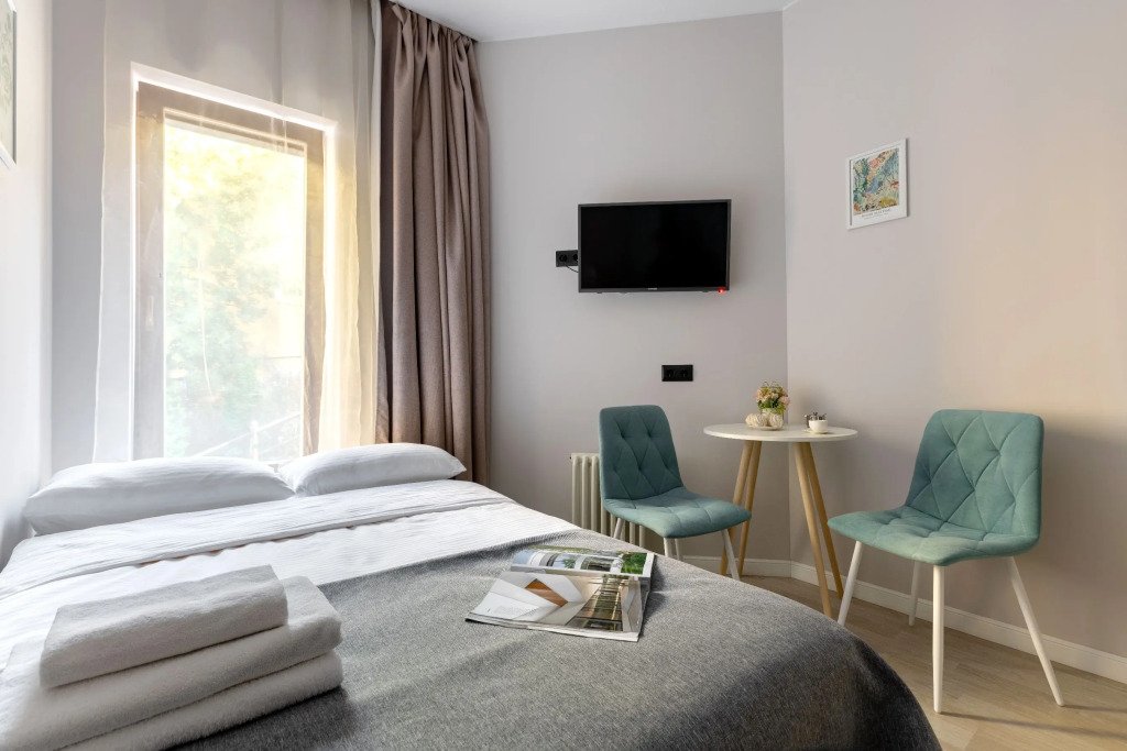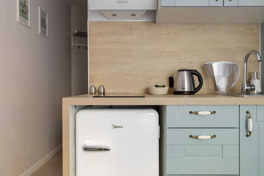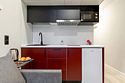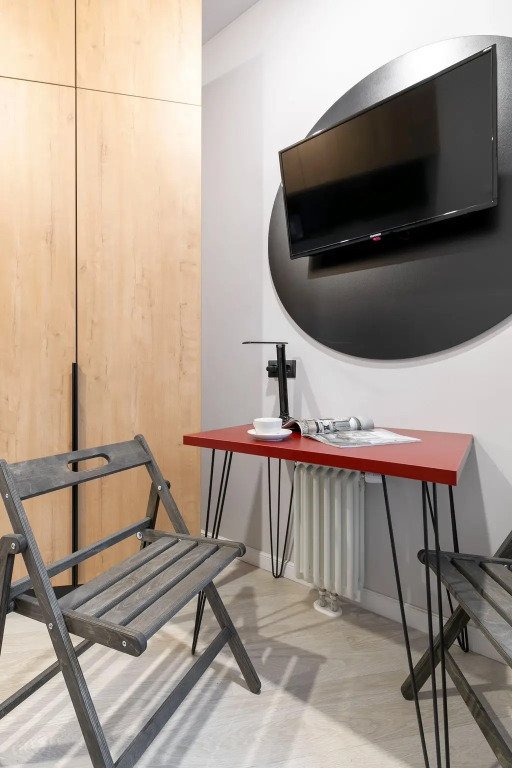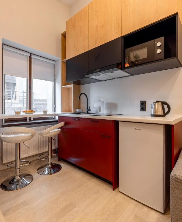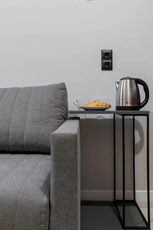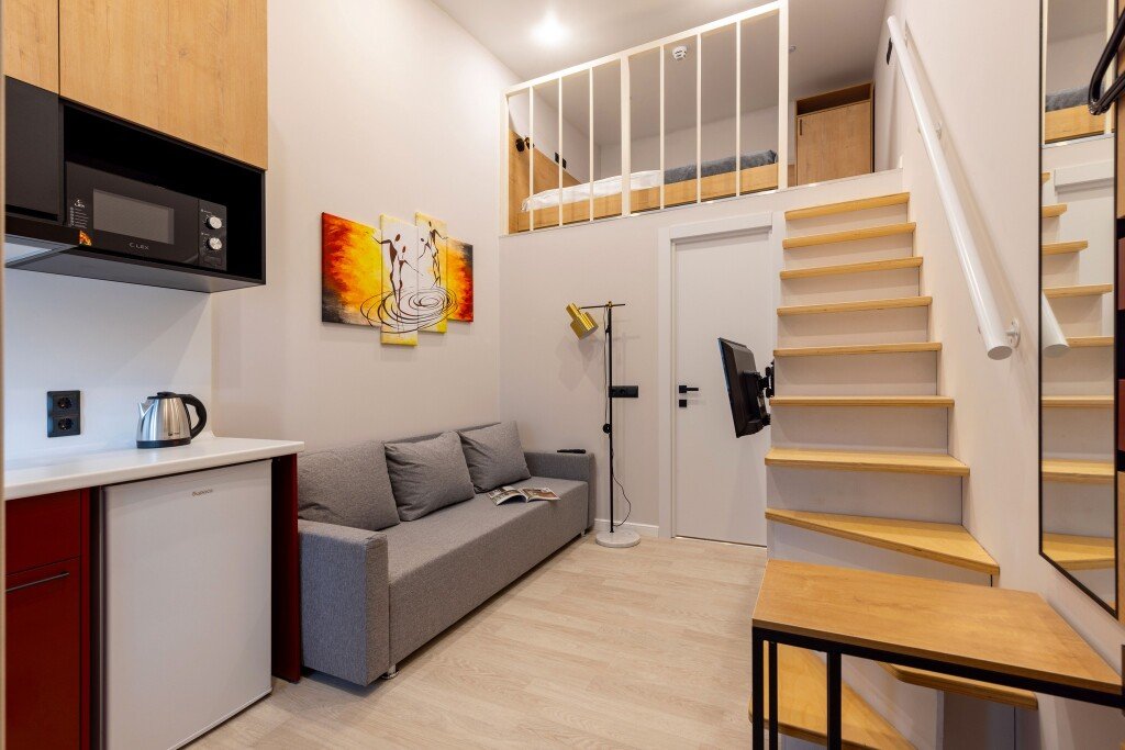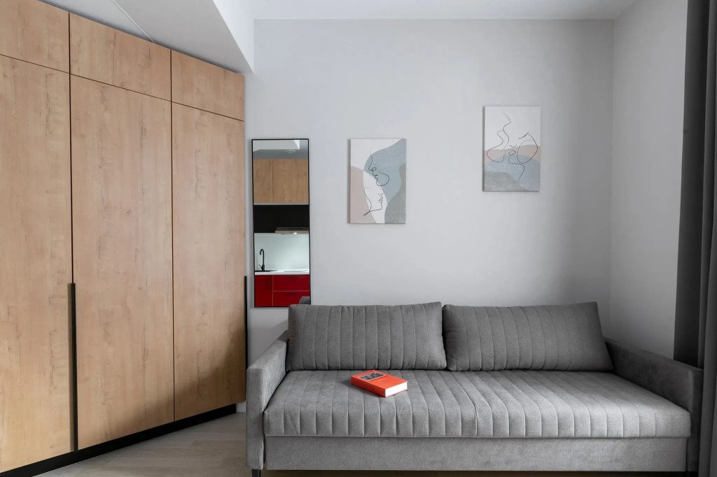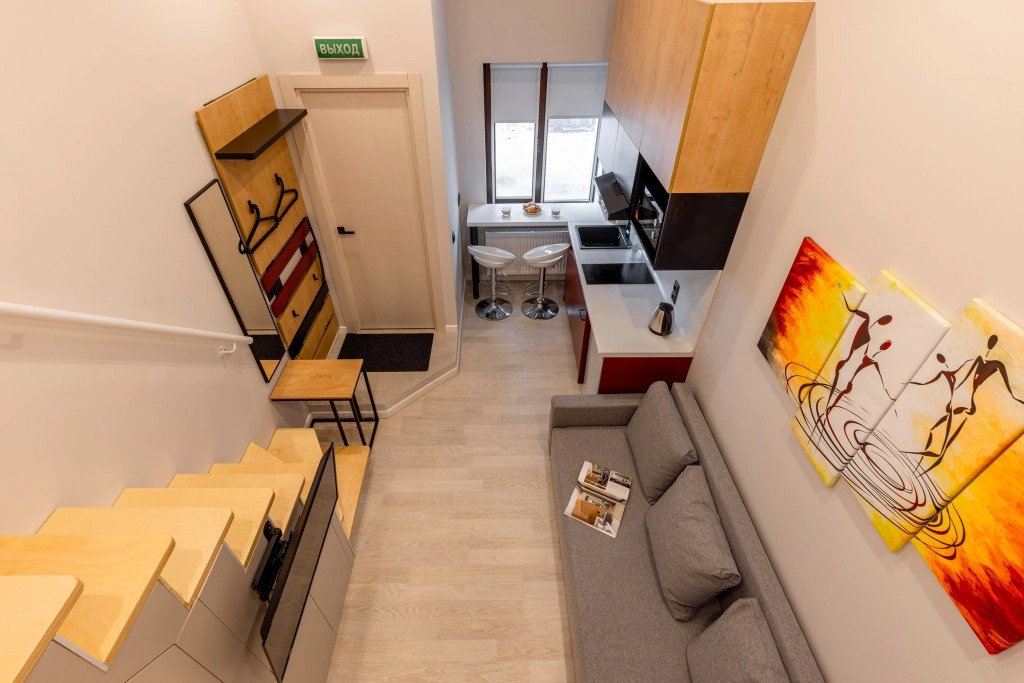 Номер оснащён необходимым как для временного отдыха, так и для полноценного проживания. В качестве основного спального места в номерах используются диваны-кровати. Багаж можно разместить в шкафу и на рабочем столе. Номера оборудованы кухонными зонами, включая электрическую варочную панель.
