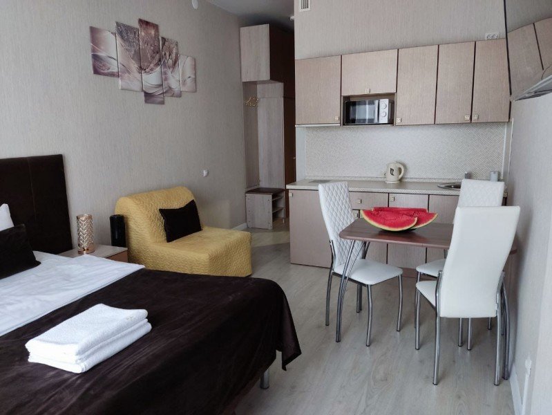 Студия — Апартаменты расположена в апарт-комплексе «САЛЮТ», 28 м.кв. на одном (17) этаже. Новые, чистые, светлые, комфортные, уютные апартаменты полностью оснащены всем необходимым для комфортного проживания.