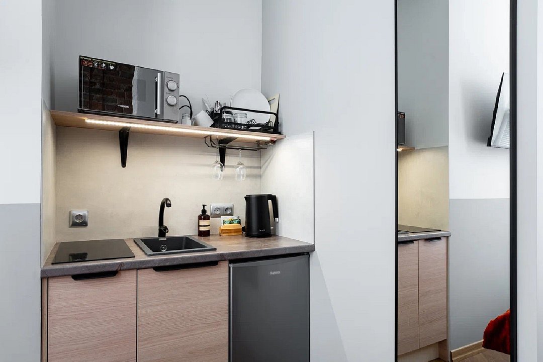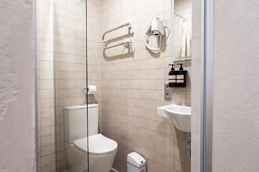 душевая кабина, косметические средства, кровать «King size», унитаз, вид во двор, без питомцевВ аппартаментах