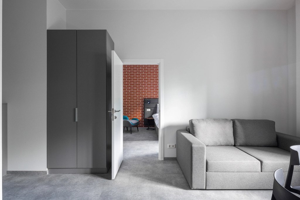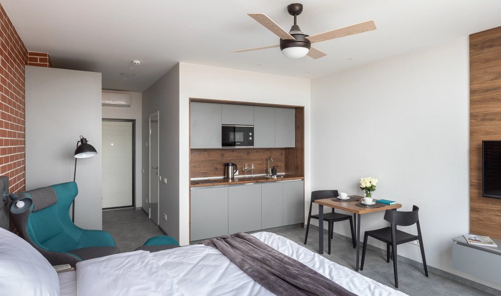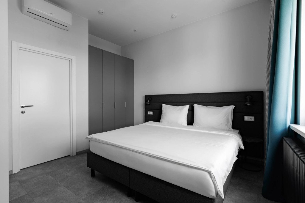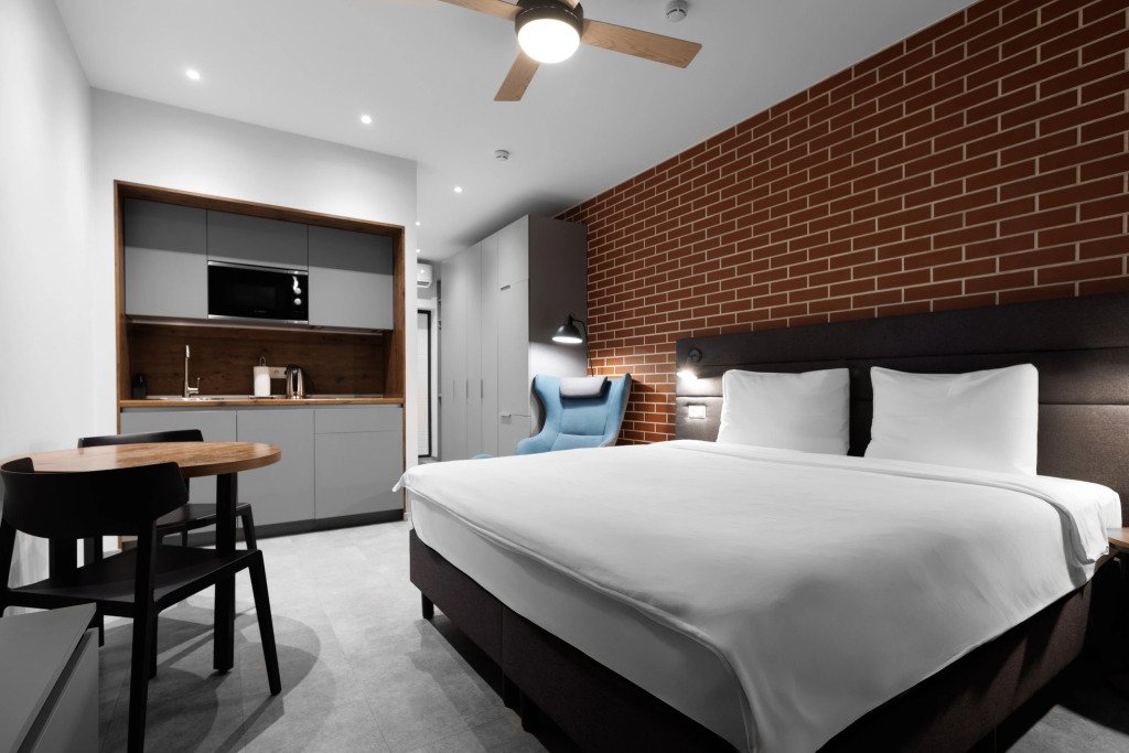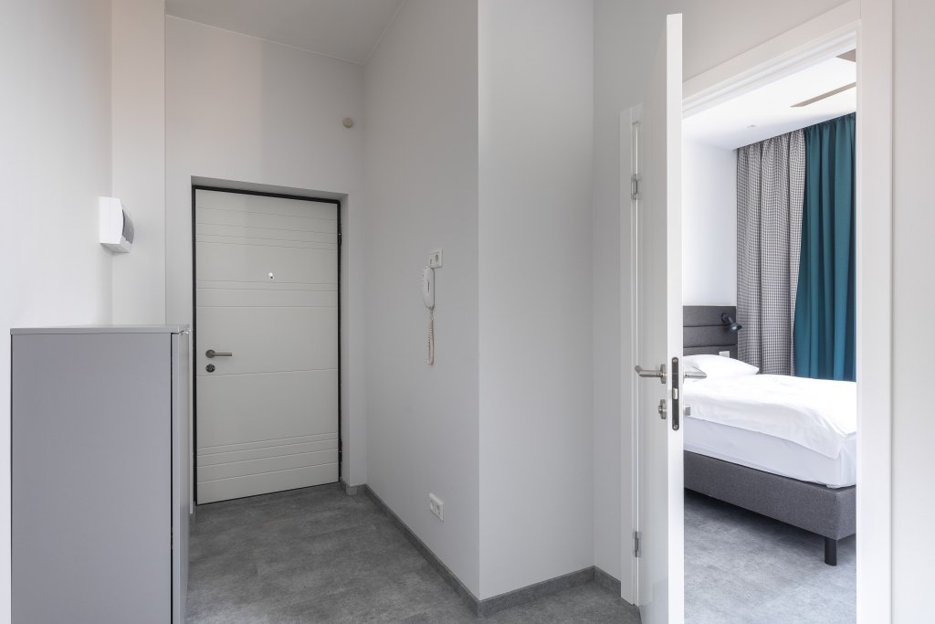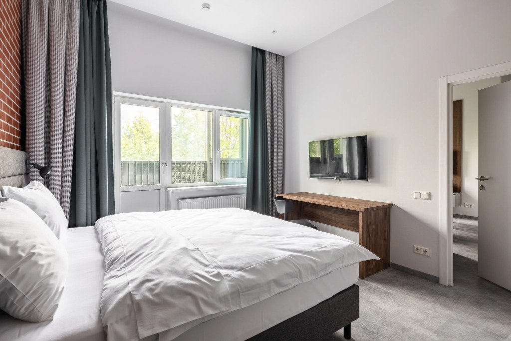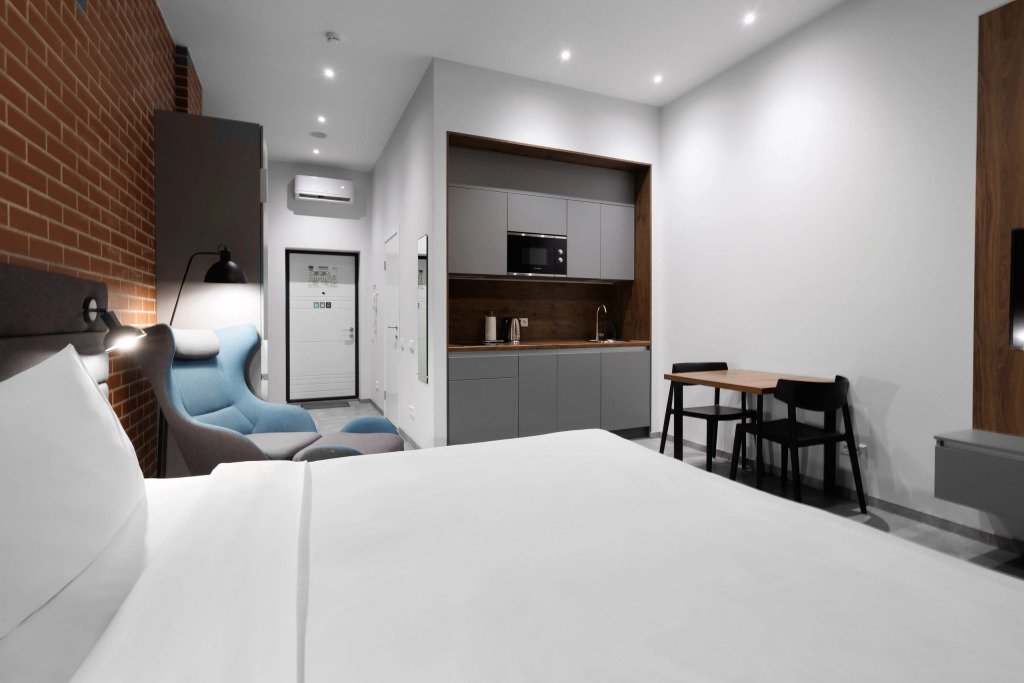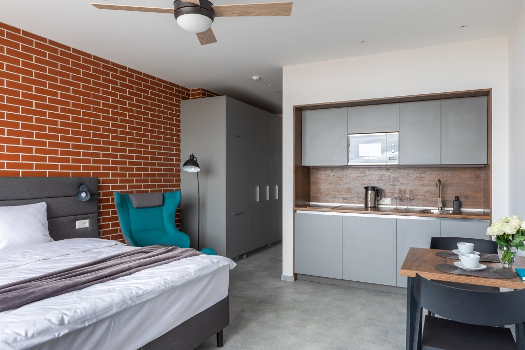 К размещению подготовлены апартаменты с разным уровнем вместимости. Все они оформлены в лаконичном стиле, спокойных тонах. Для проживания гостей каждый номер оборудован мебелью и современной техникой. Ванные комнаты укомплектованы сантехникой и набором полотенец.