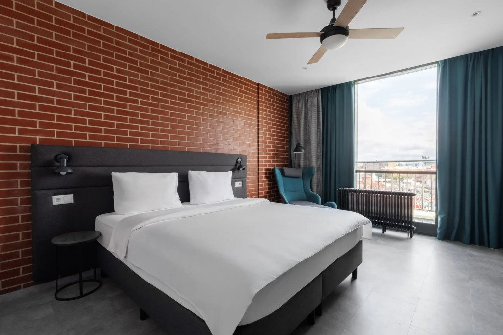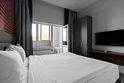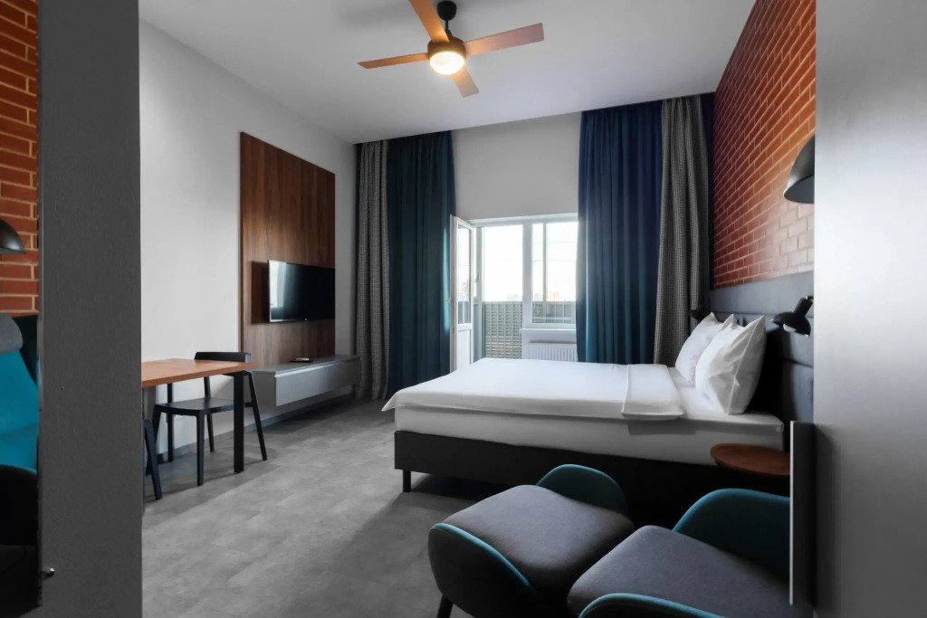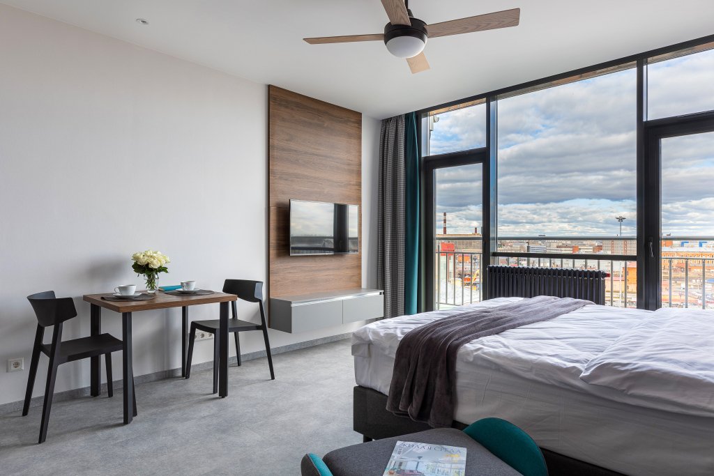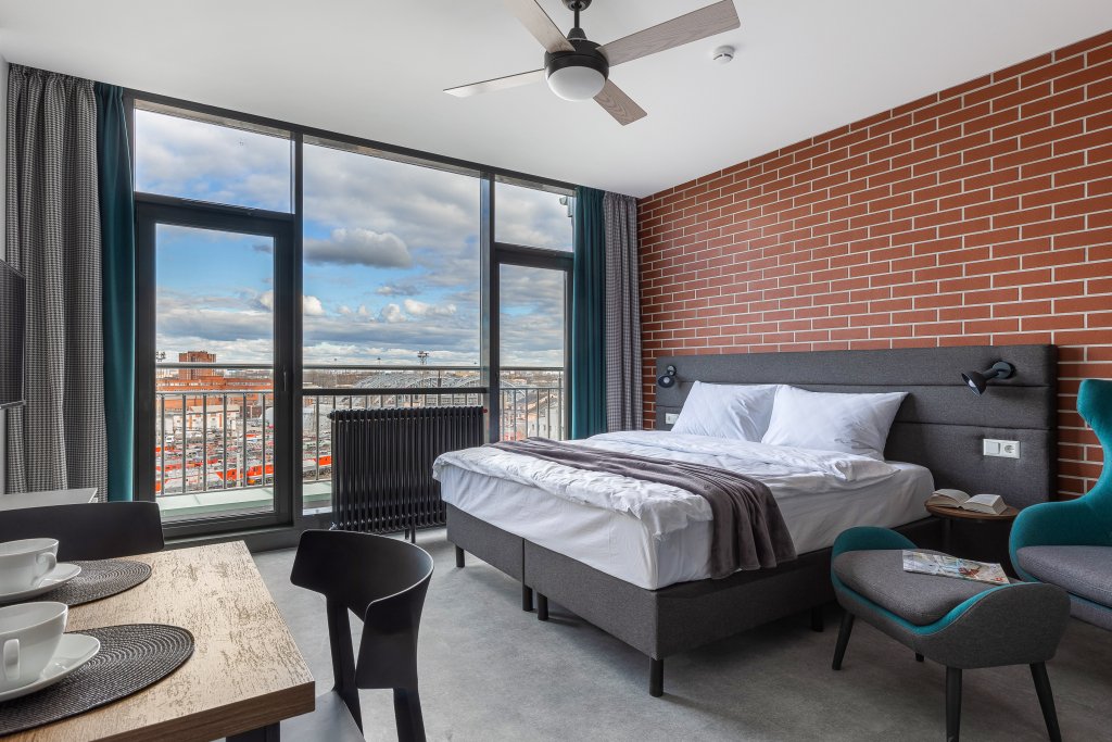 Двухместная студия с балконом и с видом на город двуспальная кровать