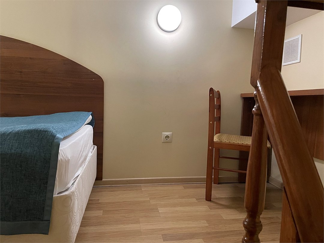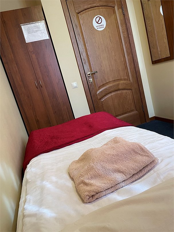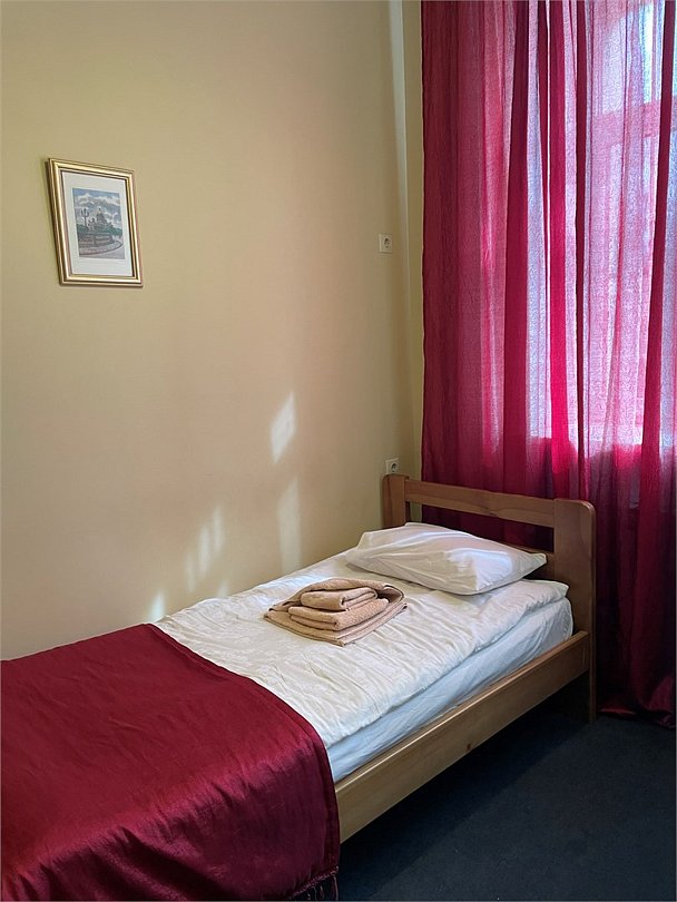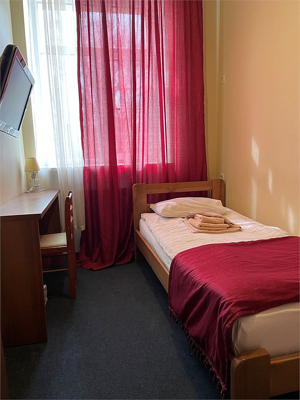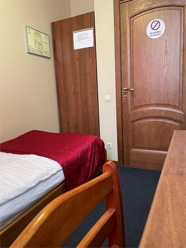 Номер категории эконом с одной односпальной кроватью. В номере стол со стульями, шкаф для одежды, вешалка, телевизор. Ванная комната и туалет находится на этаже. Гостям предоставляются средства личной гигиены, полотенца и тапочки.Услуги и удобства