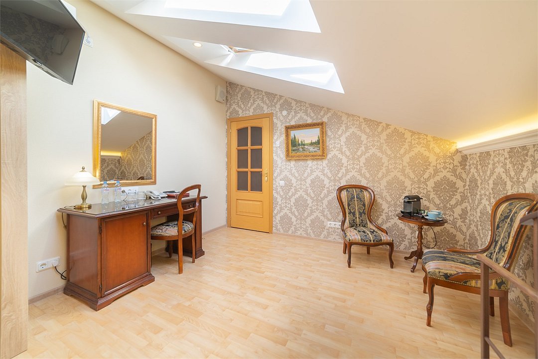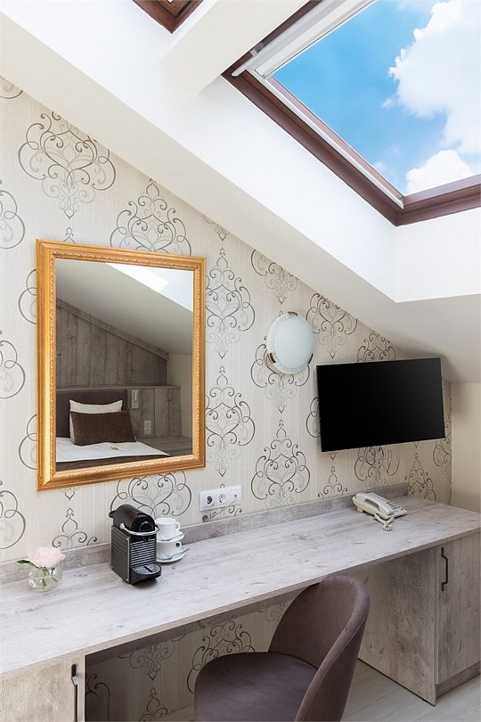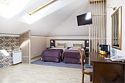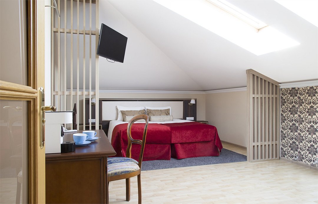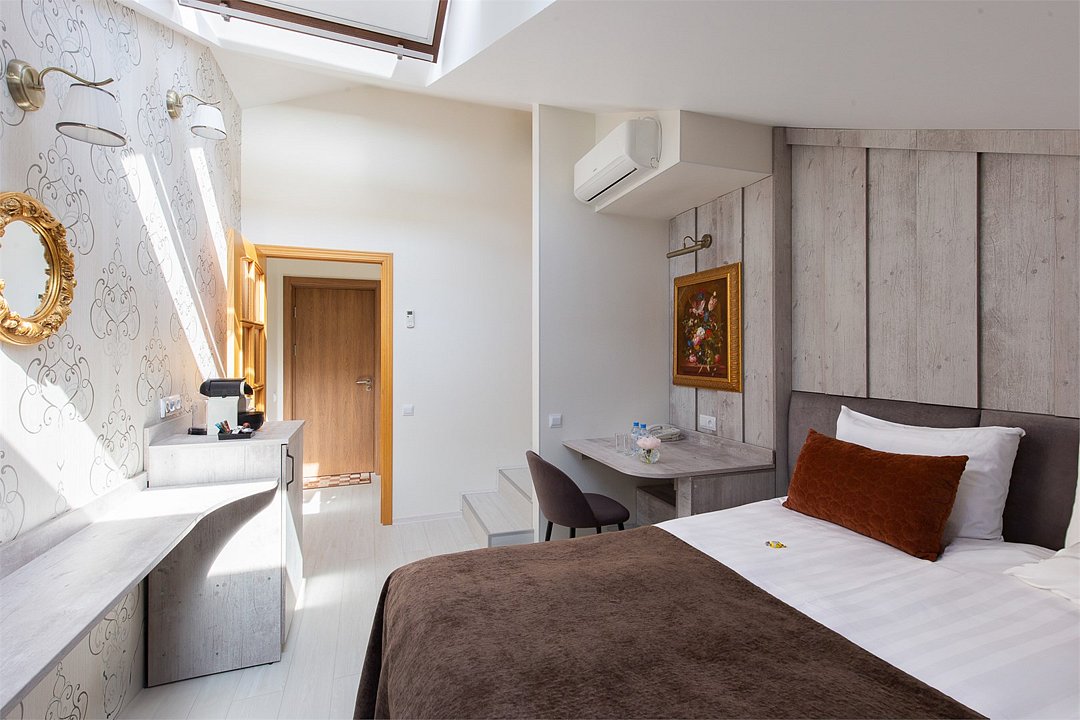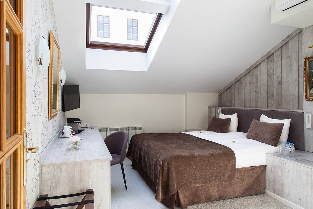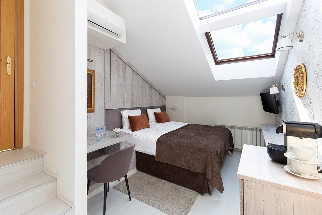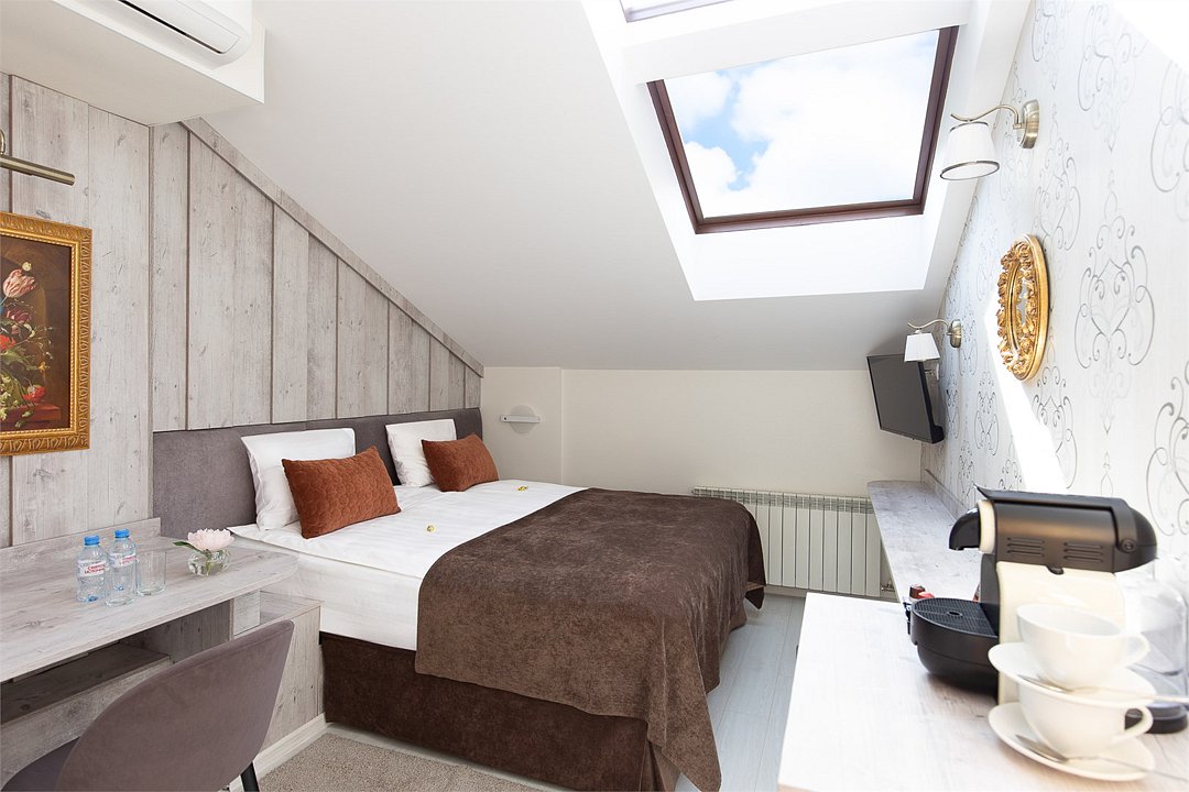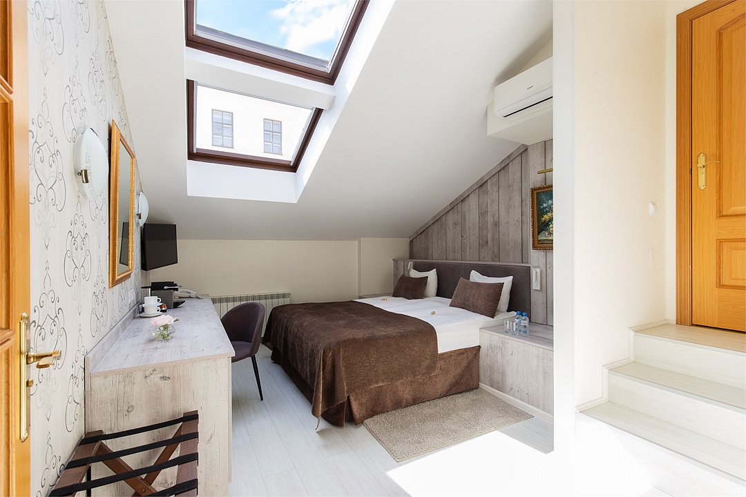 Уютный мансардный номер, который превосходно подходит как для активных путешественников, так и для деловых людей. В каждом номере: Кондиционер, телевизор ЖК, бесплатный WiFi, мини-бар, тапочки, рабочая зона, душ, фен, косметические принадлежности, кофемашина и чайный набор.Услуги и удобства