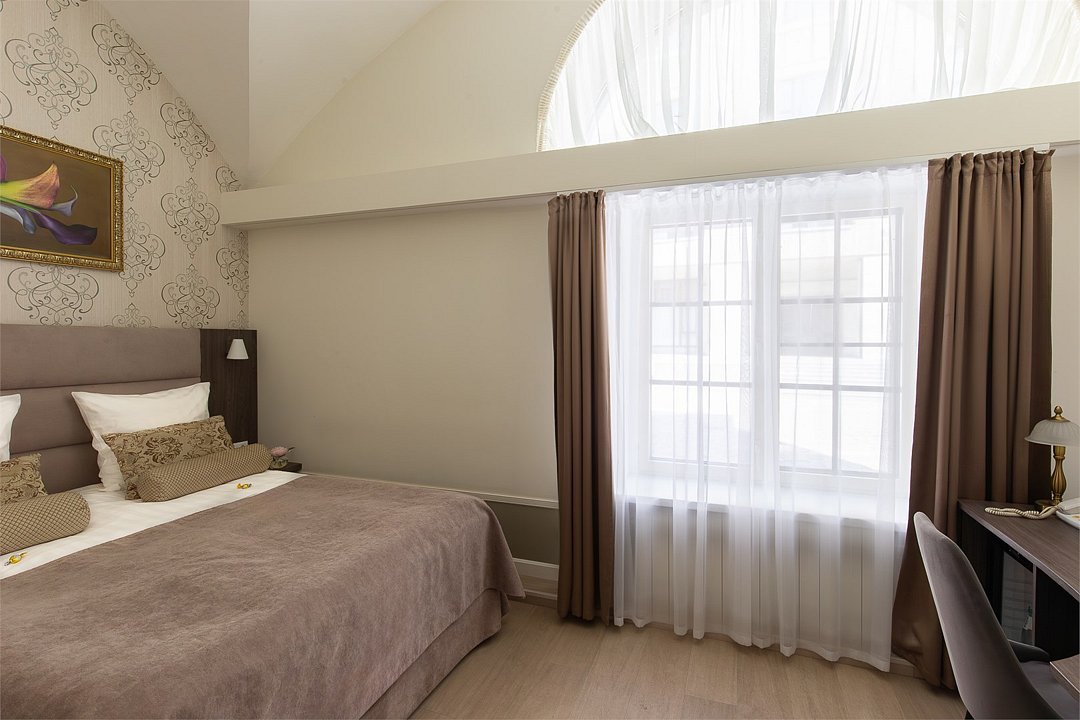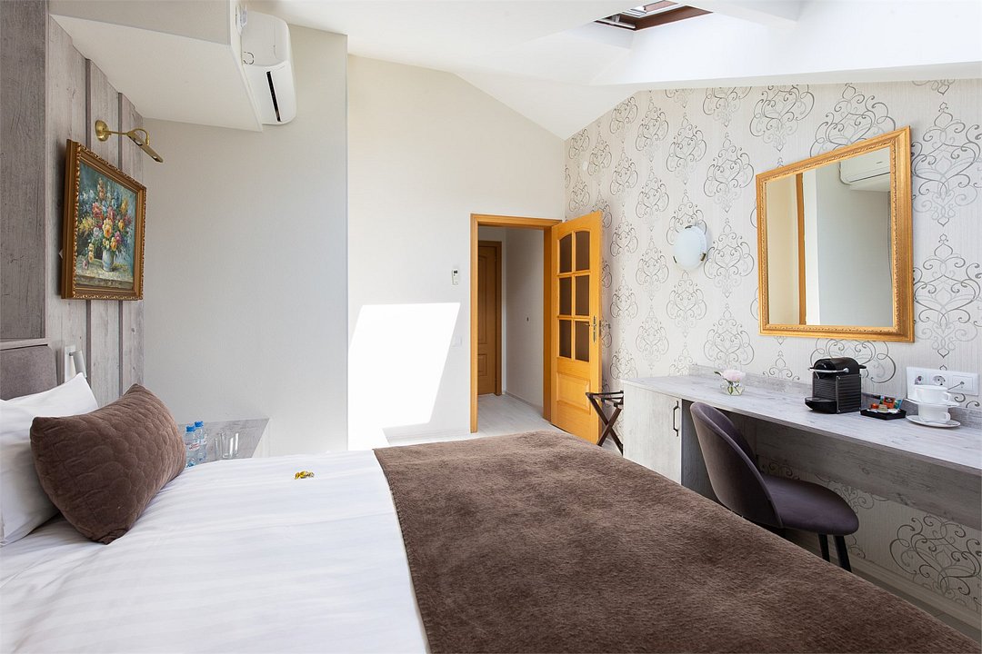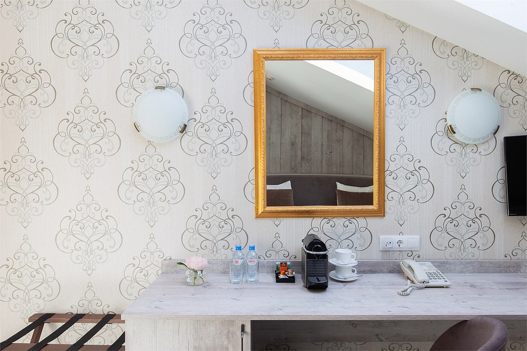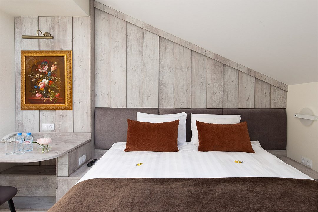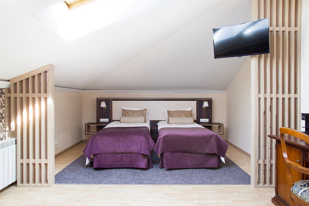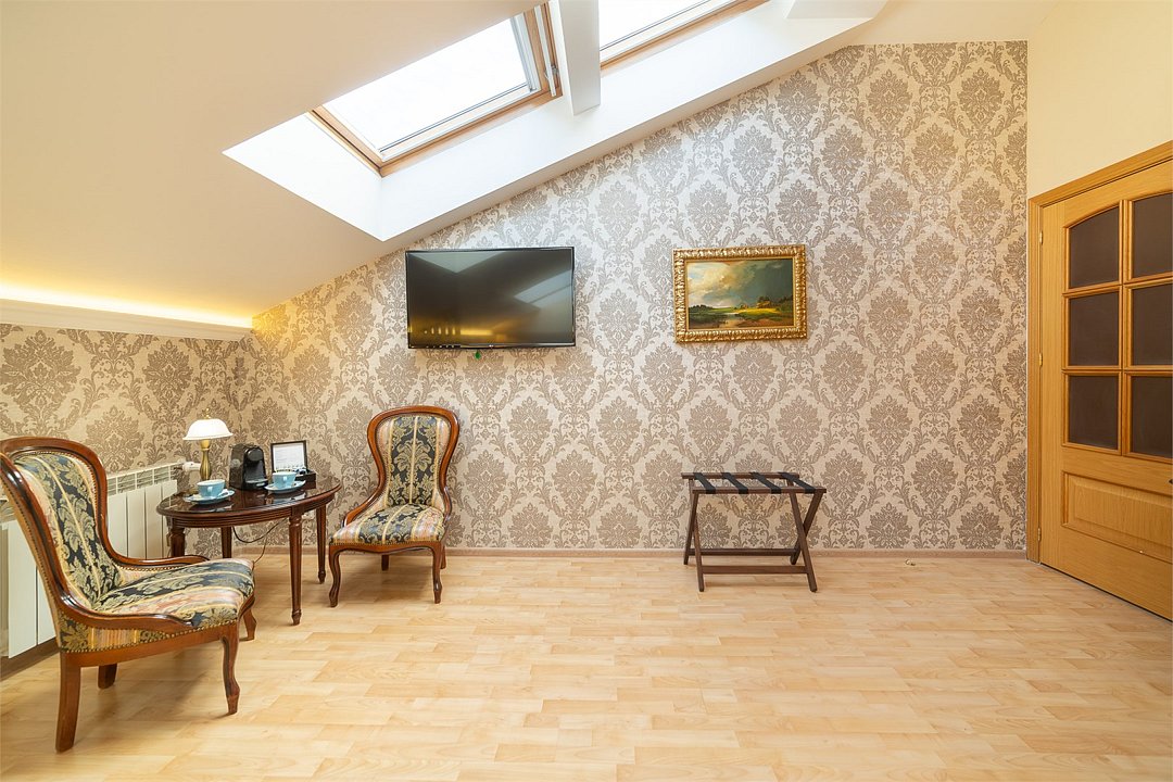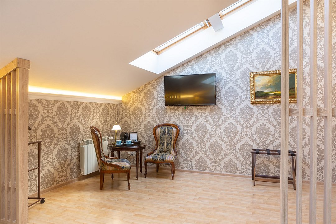 Уютный мансардный номер, который превосходно подходит как для активных путешественников, так и для деловых людей. В каждом номере: Кондиционер, телевизор ЖК, бесплатный WiFi, мини-бар, тапочки, рабочая зона, душ, фен, косметические принадлежности, кофемашина и чайный набор.Услуги и удобства