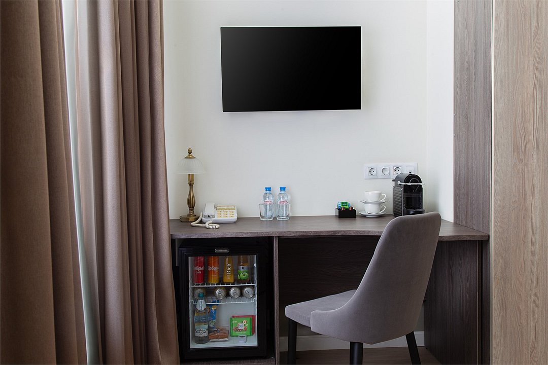 Удобство и функциональность Комфортный РЕНОВИРОВАННЫЙ номер увеличенной площади для гостей, которые ценят простор и функциональность. В каждом номере: Кондиционер, телевизор ЖК, бесплатный Wi-Fi, мини-бар, тапочки, рабочая зона, душ/ванна, фен, косметические принадлежности, кофемашина и чайный наборУслуги и удобства