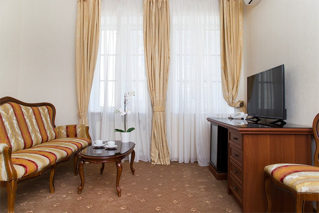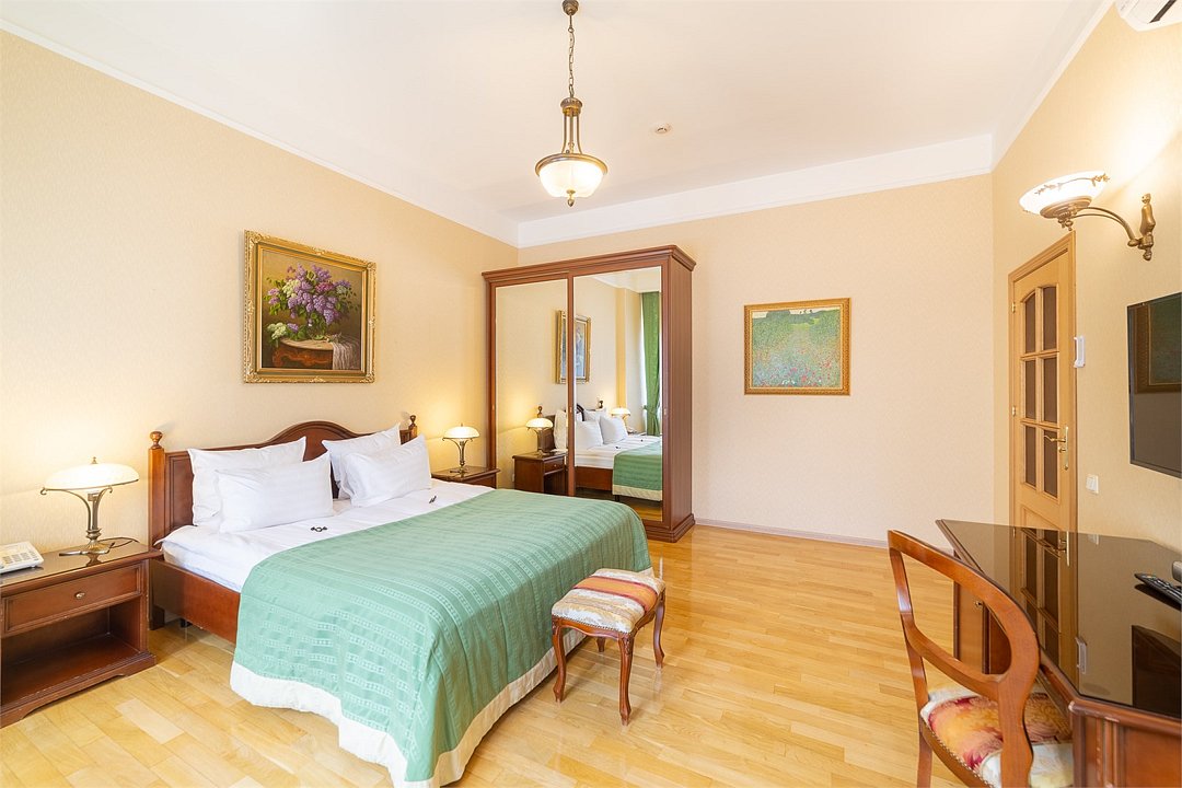 Респектабельность и домашний уют. Двухкомнатный люкс с изысканной обстановкой, изящной мебелью и просторной гостиной - идеальный выбор для бизнес-путешественников и романтических пар! Номер дополнительно укомплектован кофемашиной, чайной станцией, халатами и расширенным набором косметических принадлежностей.Услуги и удобства