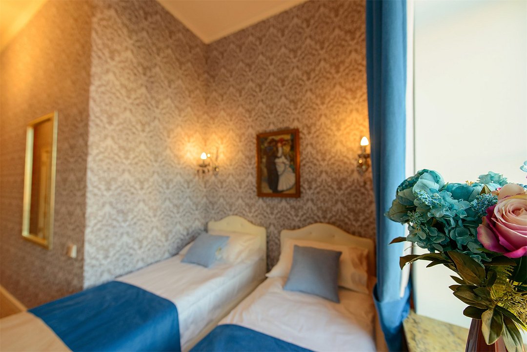 Уютные номера имеют несколько дизайнерских решений, стены украшены репродукциями картин. Номер идеально подходит как для одно, так и двухместного размещения. Все номера для некурящих, оснащены сан. узлом с душем, феном и бесплатными туалетными принадлежностями, а также Wi Fi. Во всех комнатах находится телевизор, холодильник, телефон и сейф.Услуги и удобства