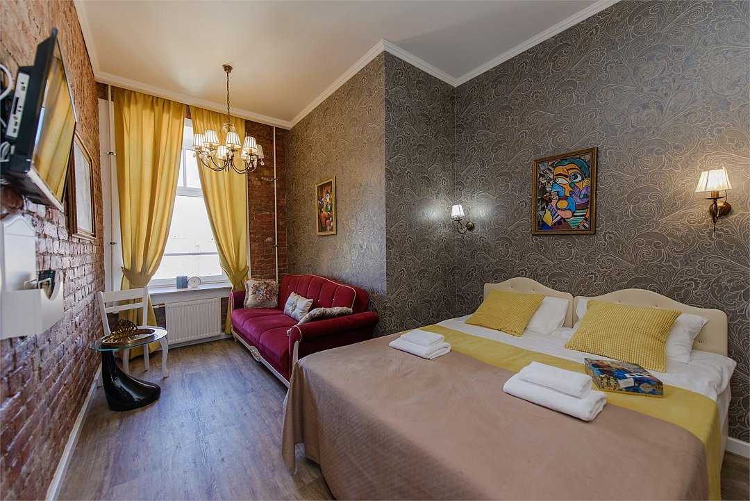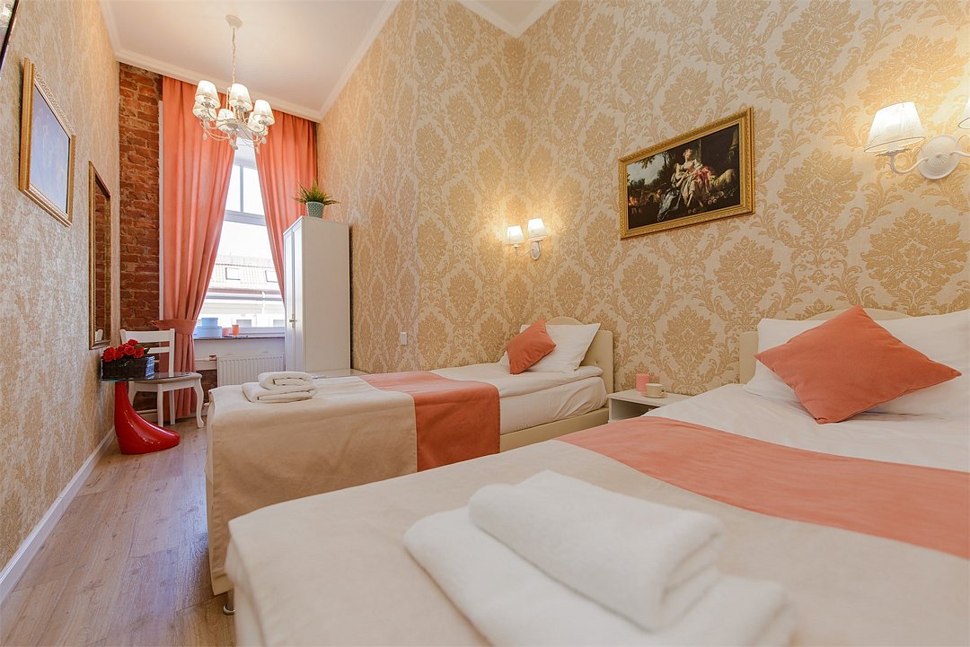 Просторные номера данной категории подходят для размещения семьи или компании до 3-х человек. К Вашим услугам стильный авторский интерьер номера, окна которого выходят на тихую улицу. На Ваш выбор одна большая или две отдельные кровати, а в качестве полноценного спального - раскладной диван, . Все номера для некурящих, оснащены кондиционером, сан. узлом с душем, феном и бесплатными туалетными принадлежностями, а также Wi Fi. Во всех номерах телевизор, холодильник, телефон и сейф.Услуги и удобства