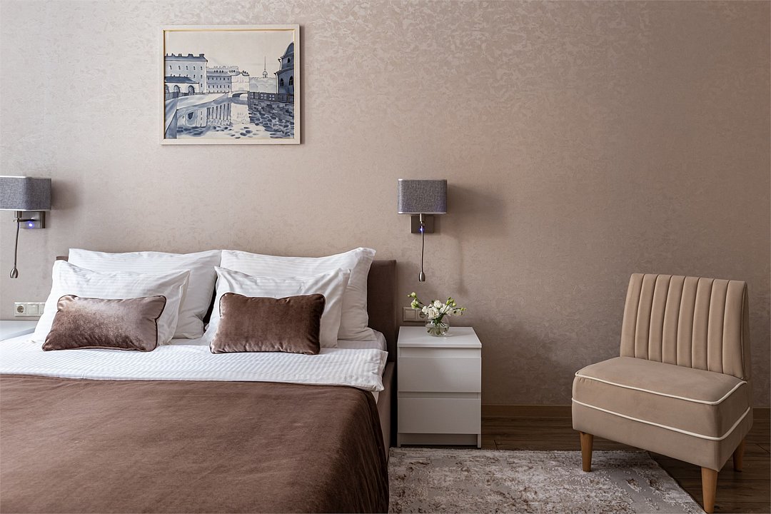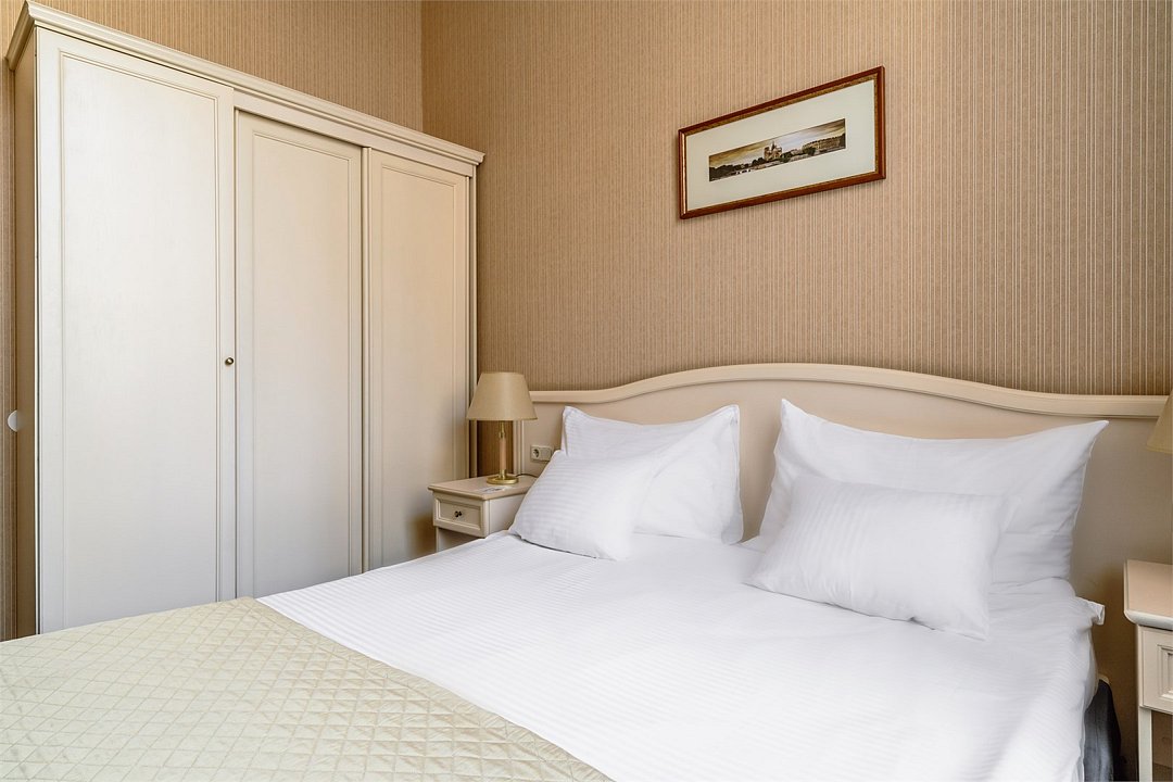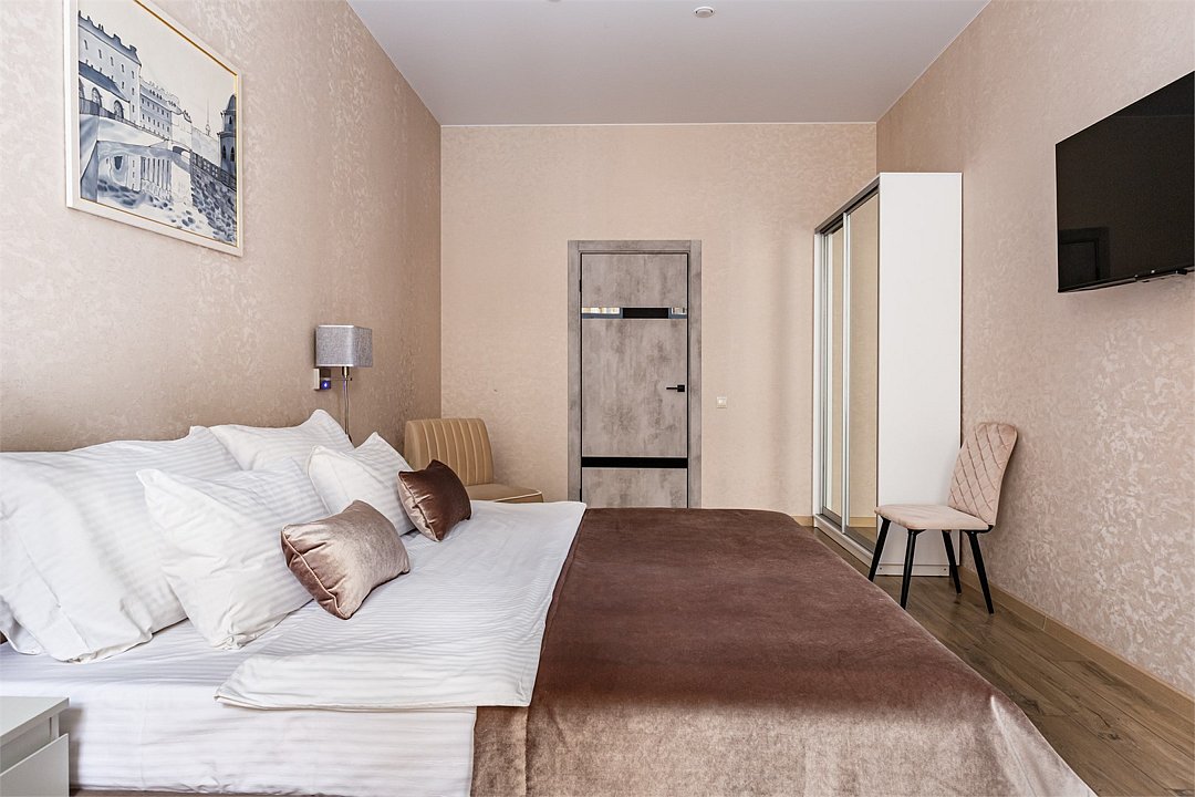 Новые комфортные двухкомнатные апартаменты с кухней, идеально расположены в тихом дворе на 2 этаже, с отдельным входом и парадной. Апартаменты идеально подойдут для проживания семьи. Площадь апартаментов– 80 м.кв.: две просторных, светлых спальни, кухня, санузел с душевой кабиной. Апартаменты полностью меблированы и оборудованы для полноценного отдыха. В апартаментах могут свободно разместиться до 6 человек - 2 двуспальные кровати, двуспальный диван. В распоряжении гостей есть все необходимое: посуда (тарелки, приборы, стаканы, бокалы, кастрюли, сковородки), бытовая химия, постельное белье, полотенца, бытовая техника (стиральная машина, микроволновая печь, холодильник, чайник, духовка, пылесос, фен, утюг, телевизоры в спальнях и на кухне, шкафы во всех спальнях . Есть бесплатная парковка во дворе. В стоимость аренды входят коммунальные услуги (вода, электричество), постельное белье и полотенца. Влажная уборка апартаментов (без мытья посуды) проходит на третий день заезда (до 18:00) по запросу гостей, смена полотенец по запросу. Гарантийный залог – 10 000 рублей (возвращается в день отъезда, если апартаменты в порядке). Для всех гостей отеля предусмотрена скидка 20% по будням дням с 12:00 до 16:00 на основное меню ресторана Villa AstonУслуги и удобства