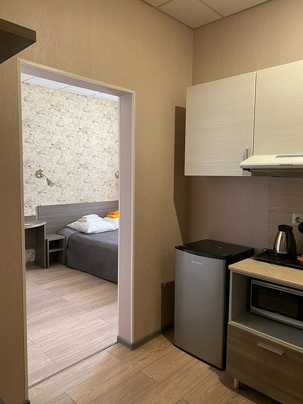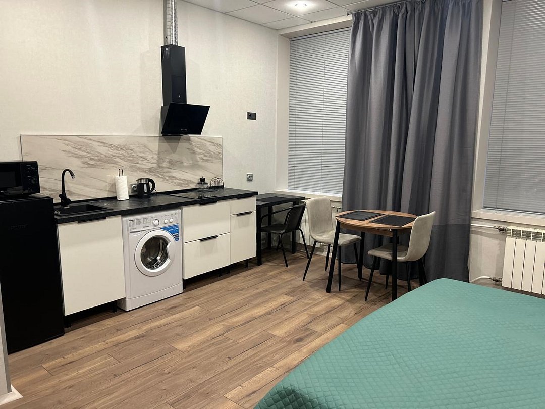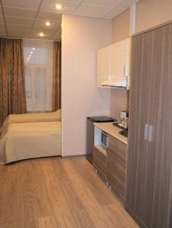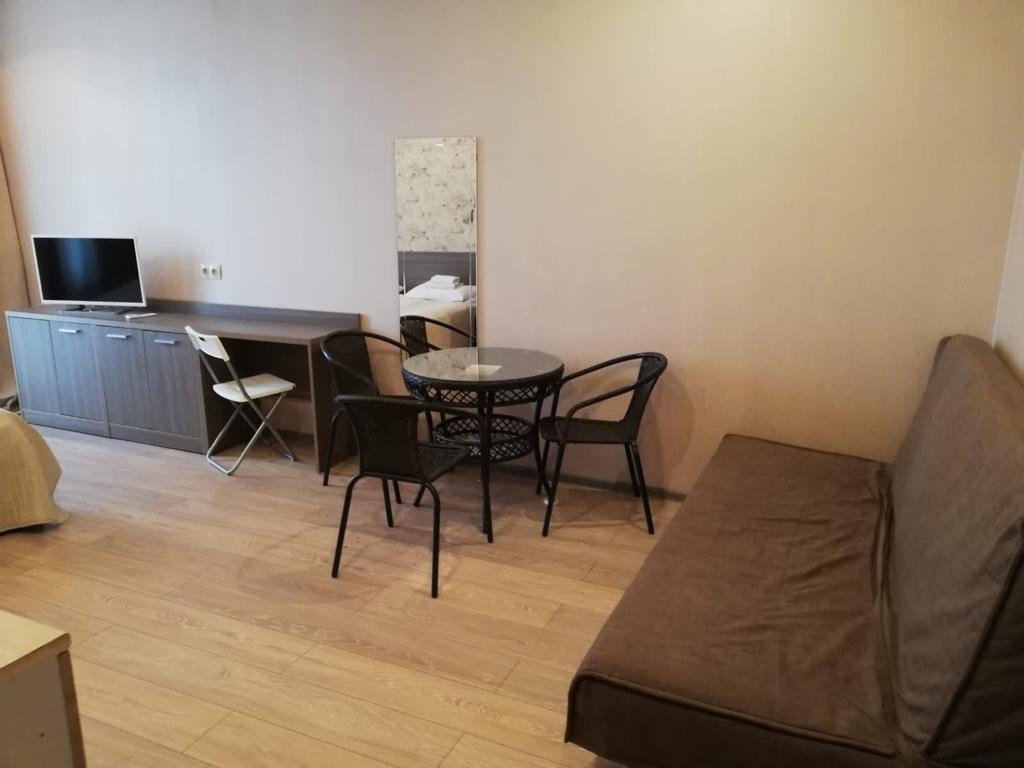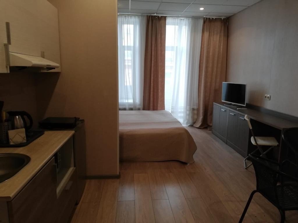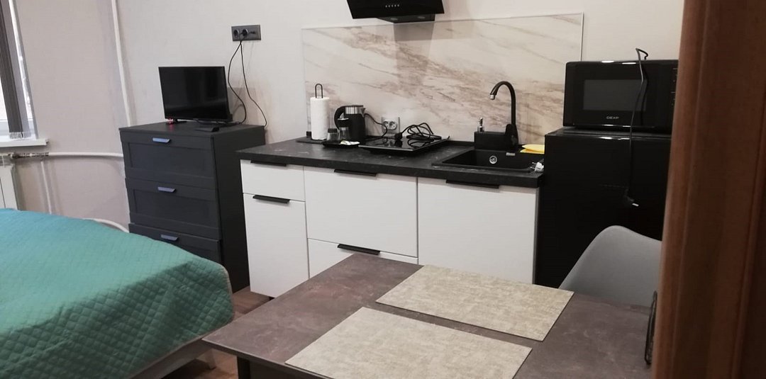 Студия вмещает до 2х человек. В номере двуспальная кровать, кухонный уголок с плиткой, чайником, холодильником, свч, посудой. Собственный санузел с душевой кабиной. WIFI бесплатный Апартаменты находятся на 3 этажеУслуги и удобства