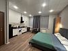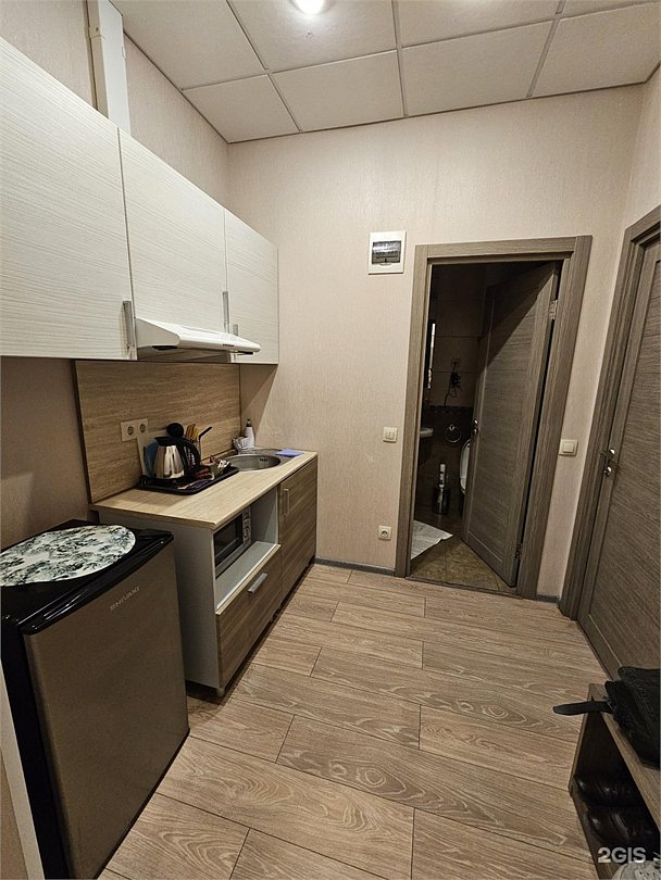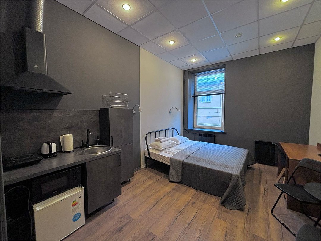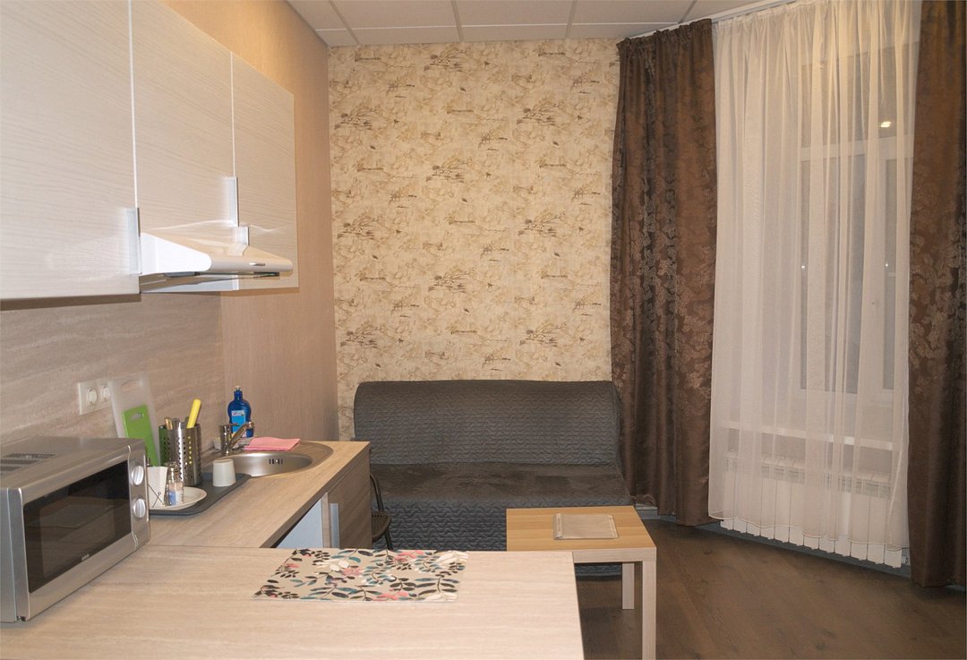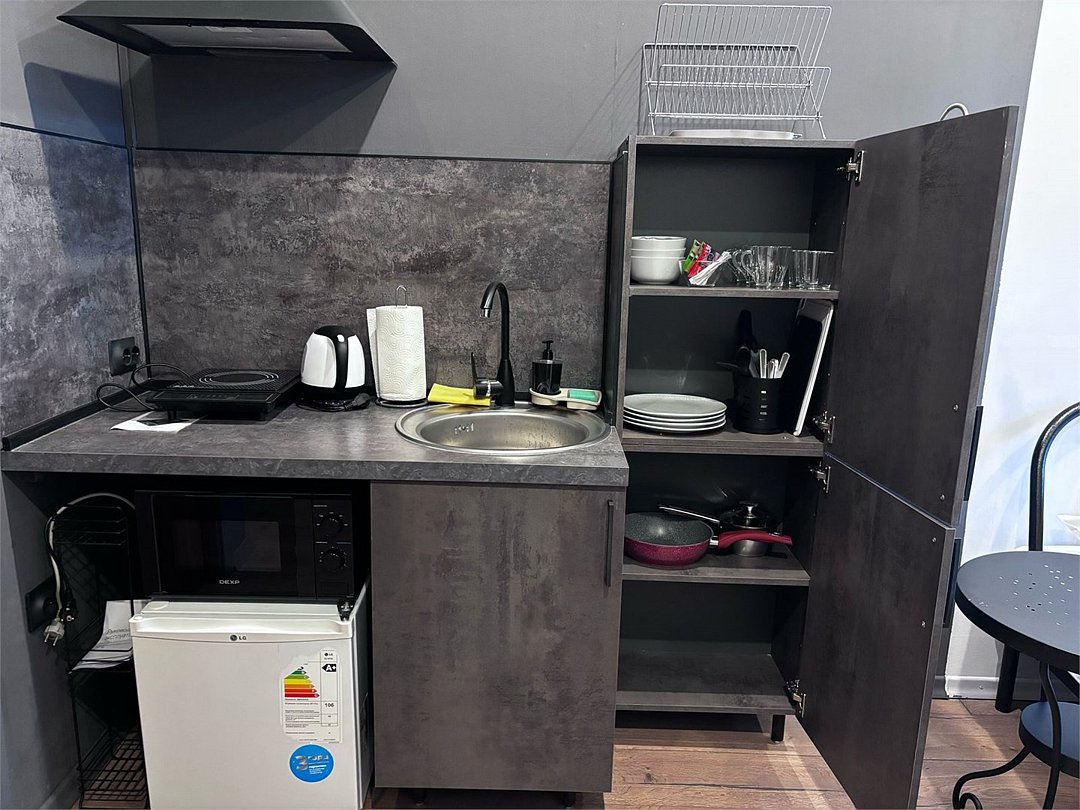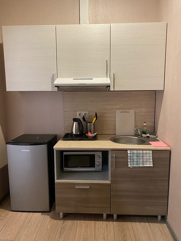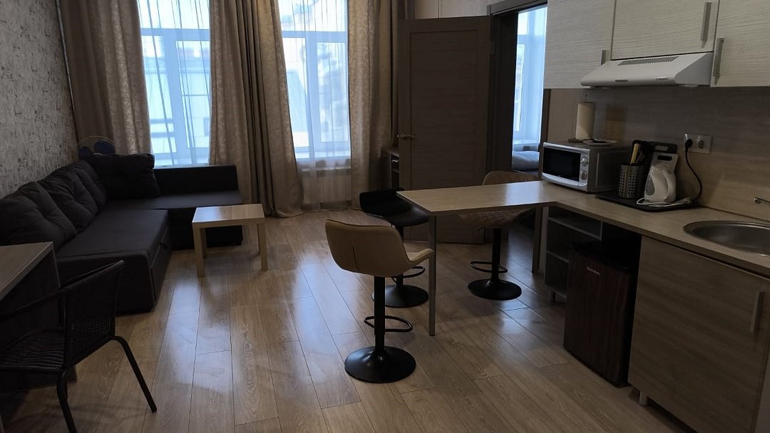 Студия вмещает до 2х человек. В номере двуспальная кровать, кухонный уголок с плиткой, чайником, холодильником, свч, посудой. Собственный санузел с душевой кабиной. WIFI бесплатный Апартаменты находятся на 3 этажеУслуги и удобства