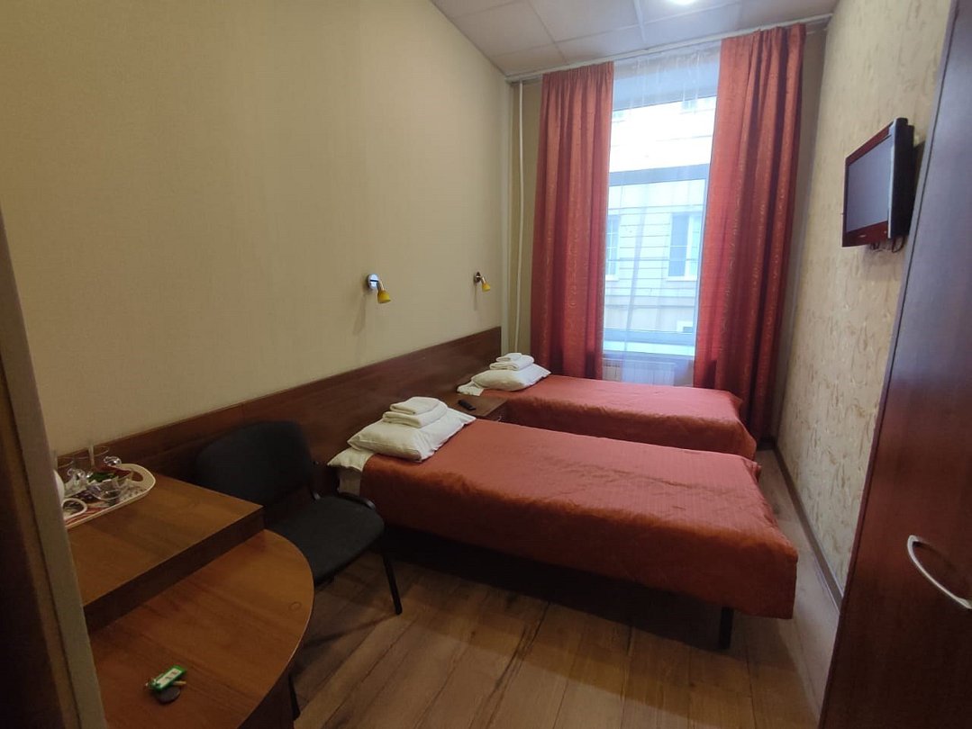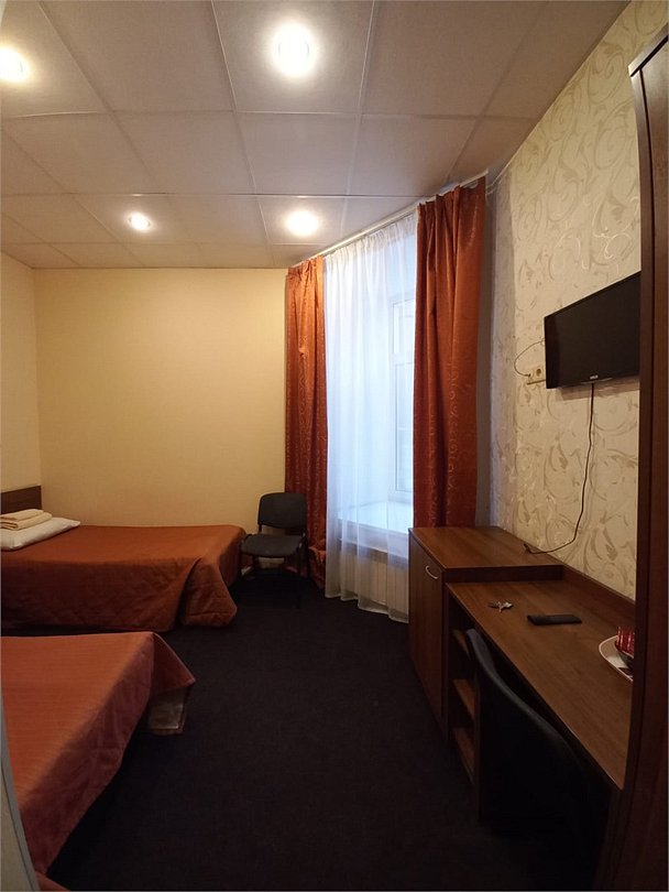телевизор, Wi-Fi, фен, душевая кабина, банные принадлежности, банные полотенца, тапочки, две односпальные кровати, шкаф для одежды, вешалки, письменный стол, зеркало, чайный набор, чайник, раковина, отопление, вид на город, кулер на этаже, вид во двор, стаканы, стул, тумба, туалетные средства, туалет, мини-холодильник, номер для некурящих, мыло, затемняющая штора, зеркало в полный ростВ гостиничном номере
