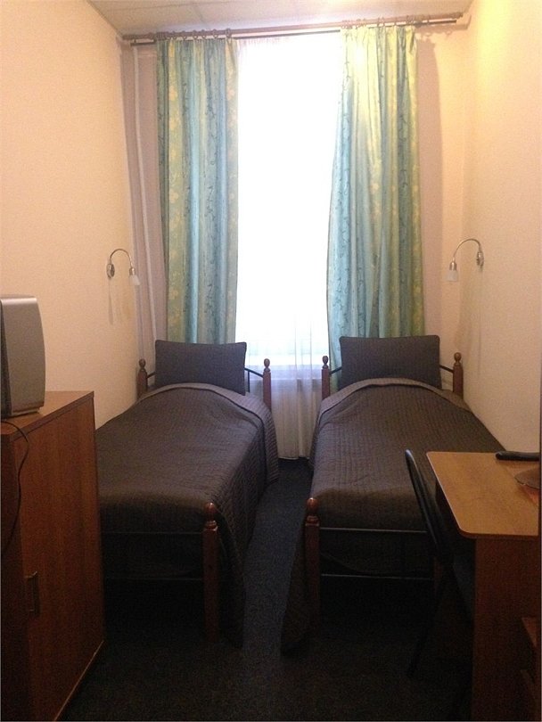 телевизор, Wi-Fi, интернет, две односпальные кровати, шкаф для одежды, вешалки, отопление, кулер на этаже, общая ванная комната, стул, стол, тумба, номер для некурящих, холодильный шкаф, затемняющая штораВ гостиничном номере