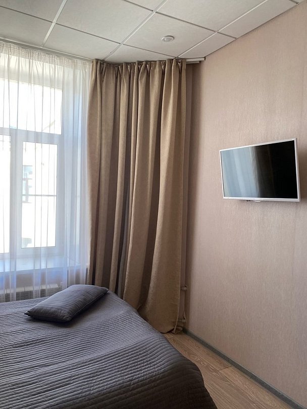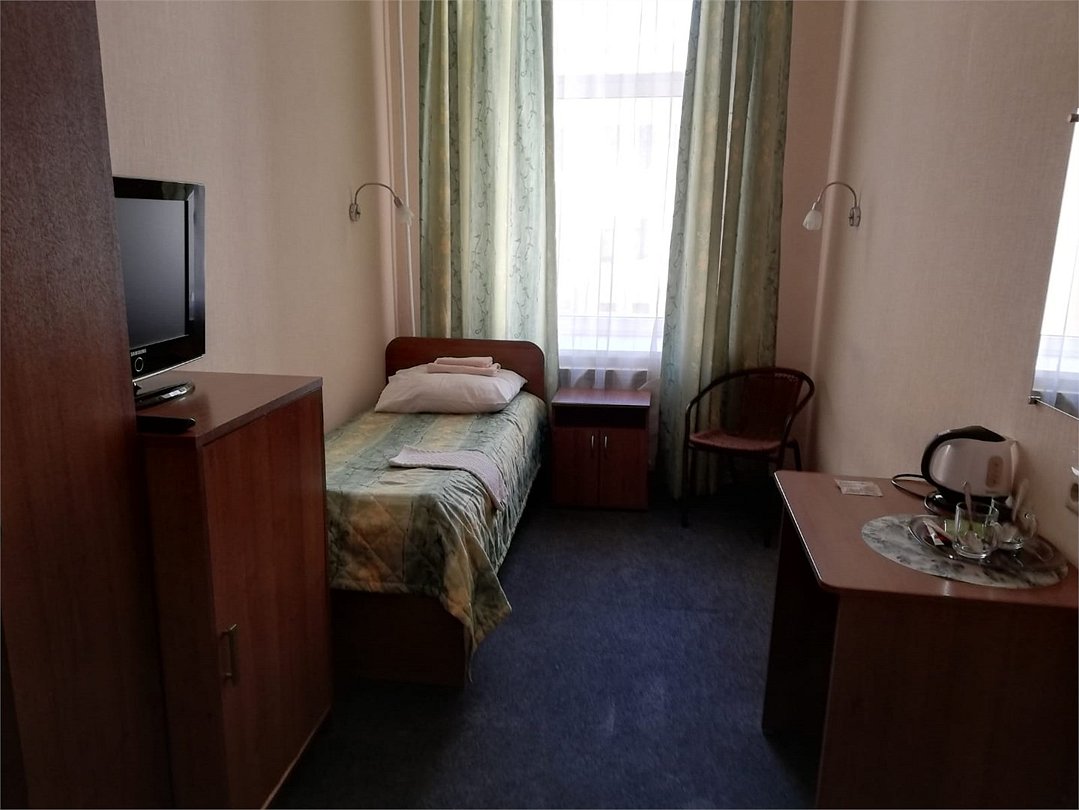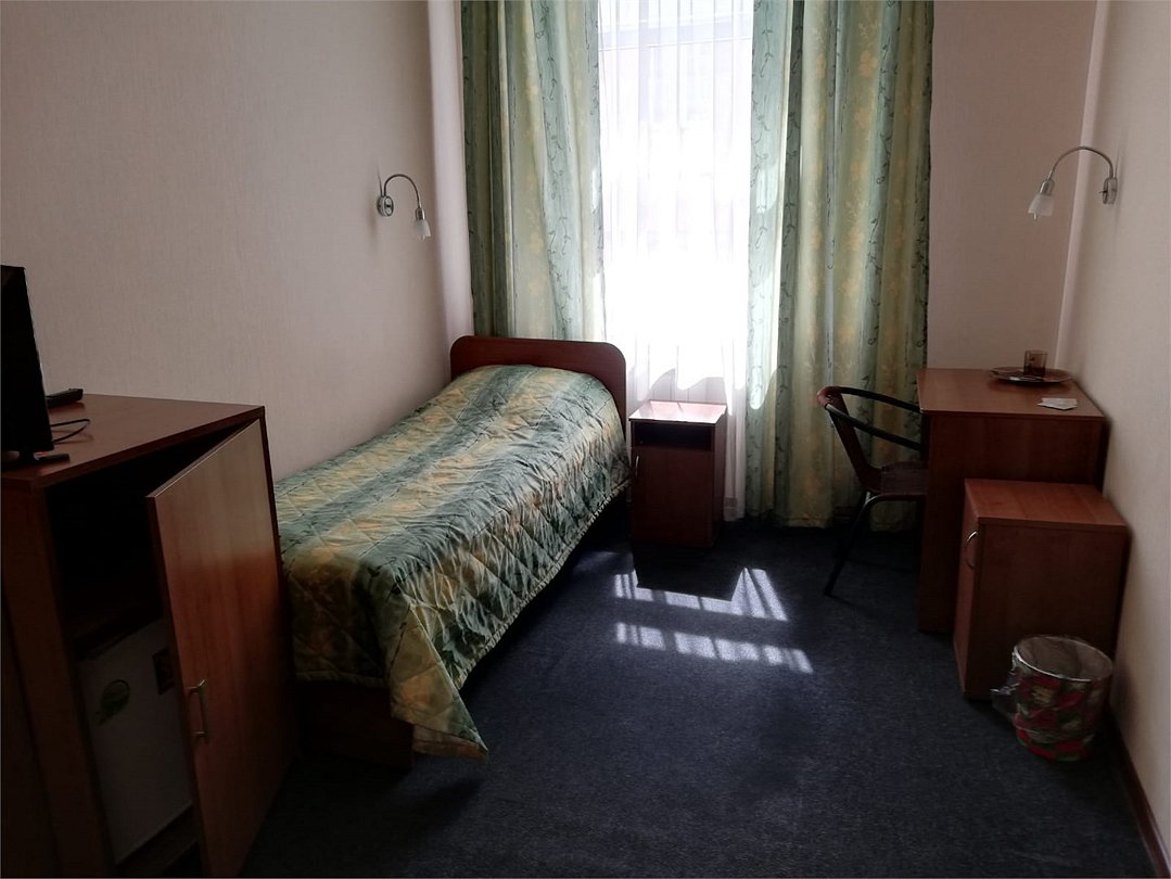 телевизор, Wi-Fi, односпальная кровать, шкаф для одежды, вешалки, отопление, общая ванная комната, стул, стол, тумба, номер для некурящих, холодильный шкаф, затемняющая штораВ гостиничном номере