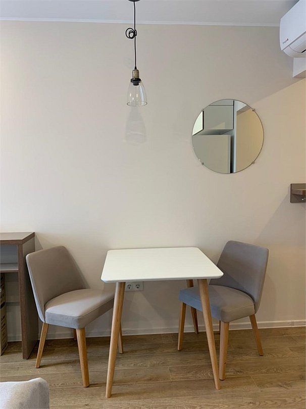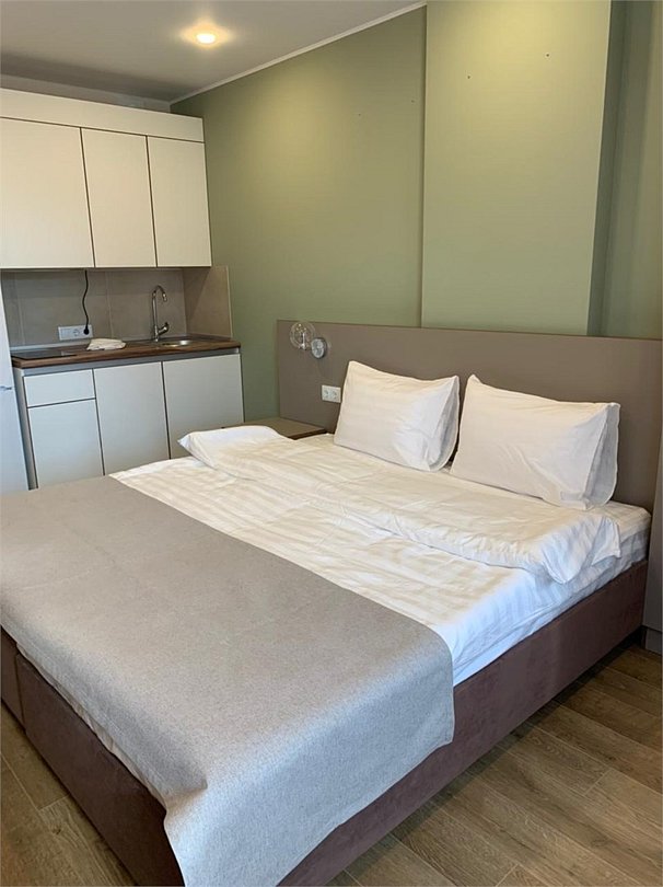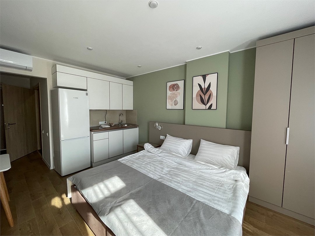 Апартаменты Студио представляют собой единое пространство метражом 27 кв.м, оснащенное всем необходимым для комфортного проживания: кухонный гарнитур, столовые приборы и посуда, бытовая техника, собственный санузел. Спальное место: по предпочтению гостей в номере может быть одна двуспальная кровать-трансформер (180см*200см) или две односпальные кровати (90см*200см).Услуги и удобства
