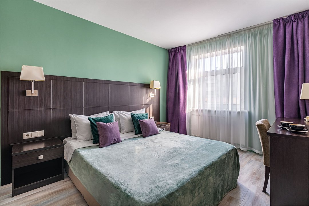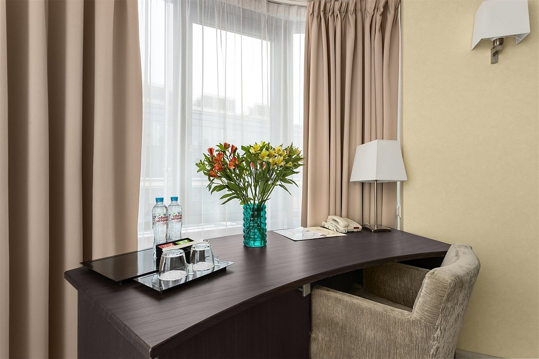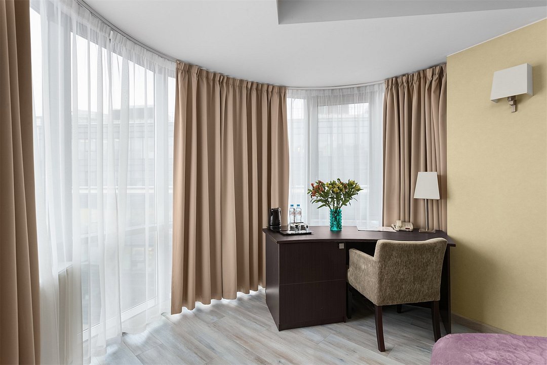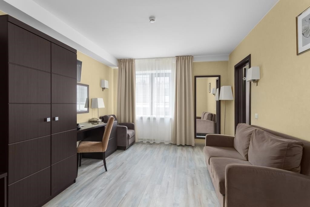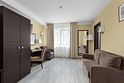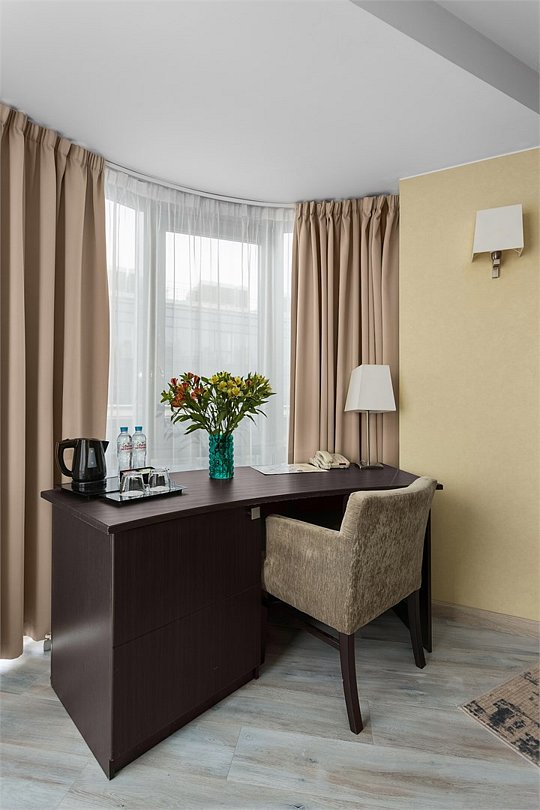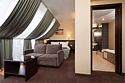 Двухкомнатный номер люкс дает возможность комфортно разместить до 4 человек. В номерах данной категории также очень удобно проживать, находясь в длительной командировке: рабочее пространство с мягкой мебелью отделено от спальни, а широкое эркерное окно спальни, в свою очередь, позволяет скрасить минуты отдыха созерцанием города. По особому запросу, Гостям данной категории номера, предоставляется капсульная кофе-машина на все время проживания. Номера оснащены мини-холодильниками.Услуги и удобства