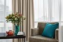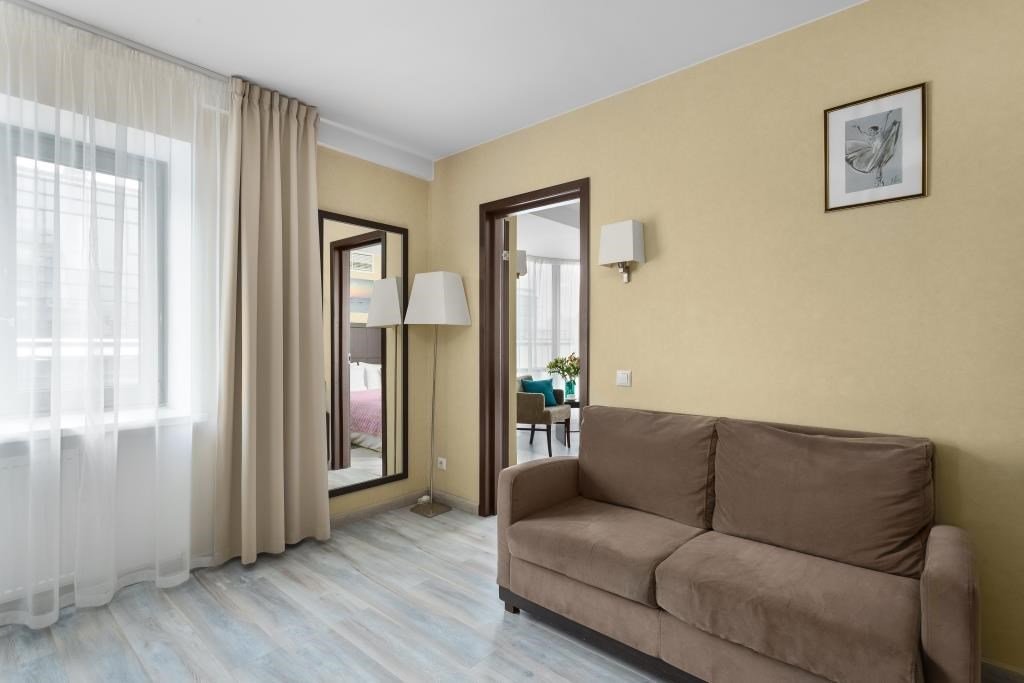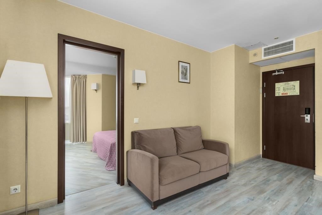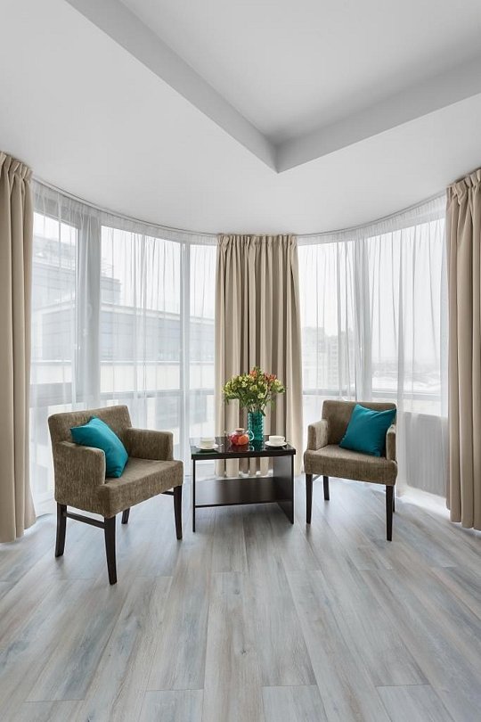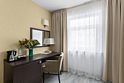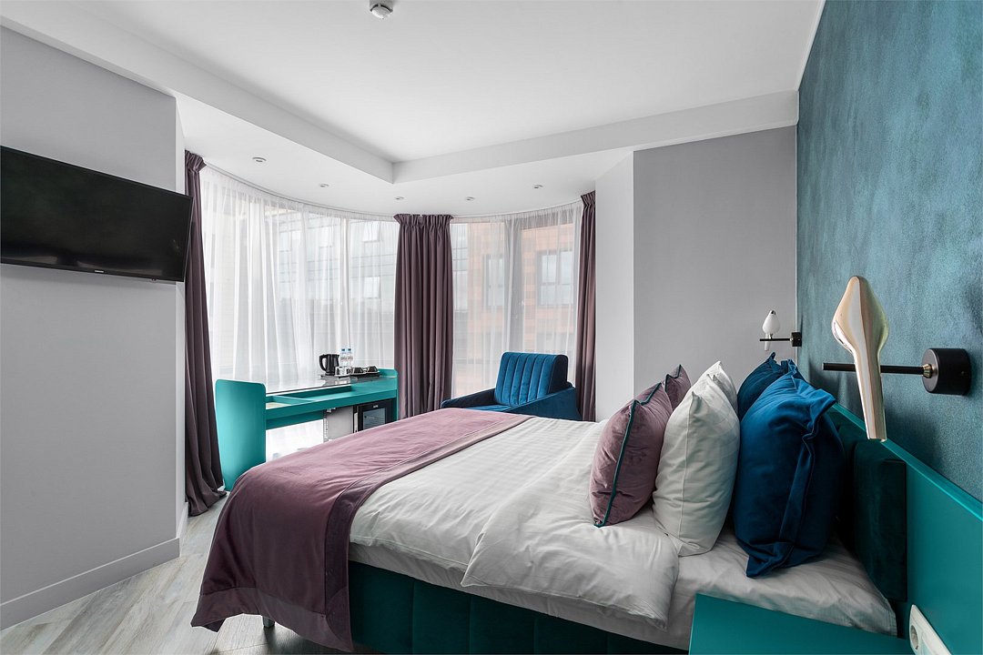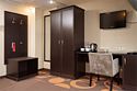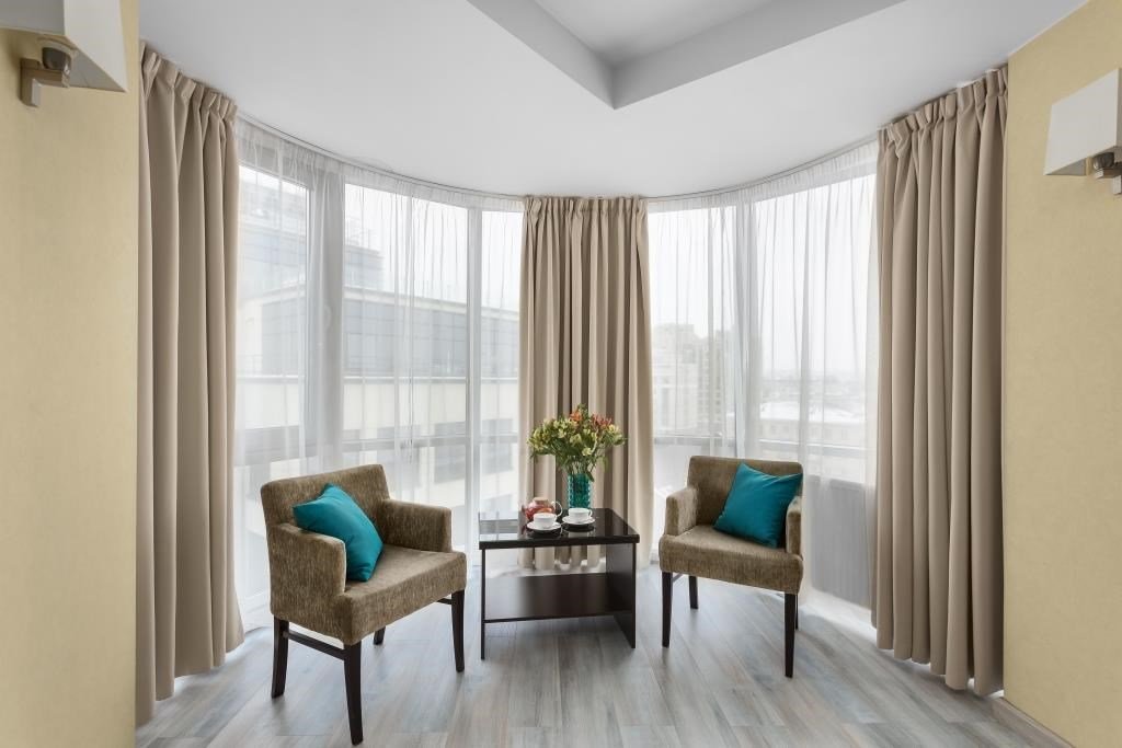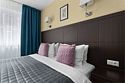 Двухкомнатный номер люкс дает возможность комфортно разместить до 4 человек. В номерах данной категории также очень удобно проживать, находясь в длительной командировке: рабочее пространство с мягкой мебелью отделено от спальни, а широкое эркерное окно спальни, в свою очередь, позволяет скрасить минуты отдыха созерцанием города. По особому запросу, Гостям данной категории номера, предоставляется капсульная кофе-машина на все время проживания. Номера оснащены мини-холодильниками.Услуги и удобства
