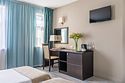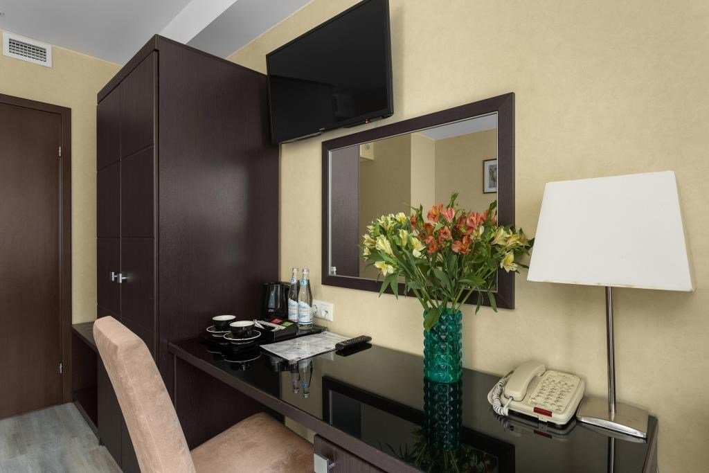 Wi-Fi, телефон, кондиционер, фен, душевая кабина, санузел, банные полотенца, две односпальные или большая двуспальная кровать, тумбы, шкаф для одежды, вешалки, багажная тумба, зеркало, информационная карта, меню, отопление, вид на город, ламинат, стул, стол, тумба, телевизор с плоским экраном, мини-холодильник, номер для некурящих, без питомцевВ номере