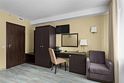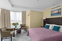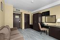 Wi-Fi, телефон, кондиционер, фен, душевая кабина, санузел, кровать «King size», шкаф для одежды, журнальный столик, письменный стол, багажная тумба, зеркало, отопление, вид на город, ламинат, стул, тумба, диван-кровать, телевизор с плоским экраном, мини-холодильник, без питомцевВ номере