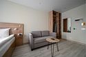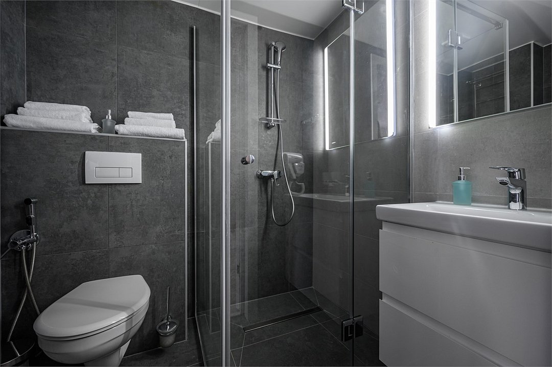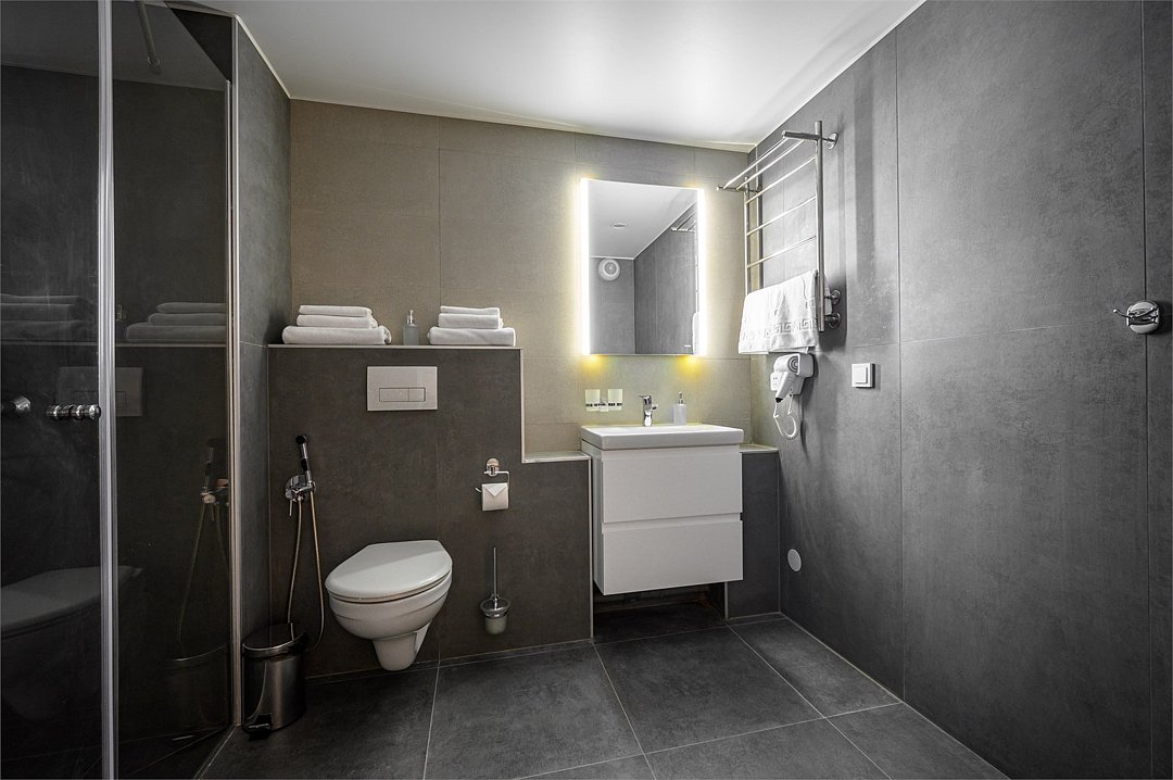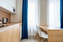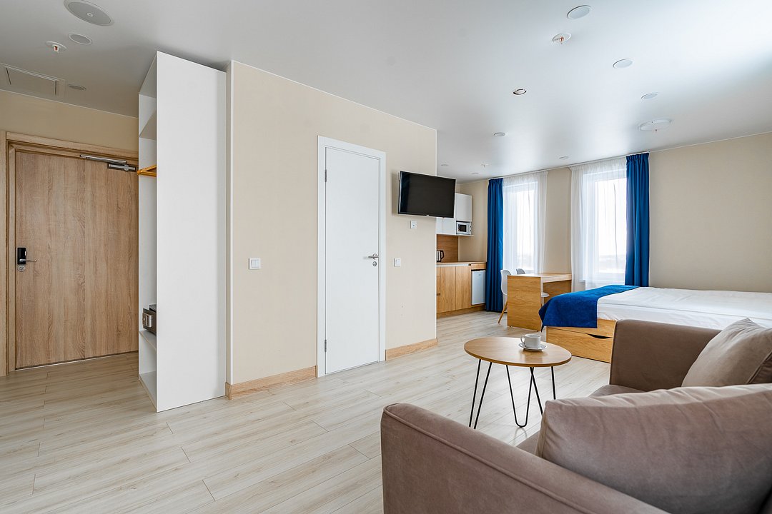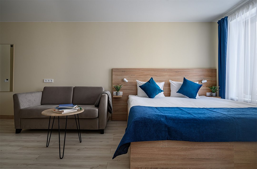 Апартаменты идеально подходят для размещения трёх или четырех человек. Номер оборудован кроватью-трансформером, журнальным столиком и раскладывающимся диваном. Такое наполнение особенно понравится семьям с детьми. Кухонная зона оборудована необходимой техникой, укомплектована посудой и принадлежностями для приготовления пищи.Услуги и удобства