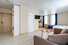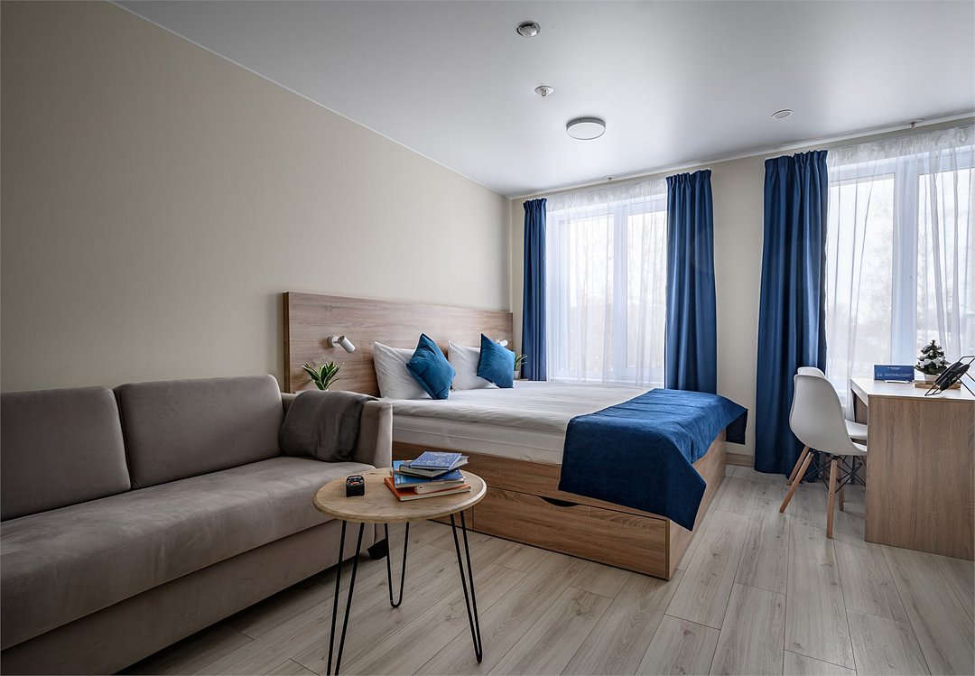Просторные апартаменты с видом на Чёрную речку предназначены для комфортного размещения одного, двух или трёх гостей. Номер оборудован двуспальной кроватью-трансформером с ящиками для хранения и кухонной зоной, укомплектованной всей необходимой техникой, посудой и принадлежностями. Площадь номера позволят установить дополнительное место.Услуги и удобства