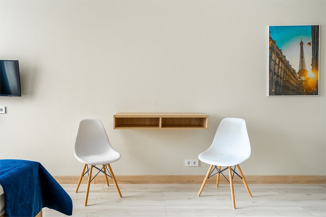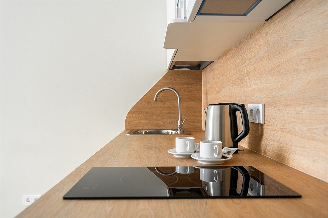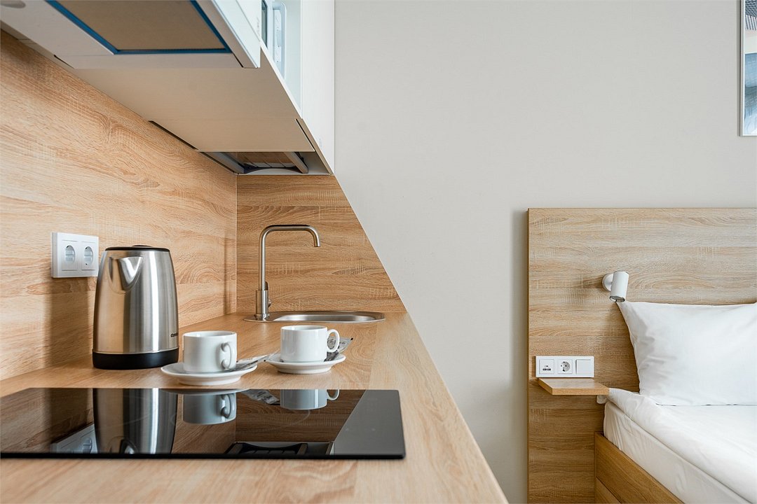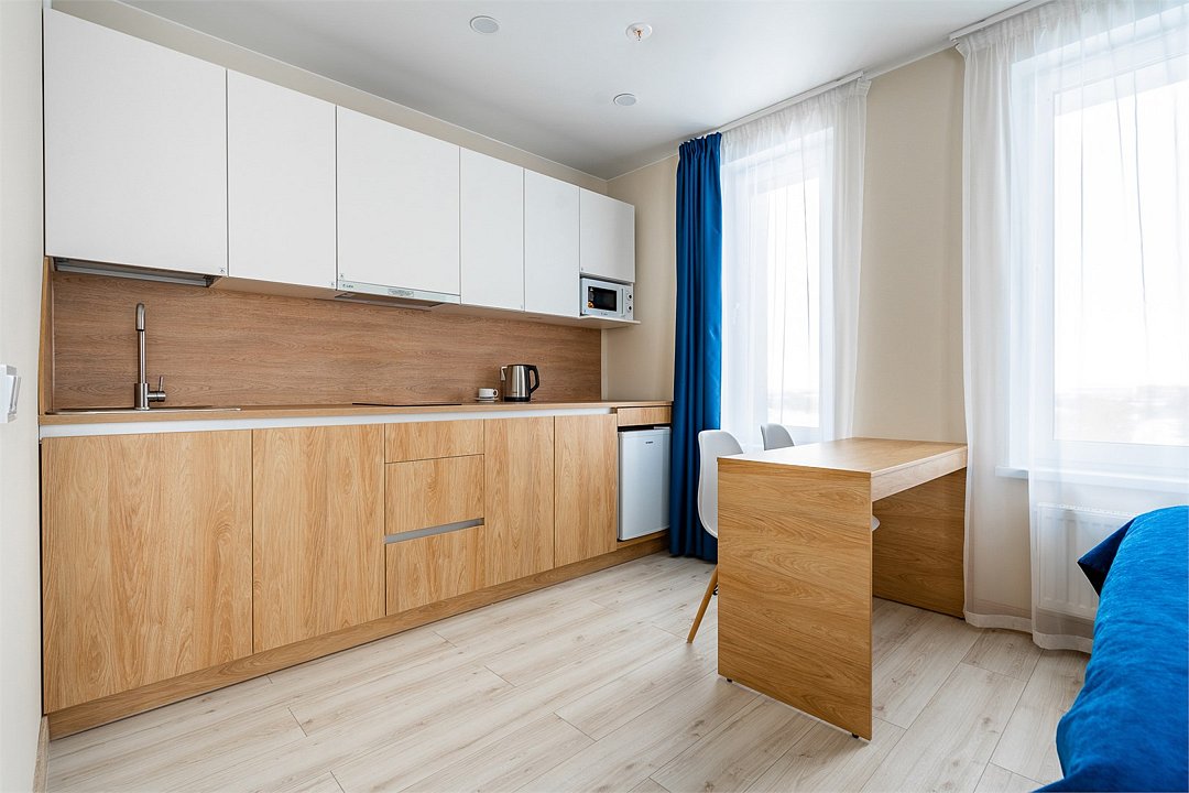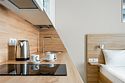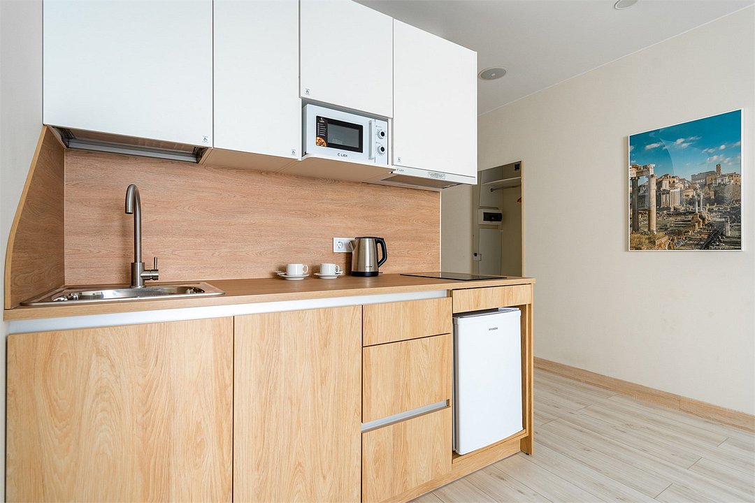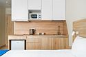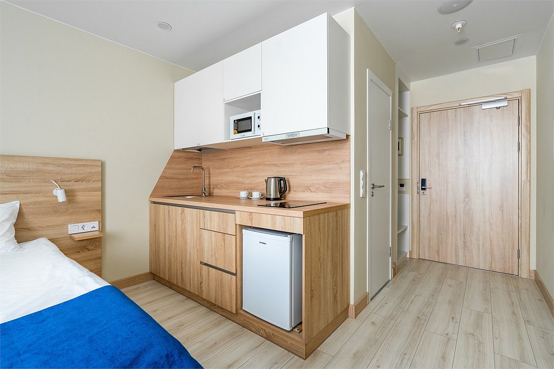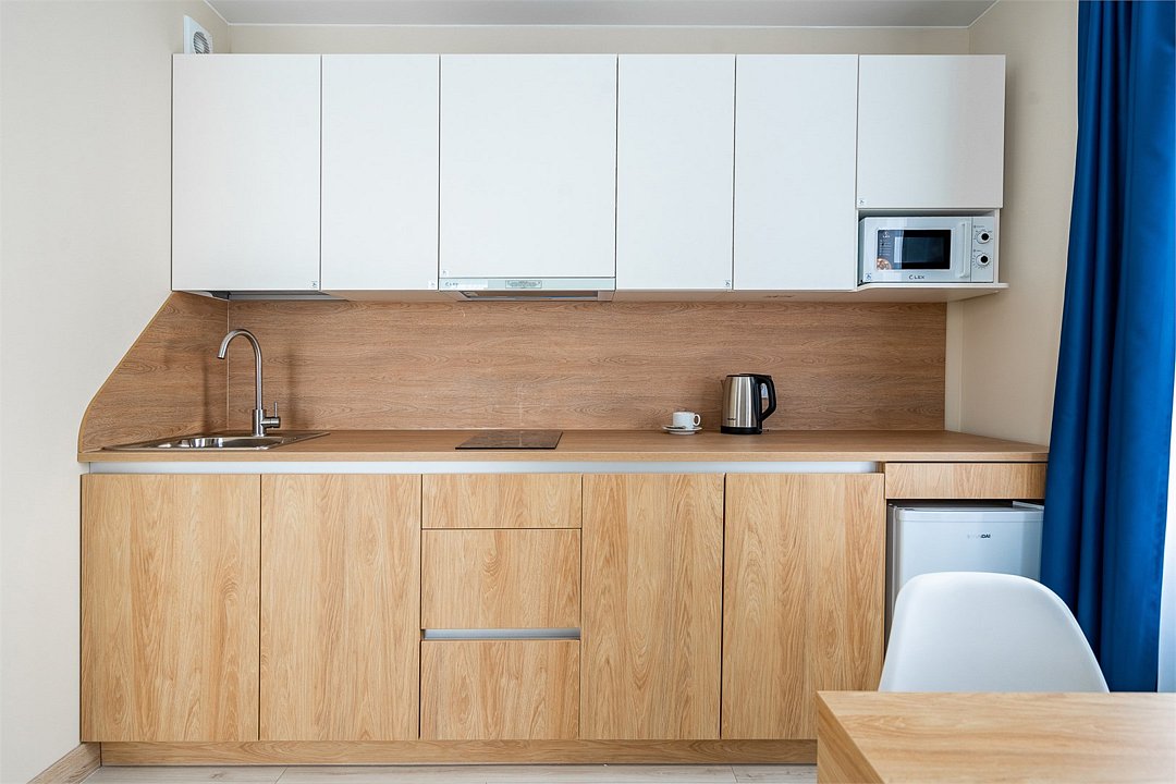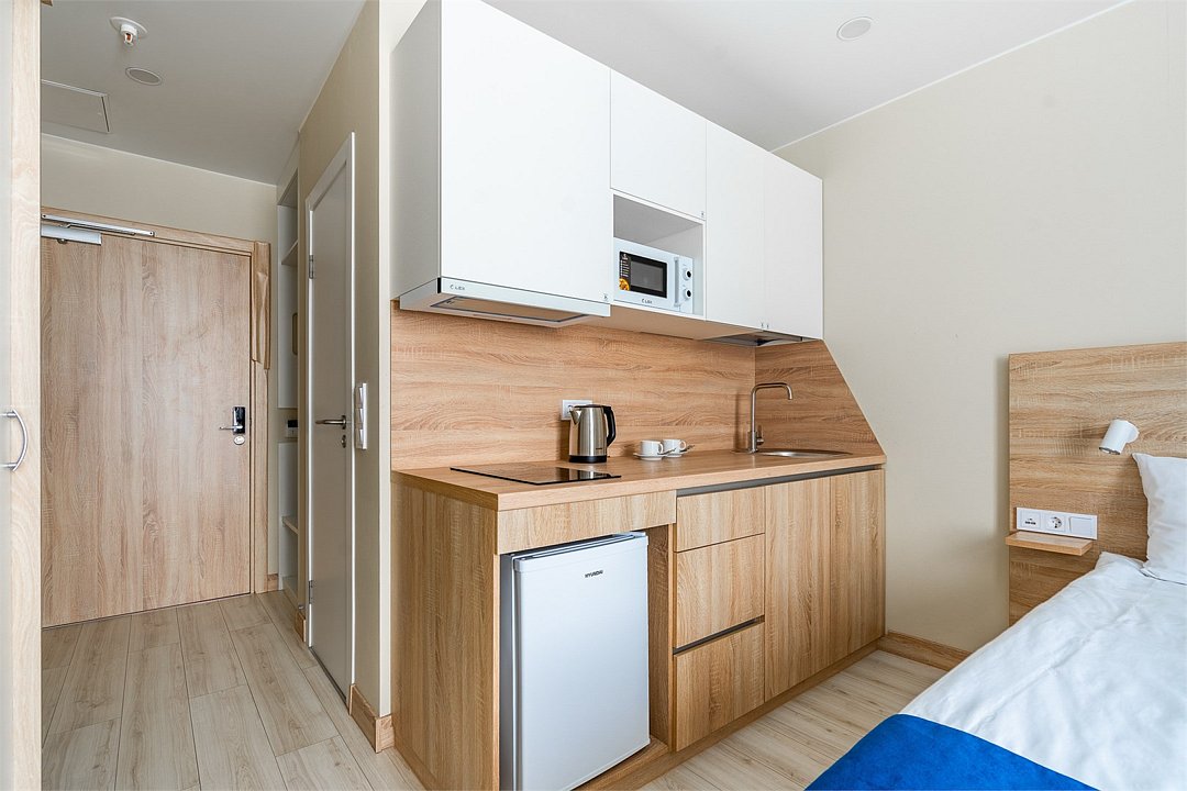 Уютные апартаменты подойдут для размещения одного или двух человек. Номер оборудован двуспальной кроватью-трансформером с ящиками для хранения и кухонной зоной со всей необходимой техникой, посудой и принадлежностями.Услуги и удобства