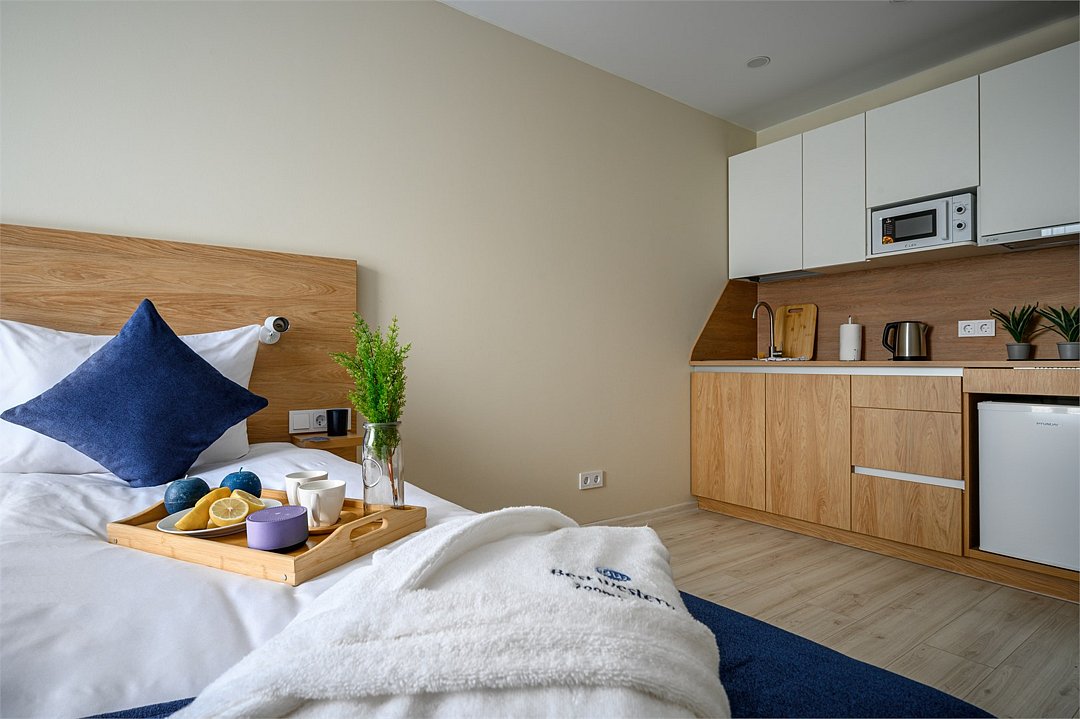 Апартаменты подойдут для размещения двух гостей. Номер оборудован двумя односпальными кроватями, размером 90 х 200 см и кухонной зоной со всей необходимой техникой, посудой и принадлежностями.Услуги и удобства