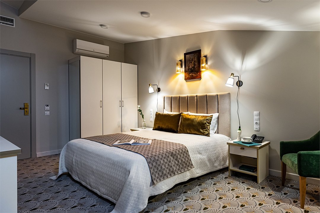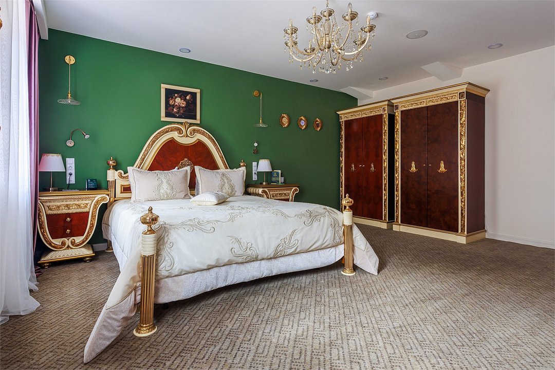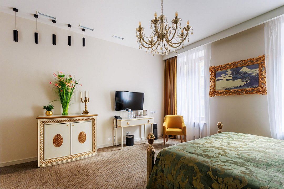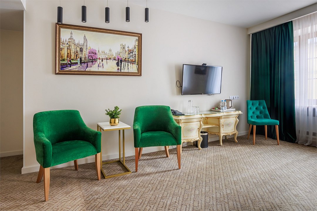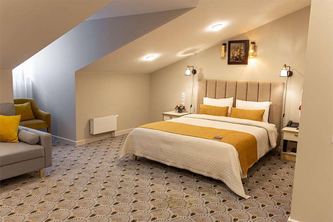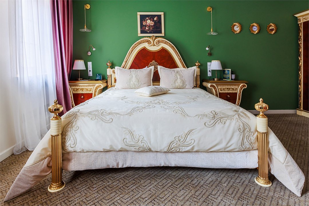 Изысканные и просторные номера для истинных ценителей роскоши. В классическом интерьере великолепного номера гармонично уживаются элементы современного дома. Атмосфера гармонии и уюта – здесь всё способствует беззаботному отдыху.Услуги и удобства