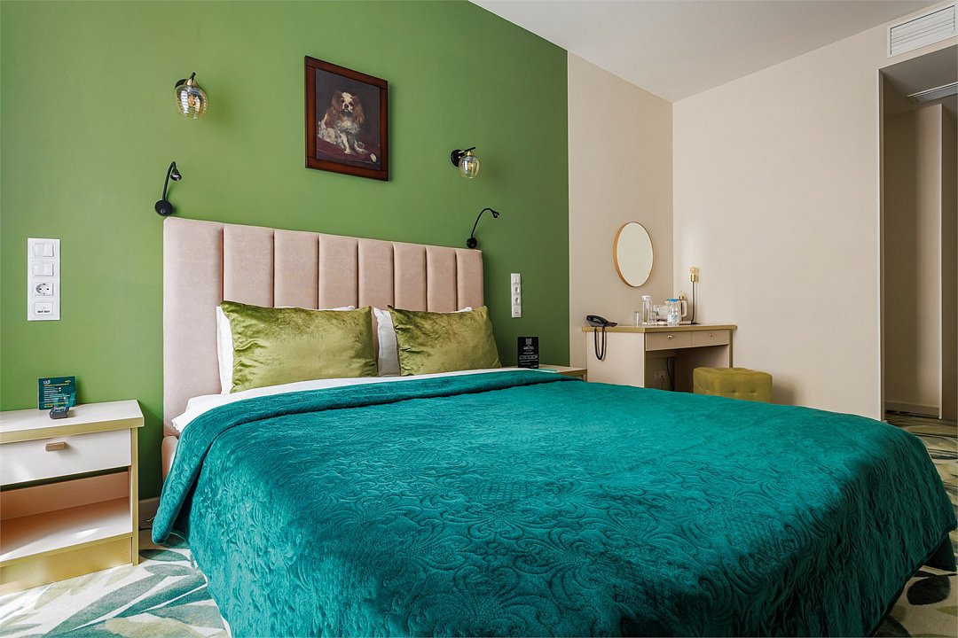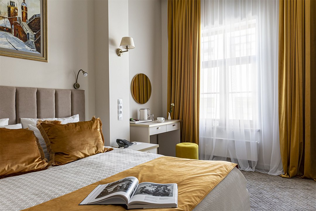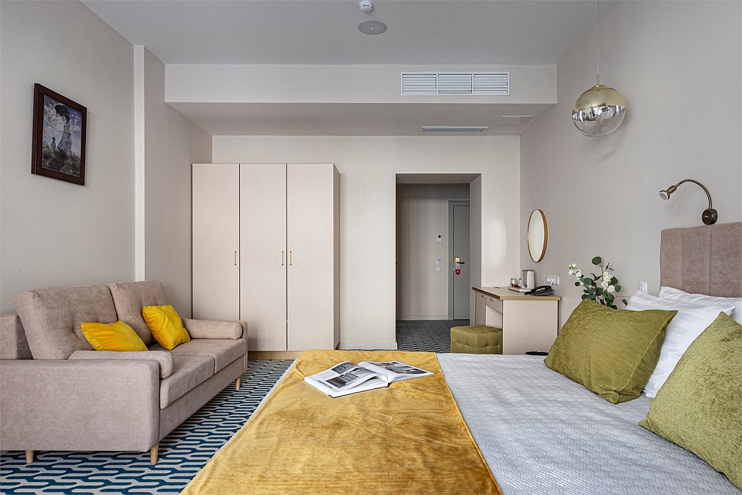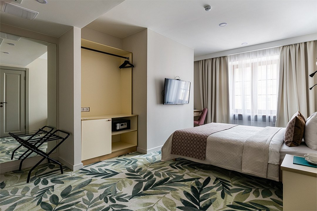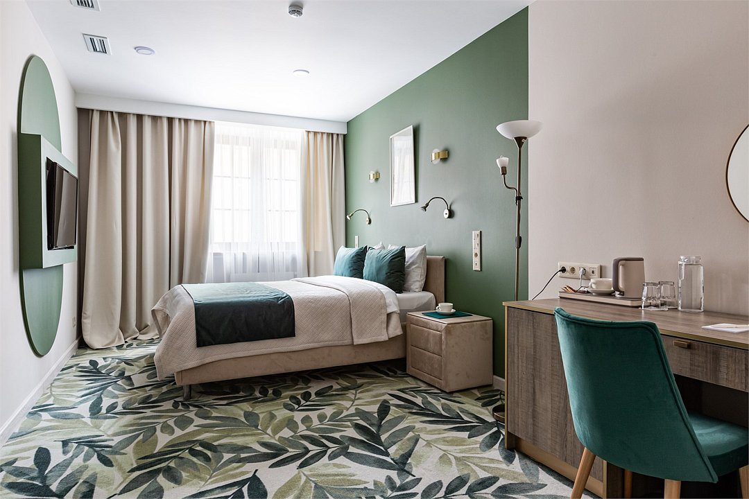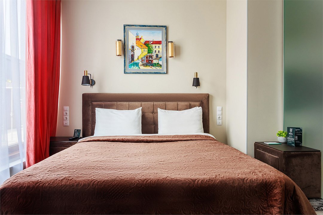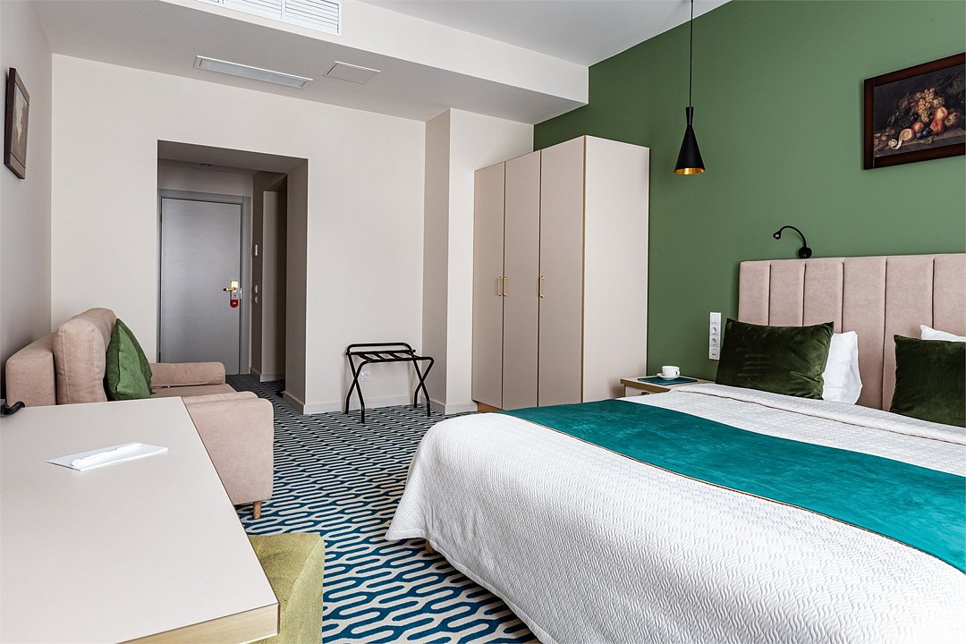 Более просторные и изящные в сравнении с номерами стандартной категории, номера категории Улучшенный стандарт призваны обеспечить качественный комфортный отдых любому гостю. Приятные дизайнерские мелочи, выделяющие этот тип номеров среди остальных, удобства, необходимые для работы и отдыха. В номерах данной категории могут размещаться один или два гостя. В данных номерах установлена 1 двуспальная кровать. В номерах данной категории могут размещаться один или два гостя. В некоторых номерах возможно наличие межкомнатной двери с высоким уровнем шумоизоляции.Услуги и удобства