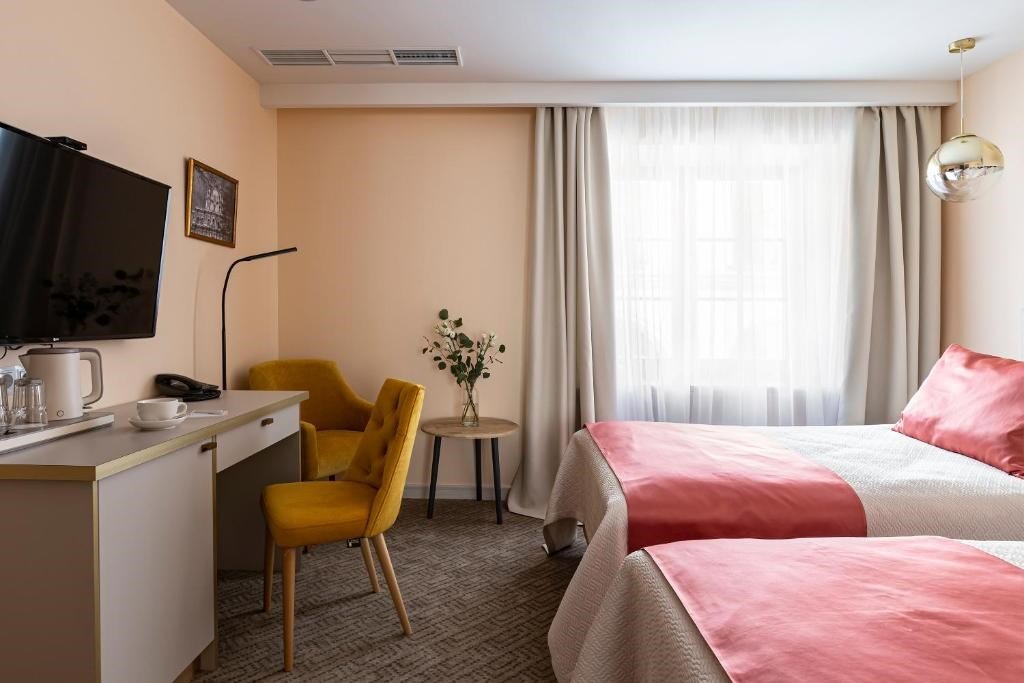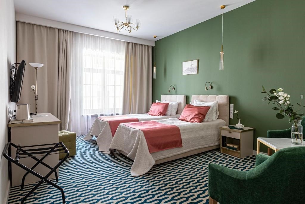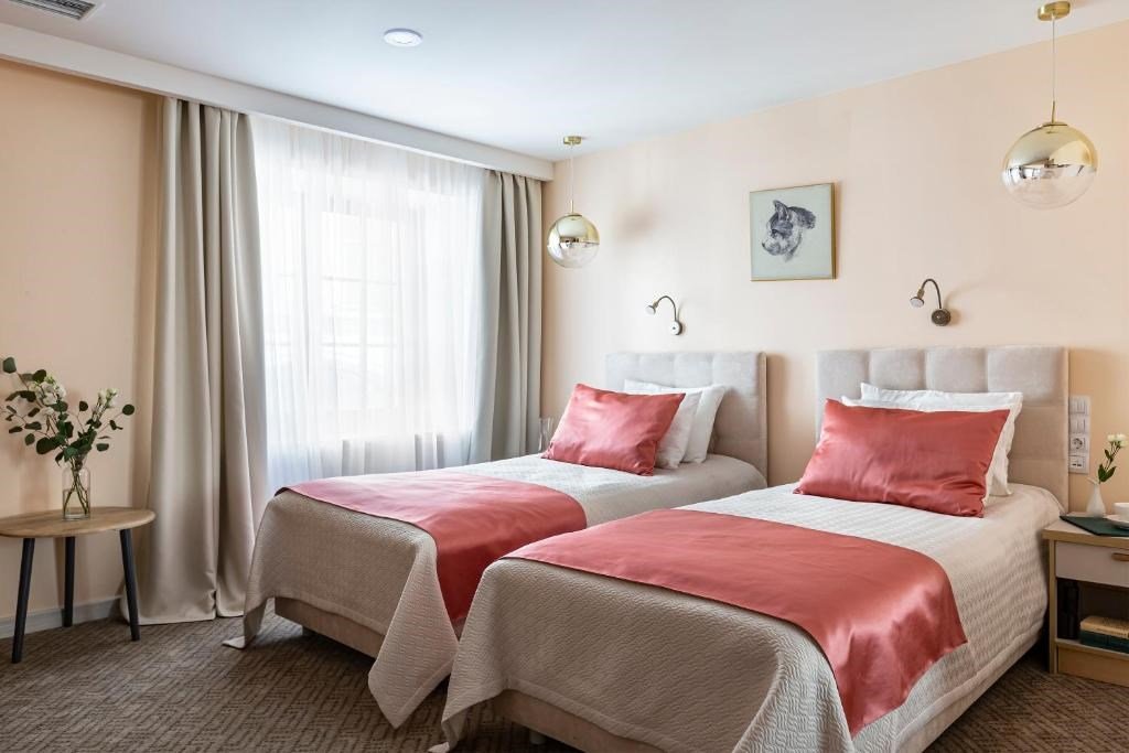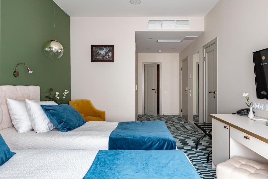 Более просторные и изящные в сравнении с номерами стандартной категории, номера категории Улучшенный стандарт призваны обеспечить качественный комфортный отдых любому гостю. Приятные дизайнерские мелочи, выделяющие этот тип номеров среди остальных, удобства, необходимые для работы и отдыха. В номерах данной категории могут размещаться один или два гостя. В данных номерах установлены 2 односпальные кровати. В некоторых номерах возможно наличие межкомнатной двери с высоким уровнем шумоизоляции.Услуги и удобства