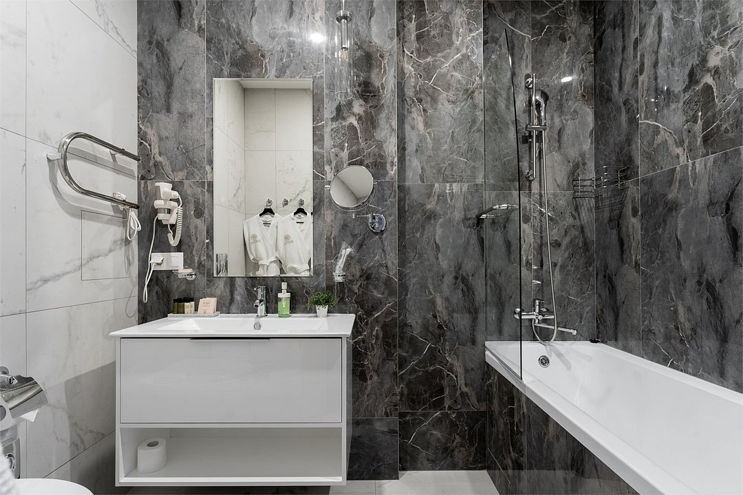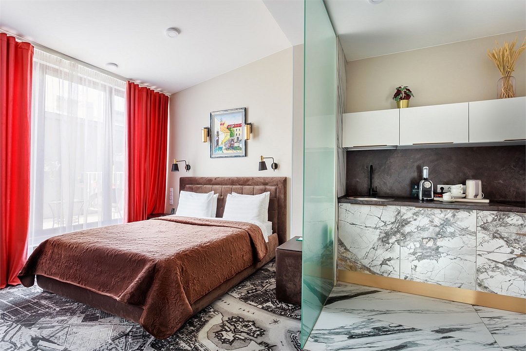 телевизор, кабельное телевидение, Wi-Fi, телефон, кондиционер, светильник, настольные лампы, фен, электронные замки, плита для приготовления пищи, кофемашина, ванная комната, ванна, банные принадлежности, халаты, банные полотенца, тапочки, косметические средства, двуспальная кровать, тумбы, шкаф для одежды, вешалки, зеркало, мини-бар, письменные принадлежности, чайный набор, обслуживание номеров, сейф, унитаз, раковина, обеденная зона, ковровое покрытие, отопление, вид на город, плиточное покрытие, кухонная посуда, кухонная утварь, стол, туалетные средства, цифровое тв, телевизор с плоским экраном, мини-холодильник, кухонный уголок, гостиничная парфюмерия, номер для некурящих, USB-порт, антибактериальное средство для рук, неограниченное посещение СПАВ гостиничном номере