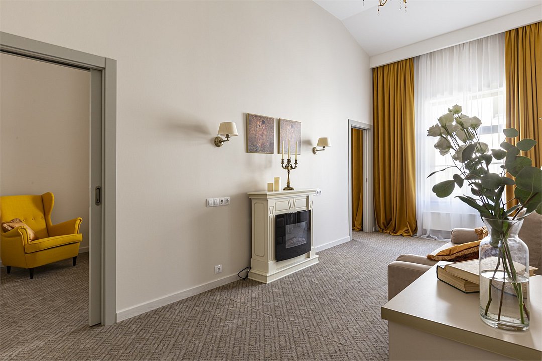 Wi-Fi, телефон, кондиционер, светильник, настольные лампы, система безопасности, электронные замки, кофемашина, ванная комната, ванна, халаты, тапочки, двуспальная кровать, диван, стулья, вешалки, журнальный столик, багажная тумба, зеркало, пуфики, две комнаты, мини-бар, камин, письменные принадлежности, чайный набор, обслуживание номеров, сейф, чайник, раковина, мягкая мебель, косметическое зеркало, гостиная зона, ковровое покрытие, отопление, вид на город, плиточное покрытие, кресло, высокие потолки, столовые приборы, стол, тумба, туалетные средства, туалет, цифровое тв, телевизор с плоским экраном, мини-холодильник, номер для некурящих, антибактериальное средство для рук, неограниченное посещение СПА, средства индивидуальной защитыВ гостиничном номере