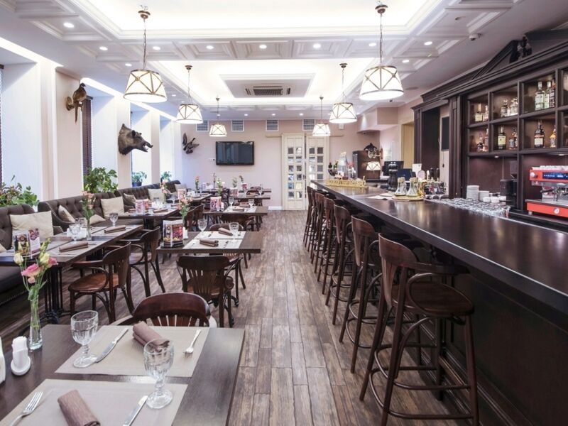 Гостиница приглашает не только постояльцев, но и гостей посетить ресторан «Crazy Hunter». Зал обставлен мебелью из тёмного дерева. Кухня ресторана представлена в нескольких видах меню: гриль, охотничье, европейское, домашний завтрак, бизнес-ланч. Детям придутся по вкусу десерты, выбор которых в меню очень большой. Бар ресторана предлагает широкий ассортимент свежевыжатых соков, минеральной воды, кофе, чая и домашних напитков. В зале ресторана легко организовать банкет или провести другое мероприятие.