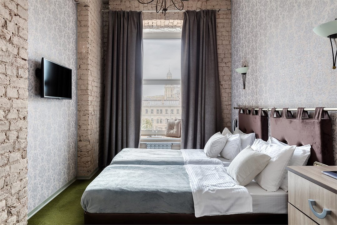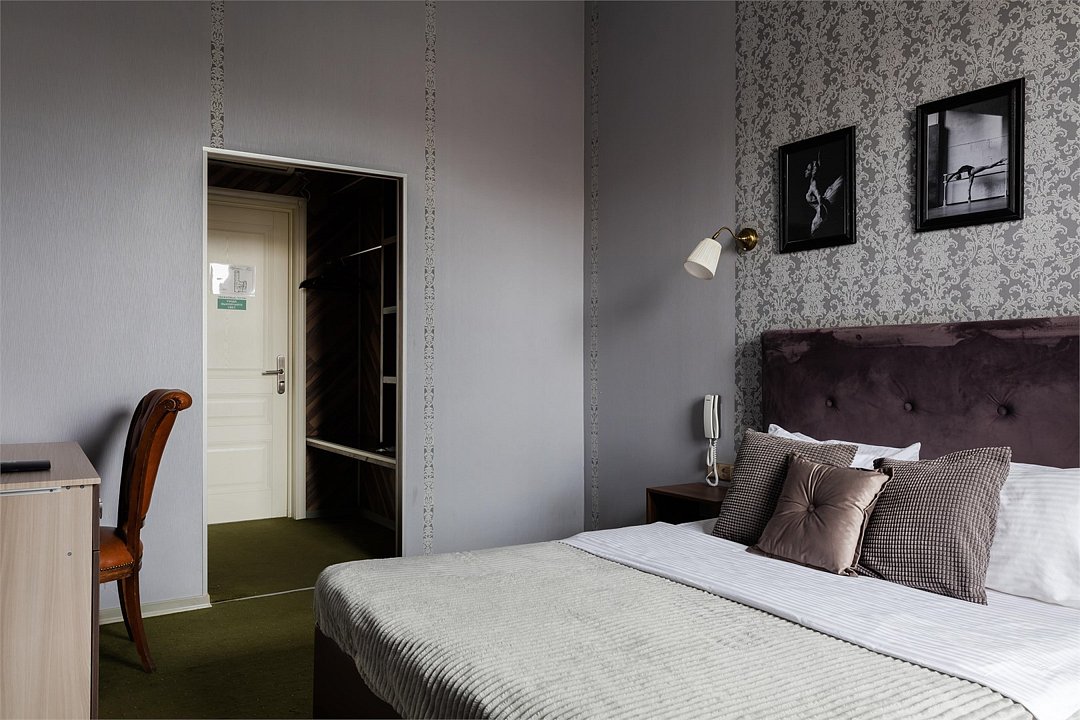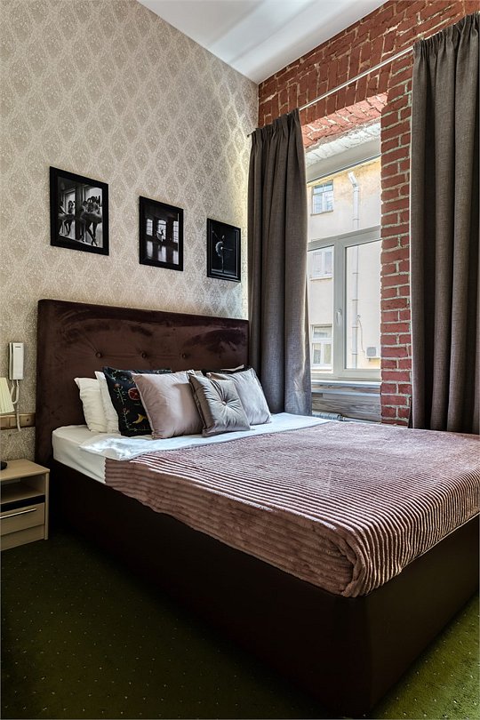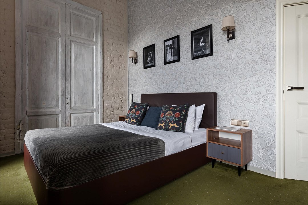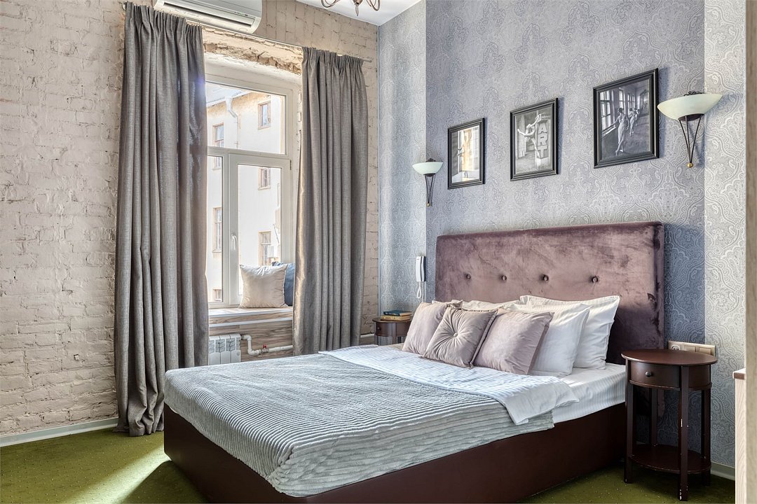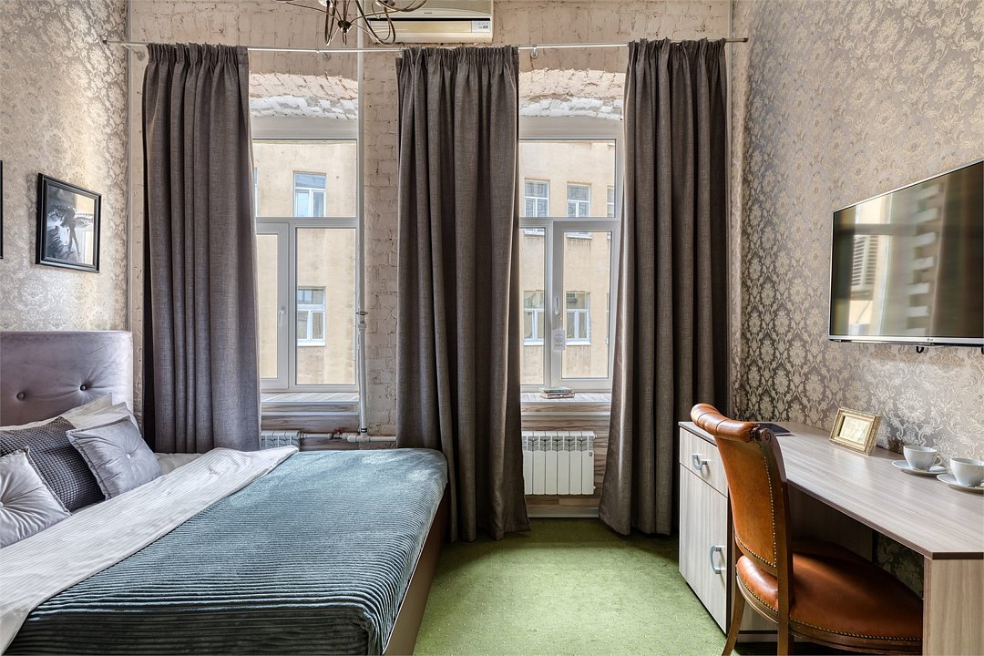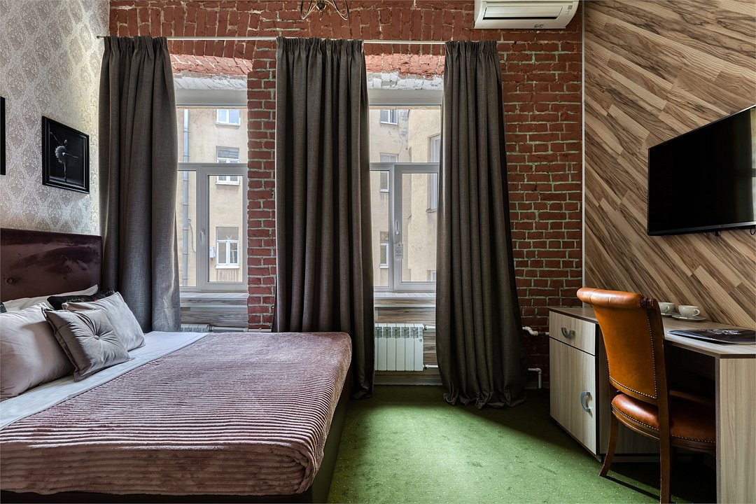 Уютный двухместный номер с одной кроватью размера Queen Size. Из номера выходит вид либо во внутренний двор либо на Фонтанку.Услуги и удобства