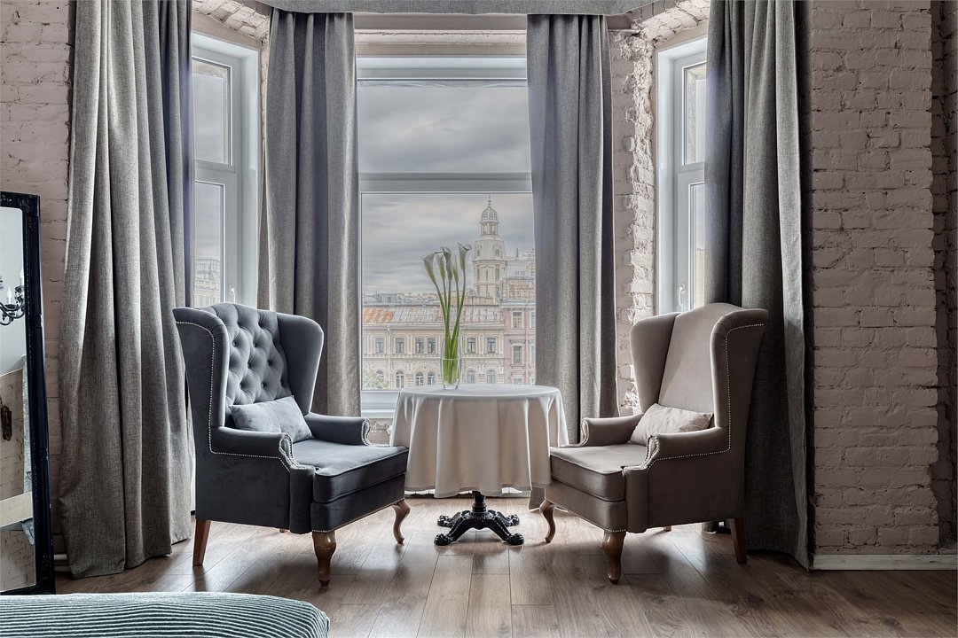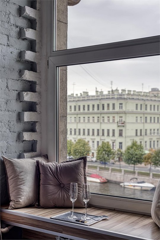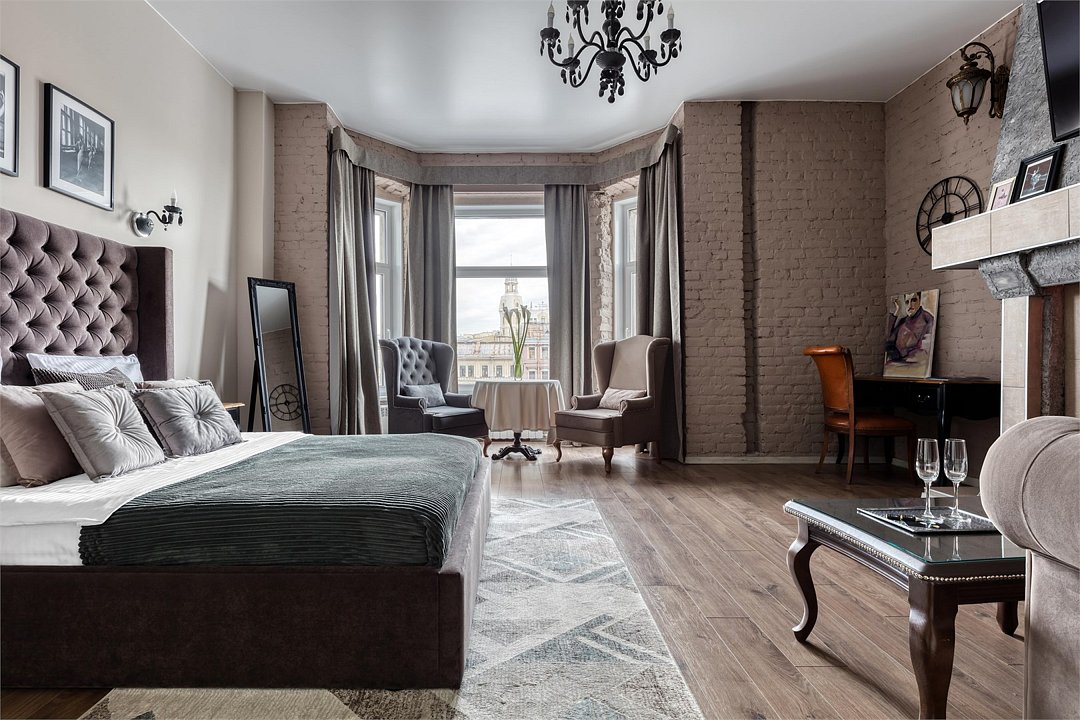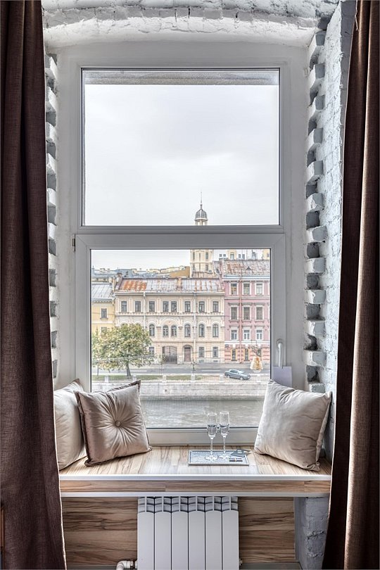 Просторный двухместный номер с одной кроватью размера King Size c видом на реку Фонтанку.Услуги и удобства