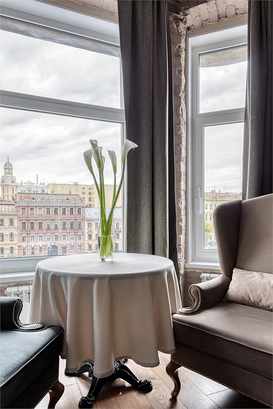 Видовой и просторный двухместный номер с одной кроватью размера King Size и видом на Фонтанку.Услуги и удобства