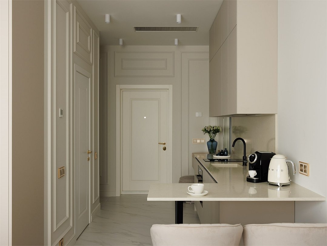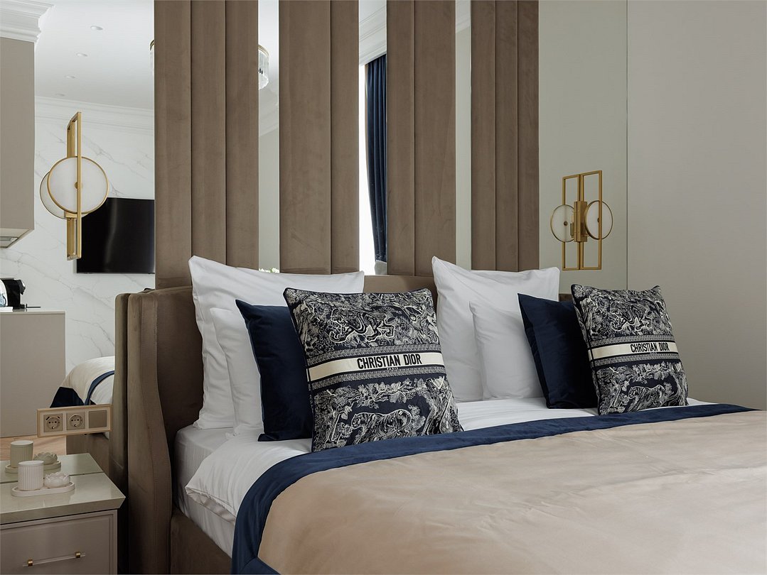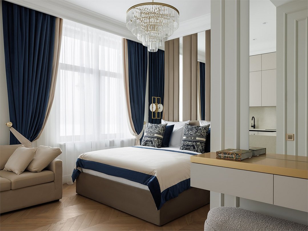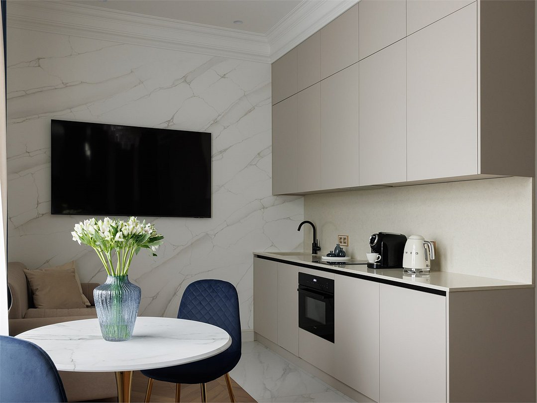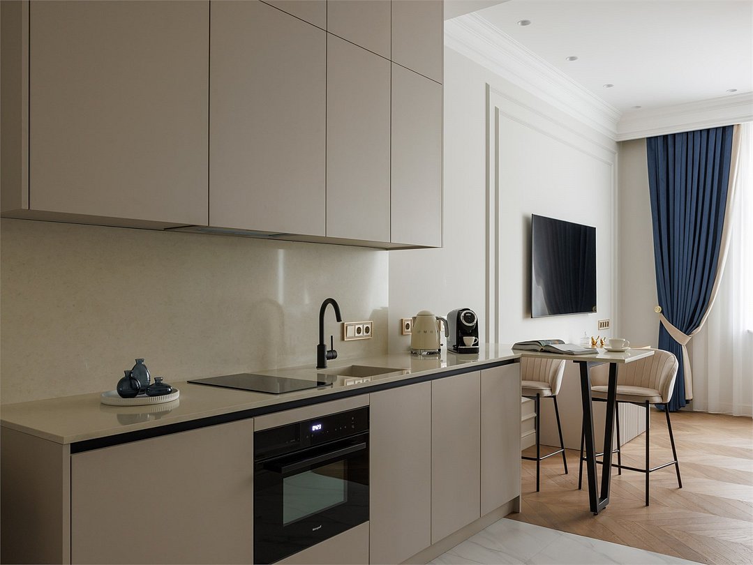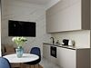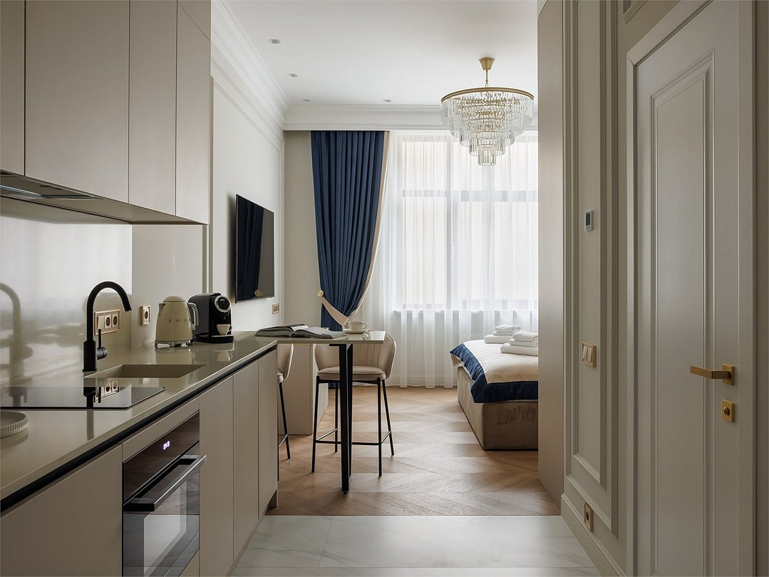 Апартамент-студия объединяет в себе кухню, спальню и прихожую. Санузел совмещенный с ванной. Кухня оборудована, кофемашиной, небольшим холодильником, посудомоечная машина, варочная плита, электрическим чайником, набором посуды. Система кондиционирования. Беспроводной интернет. Кабельное телевидение. Туалетные принадлежности Hermes, фен (Dyson) ,теплый пол.Услуги и удобства