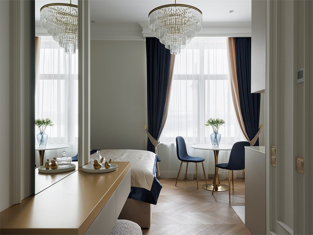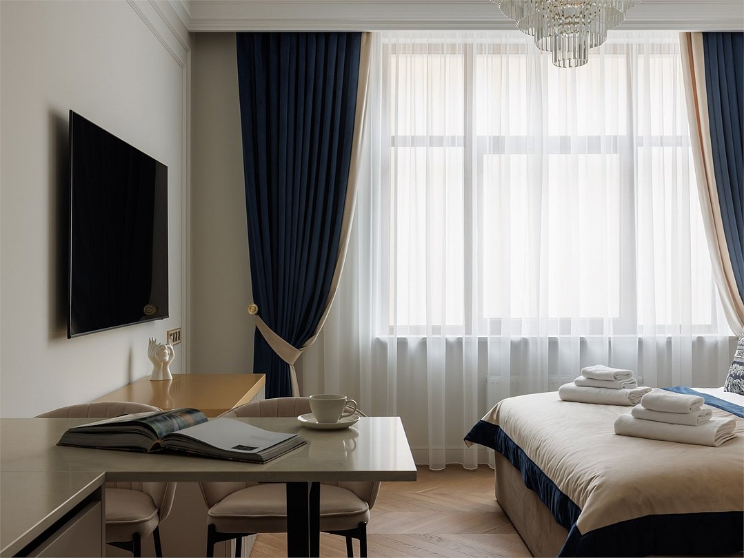 Премиальный апартамент с шикарным видом на реку Неву. Апартамент-студия объединяет в себе кухню с залом, спальню и прихожую. Основной санузел в спальне совмещен с ванной. Кухня оборудована четырёх комфорочной плитой, полноценным холодильником, электрическим чайником, кофе машиной, набором посуды. В номере так же имеется стиральная машина и сушильная машина, фен (Dyson),туалетные принадлежности Hermes. Система кондиционирования. Беспроводной интернет. Кабельное телевидение.Услуги и удобства