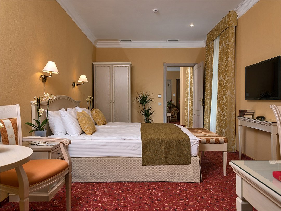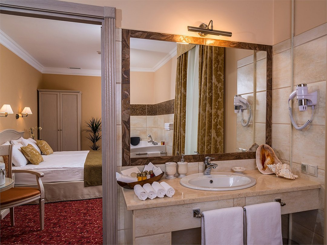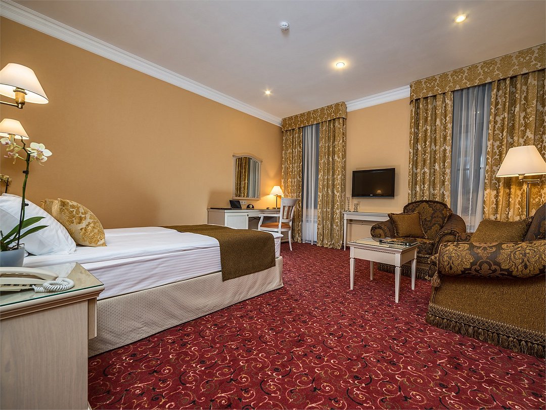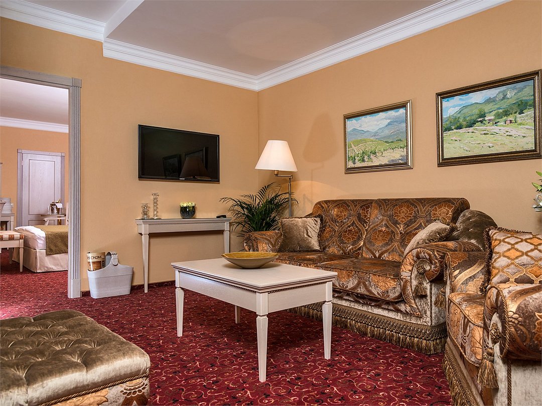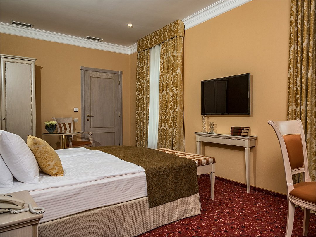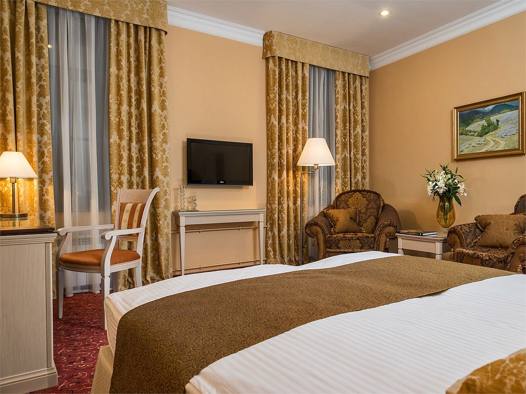 два телевизора, кабельное телевидение, Wi-Fi, интернет, фен, ванная комната, душевая кабина, ванная с джакузи, гидромассажный душ, биде, теплый пол, банные полотенца, тапочки, двуспальная кровать, ортопедический матрас, диван, тумбы, стулья, письменный стол, обеденный стол, багажная тумба, зеркало, эксклюзивная мебель, мебельный гарнитур, две комнаты, обслуживание номеров, унитаз, мягкая мебель, ковровое покрытие, душ, кулер на этаже, кресло, вид во двор, тумба, туалет, диван-кровать, внутренний телефон, телевизор с плоским экраном, мини-холодильник, гостиничная парфюмерия, номер для некурящих, пуфикВ номере