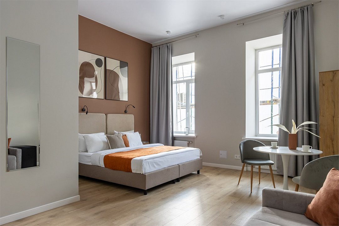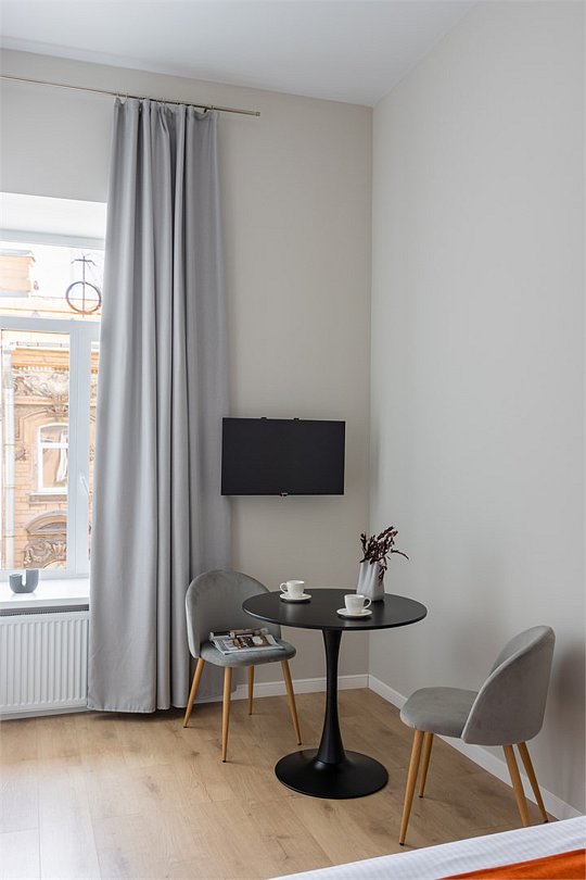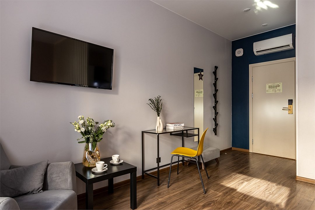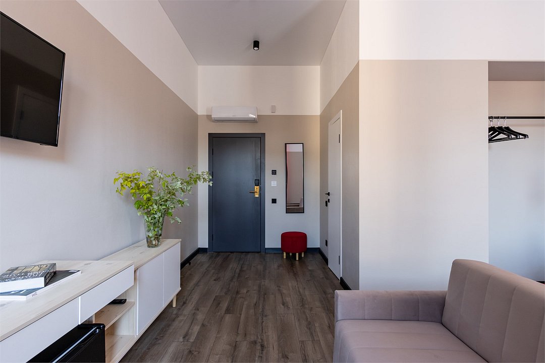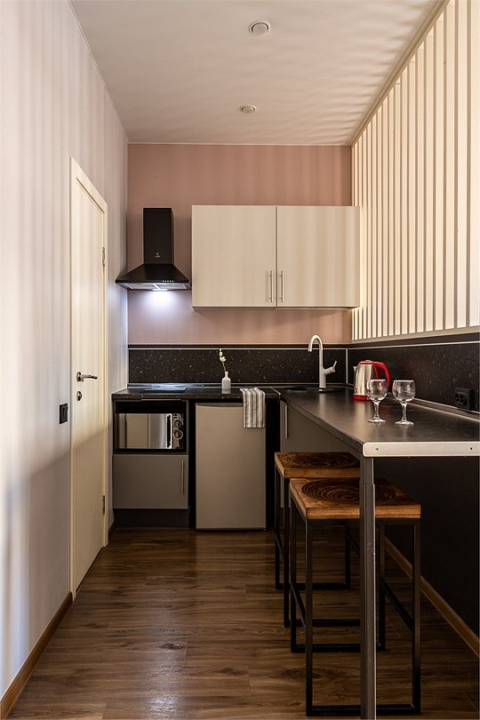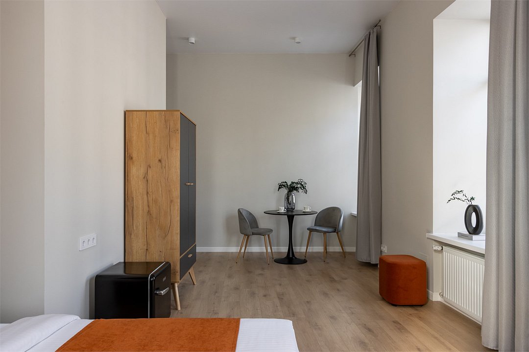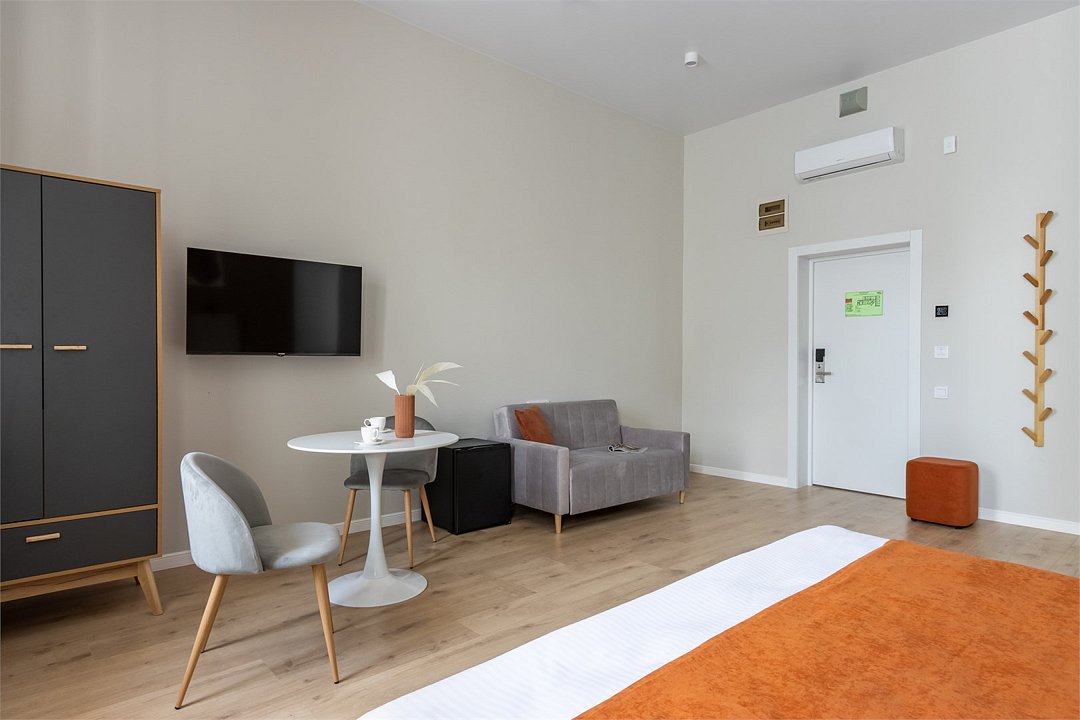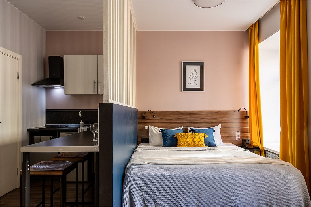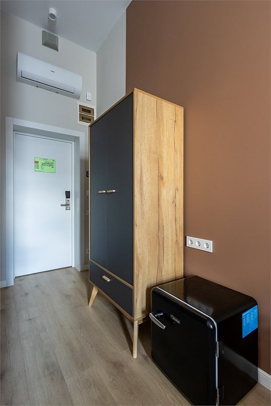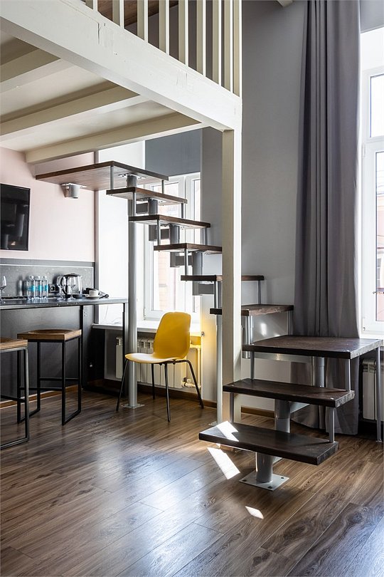 Звукоизолированный номер-студио с мини-кухней и кондиционером. В собственной ванной комнате: • Душ • Фен • Бесплатные туалетно-косметические принадлежности • Тапочки • Полотенца Вид: • Вид на город • Вид во внутренний дворик Удобства апартаментов: • Мини-кухня • Холодильник • Плита • Микроволновая печь • Кухонные принадлежности • Кондиционер • Телефон • Отопление • Деревянный или паркетный пол • Звукоизоляция • Услуга «звонок-будильник» • Москитная сетка • Шкаф или гардероб • Белье • Лестница для доступа к верхним этажам • Вешалка для одежды Бесплатный Wi-Fi! Курение: запрещеноУслуги и удобства